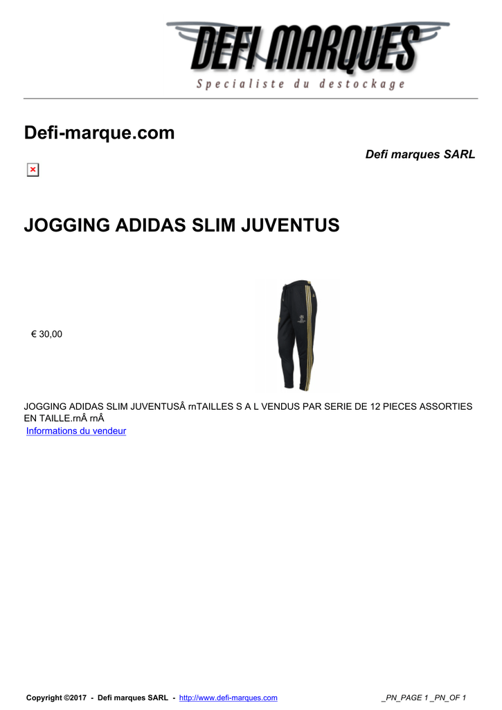 Defi-marque.com Defi marques SARL JOGGING ADIDAS SLIM JUVENTUS € 30,00 JOGGING ADIDAS SLIM JUVENTUS rnTAILLES S A L VENDUS PAR SERIE DE 12 PIECES ASSORTIES EN TAILLE.rn rn Informations du vendeur Copyright ©2017 - Defi marques SARL - http://www.defi-marques.com _PN_PAGE 1 _PN_OF 1