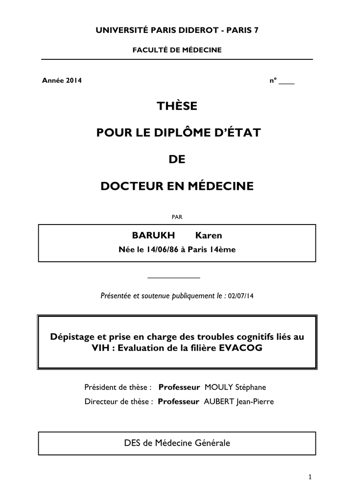 UNIVERSITÉ PARIS DIDEROT - PARIS 7 FACULTÉ DE MÉDECINE Année 2014 n° ____ THÈSE POUR LE DIPLÔME D’ÉTAT DE DOCTEUR EN MÉDECINE PAR BARUKH Karen Née le 14/06/86 à Paris 14ème Présentée et soutenue publiquement le : 02/07/14 Dépistage et prise en charge des troubles cognitifs liés au VIH : Evaluation de la filière EVACOG Président de thèse : Professeur MOULY Stéphane Directeur de thèse : Professeur AUBERT Jean-Pierre DES de Médecine Générale 1 Remerciements Au Professeur Mouly, Pour avoir accepté de présider cette thèse. Au Professeur Bergmann, Pour avoir accepté de faire partie de mon jury. Au Docteur Aubert, Pour avoir accepté d’être mon directeur de thèse, mon tuteur, mon enseignant de l’externat à l’internat, pour avoir eu le courage de me supporter toutes ces années, pour avoir corrigé mes traces et pour m’avoir formée à l’écriture et à l’utilisation de word avec beaucoup de patience et d’humour, pour m’avoir toujours rassurée et encouragée. Merci vraiment pour tout, je vous dois beaucoup, ce fut vraiment un plaisir de travailler avec vous. Aux chefs et enseignants croisés sur le chemin de l’externat et de l’internat, pour votre implication dans ma formation. J’ai une pensée tout particulière à Eva, ma premiere chef en médecine interne à St Louis qui m’a fait découvrir la sémiologie lors de ma P2. Merci à tous les chefs de Jossigny (Xavier, Jerem, Souad, Gerault, Christophe, Karim, les 2 Philippe, cathy, Sylvie, George, Nico, Seb, Hichem, Stéphane) qui m’ont fait adorer les urgences et ceux de Lariboisière (Jen, Jo, Myriam, Nico, Cécile, Sophie, Bertrand) qui m’ont confortée dans ce que j’aimais, qui m’ont apportée beaucoup de choses. Merci aux chefs de la Réanimation des brûlés à St Louis et au Dr Cerf qui m’a fait découvrir la médecine générale. A Claire Paquet, pour son aide précieuse et sa disponibilité. A mes co-internes et infirmier(e)s pour tous ces moments, faciles et moins faciles, partagés, et tout spécialement à Natacha et Anais, vous êtes désormais des amies et pas n’importe lesquelles… Petite pensée également pour Idriss, Morgane, Valentin, Fanta, Elodie, Keren, Medhi, Benjamin, Charlotte, Quentin, Frédéric et Harry pour tous leurs conseils et rigolades. A tous ces artistes qui m’ont permis de relâcher mon stress grâce à leur musique. A mes amis et à mes voisins pour avoir été là pendant toutes ces années. Un profond merci à Daniel, Laura, Chloe, Johanna, Elinore J., Aurélie, Daphnée, Liate, Meg, Jo S., Léa, Ro, Yo, David, Helena, Ilan, Rémi, Théo, Isa, Astrée, Jess, Eva, Emma et Louise. Je ne peux pas vous citer tous mais j’ai une pensée pour chacun. A Stéphanie ou Keren pour les intimes, pour m’avoir aidée et soutenue. A Banita, qui sans le savoir m’a fait découvrir ma passion pour la médecine. A mes parents Michèle et Erick pour avoir toujours cru en moi, avoir toujours été là et avoir toujours su me conseiller, à mon frère Laurent pour me faire toujours voir la vie du bon côté, pour son indéfectible présence et sa compréhension à toute épreuve, à ma grand-mère Denise, pour tout son amour, à mon grand-père, Léon qui n’est plus là mais qui pourtant m’accompagne à chaque instant, et un grand merci à ma sœur Sarah, pour sa relecture, sa clairevoyance et ses attentions de chaque jour. A mon oncle Fabien pour sa gentillesse et sa disponibilité et à ma tante Joelle et mes cousins pour leurs encouragements. Je dois beaucoup à chacun d’entre vous et très sincèrement je vous en remercie. 2 Liste des abréviations: VIH : virus immunodéficience humaine SIDA : syndrome immunodéficience acquise PVVIH : personnes vivant avec le VIH SNC : système neurologique central HAND : HIV associated neurocognitive disorder LCR : liquide céphalorachidien HNRC : HIV Neurobehavioral Research Center ANI : Asymptomatic Neurocognitive Impairment MND: Minor Neurocognitive Disorder HAD : HIV associated dementia ARV : anti-rétroviraux HAART : Highly Active Antiretroviral Therapy SLA : sclérose latérale amyotrophique BHE : barrière hémato-encéphalique CMV : cytomégalovirus VZV : varicella zoster virus AVC : accident vasculaire cérébral LEMP : leucoencéphalopathie multifocale progressive TNC : Troubles neurocognitifs VHC : virus hépatite C CD4 : cluster de différentiation 4 HTA : hypertension artérielle BMI : body mass index HDS : HIV Dementia Scale MoCA : Montreal Cognitive Assessment IRM : Imagerie par résonnance magnétique CPE : CNS (central nervous system) Penetration Effectiveness IADL4 : Instrumental Activities of Daily Living BREF : Batterie rapide d'efficience frontale MMS : Mini Mental State examination IHDS : International HIV Dementia Scale VPN : valeur prédictive négative VPP : valeur prédictive positive NPZ- 8 : neuropsychologic z score for 8 tests DTI : diffusion tensor imaging 3 Contenu Résumé:............................................................................. Erreur ! Signet non défini. 1. Introduction .............................................................................................................. 8 2. Les troubles cognitifs du sujet VIH........................................................................... 9 a. Prévalence ......................................................................................................... 9 b. Etiologie, mécanismes ..................................................................................... 13 c. Cofacteurs ........................................................................................................ 14 e. Prise en charge ................................................................................................ 18 3. Position du problème ............................................................................................. 21 a. Le dépistage est-il légitime ? ..................................