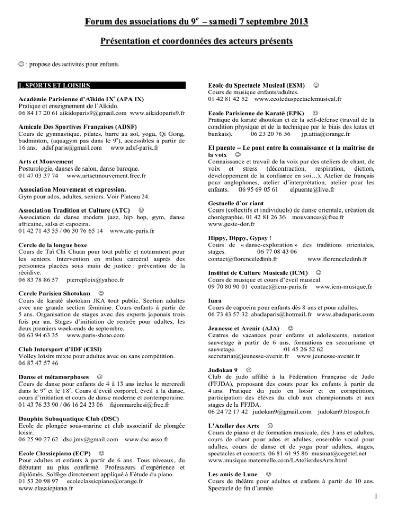 Forum des associations du 9e – samedi 7 septembre 2013 Présentation et coordonnées des acteurs présents ☺ : propose des activités pour enfants 1. SPORTS ET LOISIRS Académie Parisienne d’Aïkido IXe (APA IX) Pratique et enseignement de l’Aïkido. 06 84 17 20 61 [email protected] www.aikidoparis9.fr Amicale Des Sportives Françaises (ADSF) Cours de gymnastique, pilates, barre au sol, yoga, Qi Gong, badminton, (aquagym pas dans le 9e), accessibles à partir de 16 ans. [email protected] www.adsf-paris.fr Arts et Mouvement Posturologie, danses de salon, danse baroque. 01 47 03 37 74 www.artsetmouvement.free.fr Association Mouvement et expression. Gym pour ados, adultes, seniors. Voir Plateau 24. Association Tradition et Culture (ATC) ☺ Association de danse modern jazz, hip hop, gym, danse africaine, salsa et capoeira. 01 42 71 43 55 / 06 30 76 65 14 www.atc-paris.fr Cercle de la longue boxe Cours de Taï Chi Chuan pour tout public et notamment pour les seniors. Intervention en milieu carcéral auprès des personnes placées sous main de justice : prévention de la récidive. 06 83 78 86 57 [email protected] Cercle Parisien Shotokan ☺ Cours de karaté shotokan JKA tout public. Section adultes avec une grande section féminine. Cours enfants à partir de 5 ans. Organisation de stages avec des experts japonais trois fois par an. Stages d’initiation de rentrée pour adultes, les deux premiers week-ends de septembre. 06 63 94 63 35 www.paris-shoto.com Club Intersport d’IDF (CISI) Volley loisirs mixte pour adultes avec ou sans compétition. 06 87 47 57 46 Danse et métamorphoses ☺ Cours de danse pour enfants de 4 à 13 ans inclus le mercredi dans le 9e et le 18e. Cours d’éveil corporel, éveil à la danse, cours d’initiation et cours de danse moderne et contemporaine. 01 43 76 33 90 / 06 16 24 23 06 [email protected] Dauphin Subaquatique Club (DSC) Ecole de plongée sous-marine et club associatif de plongée loisir. 06 25 90 27 62 [email protected] www.dsc.asso.fr Ecole Classicpiano (ECP) ☺ Pour adultes et enfants à partir de 6 ans. Tous niveaux, du débutant au plus confirmé. Professeurs d’expérience et diplômés. Solfège directement appliqué à l’étude du piano. 01 53 20 98 97 [email protected] www.classicpiano.fr Ecole du Spectacle Musical (ESM) ☺ Cours de musique enfants/adultes. 01 42 81 42 52 www.ecoleduspectaclemusical.fr Ecole Parisienne de Karaté (EPK) ☺ Pratique du karaté shotokan et de la self-défense (travail de la condition physique et de la technique par le biais des katas et bunkais). 06 23 20 76 56 [email protected] El puente – Le pont entre la connaissance et la maîtrise de la voix ☺ Connaissance et travail de la voix par des ateliers de chant, de voix et stress (décontraction, respiration, diction, développement de la confiance en soi…). Atelier de français pour anglophones, atelier d’interprétation, atelier pour les enfants. 06 95 69 05 61 [email protected] Gestuelle d’or riant Cours (collectifs et individuels) de danse orientale, création de chorégraphie. 01 42 81 26 36 [email protected] www.geste-dor.fr Hippy, Dippy, Gypsy ! Cours de « danse-exploration » des traditions orientales, stages. 06 77 08 43 06 [email protected] www.florenceledinh.fr Institut de Culture Musicale (ICM) ☺ Cours de musique et cours d’éveil musical. 09 70 80 90 01 [email protected] www.icm-musique.fr Iuna Cours de capoeira pour enfants dès 8 ans et pour adultes. 06 73 43 57 32 [email protected] www.abadaparis.com Jeunesse et Avenir (AJA) ☺ Centres de vacances pour enfants et adolescents, natation sauvetage à partir de 6 ans, formations en secourisme et sauvetage. 01 45 26 52 62 [email protected] www.jeunesse-avenir.fr Judokan 9 ☺ Club de judo affilié à la Fédération Française de Judo (FFJDA), proposant des cours pour les enfants à partir de 4 ans. Pratique du judo en loisir et en compétition, participation des élèves du club aux championnats et aux stages de la FFJDA. 06 24 72 17 42 [email protected] judokan9.blospot.fr L’Atelier des Arts ☺ Cours de piano et de formation musicale, dès 3 ans et adultes, cours de chant pour ados et adultes, ensemble vocal pour adultes, cours de danse et de yoga pour adultes, stages, spectacles et concerts. 06 81 61 95 86 [email protected] www.musique maternelle.com/LAtelierdesArts.html Les amis de Lune ☺ Cours de théâtre pour adultes et enfants à partir de 10 ans. Spectacle de fin d’année. 1 06 72 58 41 72 [email protected] www.habval75.wix.com/theatre-a-montmartre Le studio de Léa ☺ Cours de danse et activités de bien-être. Public enfants : jazz, contemporain et orientale ; adolescents : orientale, jazz, contemporain, street jazz, hip hop, raggaeton ; adultes : jazz, orientale, salsa, samba, afrovibe, danses de salon, rock, street jazz, hip hop, raggaeton, zumba, barre au sol et pilates. 06 49 98 26 53 [email protected] forme 48. 01 45 30 52 58 [email protected] Yoganjali Cours collectifs de yoga tous niveaux, destinés aux adultes. 06 79 26 13 17 [email protected] yoganjali-association.blogspot.fr Voir aussi la partie Associations diverses avec animations. 2. CULTURE ET PATRIMOINE Niakate Boulla Ballers (ASNB-ballers) ☺ Basket-ball pour les enfants de 8 à 17 ans, basket école. Les seniors filles et garçons de 18 ans et plus. La musculation pour les seniors filles et garçons. 06 15 59 59 34 [email protected] www.asnbballers.com Nature Rythme et Gymnastique 2000 (NRGY 2000) Pratique du stretching postural. 06 76 77 16 09 [email protected] www.nrgy2000.org Office du Mouvement Sportif du 9e (OMS) Promouvoir l’activité sportive de toute nature dans le 9e arrondissement. 06 25 90 27 62 [email protected] Paris danse club (PDC) Danse de salon, de société, danses latines. Cours de rock, valse, tango, salsa, pour débutants, intermédiaires, avancés. Stages, soirées dansantes. Professeur qualifié. 01 39 74 05 79 [email protected] www.danseaufrere.fr Passage Contemp