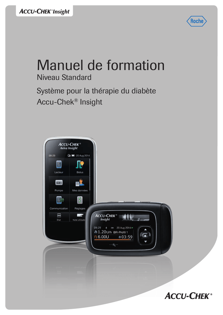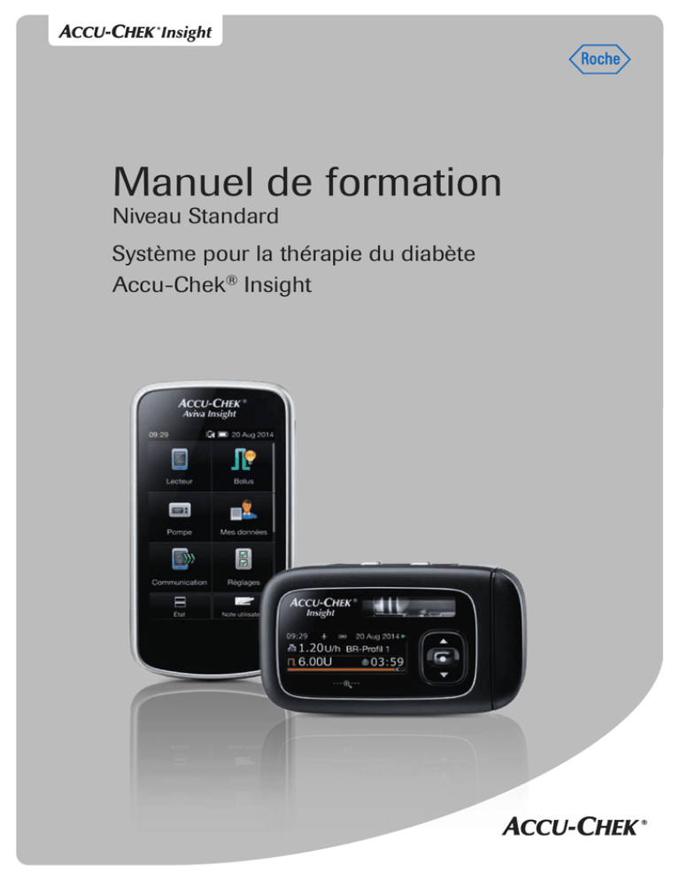 Manuel de formation Niveau Standard Système pour la thérapie du diabète Accu-Chek® Insight Lecteur Cher Formateur, cher Utilisateur, 1 2 1 Déballez les composants: 3 4 Standard ! Pour assurer des performances optimales de votre nouvelle télécommande de gestion du diabète Accu-Chek® Insight pendant la formation, il est hautement recommandé de charger la batterie avant de commencer la formation. 1 Lecteur 2 Adaptateur secteur 3 Prise mâle adaptée à votre pays 4 Câble USB 2 Retournez le lecteur et enlever la bandelette de protection de la batterie. 3 Insérez I’extrémité appropriée du câble USB dans le lecteur. 4 Enlevez le couvercle de protection de I’adaptateur. 3 5 Fixez la prise mâle appropriée sur I’adaptateur. 6 Insérez I’autre extrémité du câble USB dans I’adaptateur. Ne pas connecter à un PC pour la charge initiale car celle-ci durerait plus longtemps. 7 Branchez la prise mâle dans la prise murale. Remarque jjAprès environ 30 minutes, vous pouvez débrancher le lecteur de la prise murale et continuer la formation comme décrit dans ce manuel (Démarrage : chapitre 5, page 63). jjA la fin de la formation, continuez la charge du lecteur jusqu’à la charge complète de la batterie. 4 Cher utilisateur du système pour la thérapie du diabète Accu-Chek® Insight Ce guide d’utilisation s’adresse à vous, en tant que personne atteinte de diabète, et aux professionnels de la santé. Il est organisé en Manuel de formation Standard et en Manuel de formation Avancé. Le Manuel de formation Standard contient toutes les informations dont vous avez besoin pour commencer à utiliser le système pour la thérapie du diabète Accu-Chek® Insight. Le Manuel de formation Avancé contient les informations relatives à toutes les fonctions et caractéristiques facultatives qui facilitent votre vie avec une pompe, qui la rendent plus agréable et assurent une utilisation couronnée de succès. Indépendamment de votre niveau d’expérience de la thérapie par pompe, veuillez également consulter le Manuel d’utilisation de la pompe à insuline Accu-Chek® Insight et le Manuel d’utilisation de la télécommande de gestion du diabète Accu-Chek® Insight avant d’utiliser votre pompe. Votre pompe à insuline Accu-Chek® Insight a été développée exclusivement pour I’administration continue d’insuline 100U à durée d’action rapide ou analogue à durée d’action ultrarapide. Le type d’insuline exact à utiliser pour le traitement de votre diabète sucré insulinodépendant doit être prescrit par votre professionnel de santé. C’est au professionnel de santé qui vous suit de décider si un traitement par pompe à insuline est adapté à votre situation. N’utilisez pas la pompe à insuline avant d’avoir reçu la formation nécessaire requise. N’utilisez jamais la pompe à insuline pour l’administration de médicaments autres que de I’insuline 100U à durée d’action rapide ou analogue à durée d’action ultrarapide. 5 6 À propos de ce manuel d’utilisation Afin de garantir une utilisation sûre et appropriée de votre pompe à insuline Accu-Chek Insight, ce Manuel contient les caractéristiques suivantes pour une navigation simple et rapide: jjVotre pompe à insuline Accu-Chek® Insight sera également appelée "pompe". jjVotre télécommande de gestion du diabète Accu-Chek® Insight sera également appelée "lecteur". jjLa glycémie sera abrégée en bG. Remarque Une Remarque contient des informations importantes pour une utilisation efficace et confortable de votre système de gestion du diabète Accu-Chek® Insight. Exemple Un exemple vous montre comment une caractéristique pourrait être utilisée dans une situation du quotidien. Nous vous rappelons que les informations médicales ou thérapeutiques ne sont indiquées que dans le but d’illustrer les exemples. Il s’agit d’informations tout à fait fortuites ne correspondant pas à vos besoins médicaux personnels. Adressez-vous toujours à des professionnels de santé pour discuter de vos propres besoins thérapeutiques. 7 8 Table des matières 1Préparations............................................................................................................. 13 1.1 Insertion d’un dispositif de perfusion.................................................. 13 1.2 Remplir la cartouche.................................................................................. 16 2 Fonctions de la pompe........................................................................................ 21 2.1 Navigation dans les menus...................................................................... 27 3 Mise en marche de la pompe........................................................................... 35 3.1 Insertion de la pile....................................................................................... 35 3.2 Insertion d’une nouvelle cartouche...................................................... 43 3.3 Remplissage de la tubulure et de la canule du dispositif de perfusion......................................................................... 48 4 Fonctions du lecteur............................................................................................. 53 4.1 Votre lecteur en un coup d’œil............................................................... 55 4.2 Comprendre I’écran.................................................................................... 56 5 Première mise en route de votre lecteur....................................................... 63 6 Commande à distance de la pompe à insuline.......................................... 69 7 Programmation du profil de débits de base 1............................................ 73 8 Démarrer et arrêter I’administration d’insuline.......................................... 77 9 Administration d’un bolus standard............................................................... 81 9.1 A