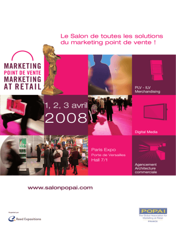 Le Salon de toutes les solutions du marketing point de vente ! PLV - ILV Merchandising 1, 2, 3 avril 2008 Digital Media Paris Expo Porte de Versailles Hall 7/1 Agencement Architecture commerciale www.salonpopai.com The Global Association for Marketing at-Retail FRANCE .28.86 - 114 bis, rue Michel Ange - 75016 Par if « Les Marques, les Distributeurs, les Réseaux sont face à de nouveaux enjeux qui mettent en exergue des préoccupations globales. A l’écoute permanente du marché et des professionnels du secteur, le Popai France et Reed Expositions vous présentent le salon Marketing Point de Vente – Marketing at Retail 2008. L’objectif de cette prochaine édition est de proposer une approche plus globale et plus transversale du Point de Vente, organisée en 3 pôles de compétences : ■ PLV, ILV, merchandising, promotion des ventes, marketing sensoriel, matières premières … ■ Digital média, écrans, contenu, software … ■ Agencement, architecture commerciale, éclairage, composants … Une organisation par “expertise” pour une offre encore plus lisible ! RDV les 1er, 2 et 3 avril prochains pour le Salon et les Popai Awards Européens 2008… Sommaire L’offre du salon : les 3 grands secteurs Chiffres clés et essentiels Profil détaillé des visiteurs Liste des visiteurs du salon 2006 Nos actions de promotion Les services à l’exposant Concours Popai Awards Européens Programme des conférences Des outils pour renforcer votre participation La presse parle du salon Une équipe à votre service 2 3 4 5 4•5 6 6 7 7 8•9 10 10 Une offre unique pour fédérer ensemble des professionnels du Marketing at-Retail Rejoignez-nous sur un des de compétences 3 pôles Agencement Architecture commerciale Le secteur du point de vente représente 59 % du marché de l’agencement ; marché établit à 1,5 milliards d’euros. Plus de 40.000 lieux sont agencés chaque année ! L a d i s t r i b ut i o ive La rque Le client La g ed is t r i b u ti o n PLV, ILV, merchandising, promotion des ventes, animation commerciale, matières premières, marketing sensoriel, sacs et coffrets, sons et fragrances, présentoirs, stops rayons, testeurs … ra Les solutions et expertises présentées : nd Les dépenses des annonceurs en PLV ont représenté 880 millions d’euros en 2006, soit 2.7 % des dépenses globales de communication. Pour 2007, 86 % des acteurs s’attendent à une bonne année ! s ct é le agences de design, agencement de magasin, agencement de vitrines, corners, matériaux, mobilier commercial, éclairage, sols, revêtements muraux... ma PLV - ILV - Merchandising n Les solutions et expertises présentées : Digital Média Plus de la moitié des projets affichage dynamique prévus concerne la PLV et l’intérieur du point de vente. Un marché en croissance, appelé à doubler ! Les solutions et expertises présentées : Ecrans, dalles, contenu, conseil, hardware, installation, maintenance, régies, exploitation, solutions logicielles ... « Nous sommes ravis de la nouvelle place accordée à l’agencement commercial sur le salon car il constitue une offre complémentaire à celle de la PLV. » Michel Djeranian, MGD Groupe. 3 Le salon qui répond aux besoins des Annonceurs, des Distributeurs et de tous les acteurs du marketing at-Retail ! 3 jours en avril 15.000 m2 d’expositions ■ 3 secteurs pour couvrir le marché ■ 8.000 visiteurs attendus ■ 4.000 annonceurs ■ 45 % décisionnaires, 55 % prescripteurs ■ 17 % décideurs étrangers ■ 120 journalistes de la presse professionnelle ■ plus de 870 auditeurs aux conférences + le concours Popai Awards Européens avec 400 matériels en compétition ■ visiteurs ■ +12% 06 20 2002 Ils sont annonceurs, distributeurs... ils ont visité le salon 2006 AGATHA • AIR LIQUIDE • AIR MALTA • ALAIN AFFLELOU • ALAIN MIKLI • ALINEA • ALTADIS • AMERICAN BODY ART • ANIMALIS • APPLE • ARC RETAIL • ARTHUS BERTRAND • AUBADE • AUCHAN • AUDIKA • AUDIO TECHNICA • AUDIOPTIC • AXA FRANCE • BABYLISS • BACARDI MARTINI FRANCE • BACCARAT • BANG & OLUFSEN • BANQUE ACCORD • BARILLA FRANCE • BASF COATINGS • BAYARD • BEAUTY SUCCESS • BEIERSDORF SA NIVEA • BEL FRANCE • BIOCODEX • BIODERMA • BNP PARIBAS • BOEHRINGER INGELHEIM • BOIRON • BOLLORE • BONDUELLE • BONGRAIN MERCHANDISING • BOURGEOIS • BOUYGUE TELECOM • BRASSERIE BAVARIA • BRASSERIES KRONENBOURG • BRIDEL • BROSSETTE • BURTON • CADBURY FRANCE • CAISSE EPARGNE • CAMAIEU • CAMIF • CANAL+ • CARLSON WAGONLIT TRAVEL • CARREFOUR • CARREFOUR ASSURANCES • CARREFOUR HYPERMARCHE • CARTIER INTERNATIONAL • CASINO • CASINO BARRIERE • CATIMINI • CAUDALIE • CELIO • CENTRE COMMERCIAL V2 • CENTURY 21 • CHANEL • CHANTELLE • CHAUMET • CHRISTIAN LACROIX • CHRISTOFLE • CLARINS • CLINIQUE • CLUB MED • COCA COLA • COCA COLA ENTREPRISE • CONFORAMA • CONFORAMA PPR • CONTINENTAL • CREDIT AGRICOLE • CREDIT DU NORD • CUISINES SCHMIDT • DAIMLERCHRYSLER France • DANONE • DANONE EAUX France• DARPHIN • DECATHLON • DECATHLON CREATION • DECLERMONT SAS • DECO ADER • DEVERNOIS • DEVRED • DIM • DIOR • DIOR COUTURE • DIOR PARFUMS • DISNEYLAND PARIS • DR PIERRE RICAUD • DYRUP • EDEN PARK • EDITIONS GALLIMARD • EDITIONS GLENAT • EDITIONS LATTES • ELECTROLUX • ELIOR • EMC DISTRIBUTION CASINO • EMC DISTRIBUTION CTR D’ACHAT CASINO • ERIC BOMPARD • ESTEE LAUDER • ETAM LINGERIE SAS • ETAM PRET A PORTER • EUGENEPERMA • EURODIF • EUROMASTER • FACOM • FERRERO FRANCE • FEU VERT • FINDUS • FLEURY MICHON TRAITEUR • FNAC • FNAC SERVICE • FOODS INTERNATIONAL • FORD • FRAGONARD • FRANCAISE DES JEUX • FRANCE LOISIRS • FRANCE QUICK SAS • FRANCE TELECOM • FREE LANCE • FROMAGERIES BEL • FRUIDOR • FUJIFILM • GALERIES LAFAYETTE • GARNIER MAYBELLINE • GENERAL MILLS • GENERAL MOTORS FRANCE 