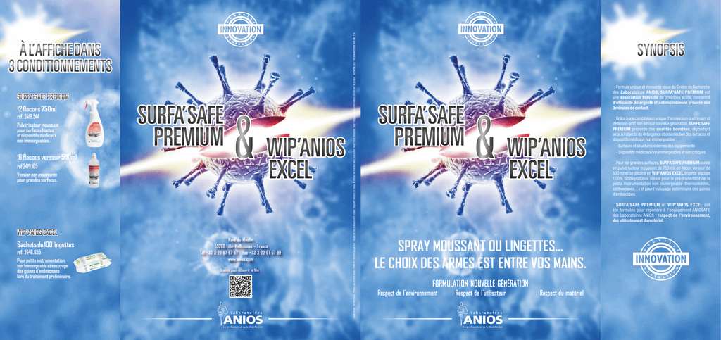 SYNOPSIS SURFA’SAFE PREMIUM 12 flacons 750ml réf. 2419.544 Pulvérisateur moussant pour surfaces hautes et dispositifs médicaux non immergeables. 16 flacons verseur 500ml réf 2419.105 Version non moussante pour grandes surfaces. WIP’ANIOS EXCEL Sachets de 100 lingettes réf. 2446.655 Pour petite instrumentation non immergeable et essuyage des gaines d’endoscopes lors du traitement préliminaire. Pavé du Moulin 59260 Lille-Hellemmes - France Tél +33 3 20 67 67 67 - Fax +33 3 20 67 67 99 www.anios.com Scannez pour découvrir le film : Crédit photo : Shutterstock - Photos non contractuelles. FR2419-140509. Dangereux - respectez les précautions d’emploi. Dispositif médical de classe II. Utilisez les biocides avec précaution. Avant toute utilisation, lisez l’étiquette et les informations concernant le produit. À L’AFFICHE DANS 3 CONDITIONNEMENTS Formule unique et innovante issue du Centre de Recherche des Laboratoires ANIOS, SURFA’SAFE PREMIUM est une association brevetée de principes actifs, concentré d’efficacité détergente et antimicrobienne prouvée dès 3 minutes de contact. Grâce à une combinaison unique d’ammonium quaternaire et de tensio-actif non ionique nouvelle génération, SURFA’SAFE PREMIUM présente des qualités boostées, répondant ainsi à l’objectif de détergence et désinfection des surfaces et dispositifs médicaux non immergeables : - Surfaces et structures externes des équipements - Dispositifs médicaux non immergeables et non critiques Pour les grandes surfaces, SURFA’SAFE PREMIUM existe en pulvérisateur moussant de 750 ml, en flacon verseur de 500 ml et se décline en WIP’ANIOS EXCEL,lingette viscose 100% biodégradable idéale pour le pré-traitement de la petite instrumentation non immergeable (thermomètres, stéthoscopes…) et pour l’essuyage préliminaire des gaines d’endoscopes. SURFA’SAFE PREMIUM et WIP’ANIOS EXCEL ont été formulés pour répondre à l’engagement ANIOSAFE des Laboratoires ANIOS : respect de l’environnement, des utilisateurs et du matériel. SPRAY MOUSSANT OU LINGETTES... LE CHOIX DES ARMES EST ENTRE VOS MAINS. FORMULATION NOUVELLE GéNéRATION Respect de l’environnement Respect de l’utilisateur Respect du matériel la sécurité puissance 3 Les équipes du Centre de Recherche des Laboratoires ANIOS ont sélectionné une nouvelle combinaison de principes actifs désinfectants associés à une classe spécifique de tensio-actifs, faisant de SURFA’SAFE PREMIUM et WIP’ANIOS EXCEL* une formulation unique brevetée (N° 2980955). Engagés dans une démarche d’entreprise intégrant trois valeurs fondamentales : Qualité, Sécurité, Environnement (QSE), les équipes ANIOS intègrent systématiquement les indicateurs de l’engagement ANIOSAFE dans le développement de nouvelles formulations. SURFA’SAFE PREMIUM et WIP’ANIOS EXCEL répondent en tout point à ce cahier des charges : UNE efficacité spectaculaire EPT BREVET ONC É L’ASSOCIATION PRINCIPES ACTIFS/SURFACTANTS 1. Respect de l’homme N° Cette association originale brevetée a été spécialement développée pour assurer un nettoyage et une désinfection combinés des surfaces et notamment des surfaces des dispositifs médicaux non immergeables en conférant : • pH neutre • Sans substance C.O.V. ni C.M.R. • Sans parfum ni colorant • Produit non classé (données 2014) es qualités antimicrobiennes optimisées par l’association du tensio-actif non ionique sélectionné •D et de principes actifs désinfectants • Une formulation Aniosafe, sans alcool, sans parfum, sans C.O.V.** ni C.M.R.*** 2. Respect de l’environnement • Des produits pouvant être utilisés sur les surfaces susceptibles d’entrer en contact avec les denrées alimentaires* Formulation Une haute compatibilité • Sans EDTA, sans NTA • Tensio actif non ionique biodégradable Cette combinaison principes actifs/surfactants assure une haute compatibilité avec un large panel de matériaux et se révèle non corrosive vis-à-vis des inox et polymères. L’agent moussant choisi est biodégradable et procure une mousse dense à effet durable dans le temps pour une meilleure adhérence aux surfaces et une moindre exposition des utilisateurs aux fines particules aérosol lors de la pulvérisation. Ecotoxicité •D iminution des émissions de gaz à effet de serre d’environ 7 %, comparativement à un produit d’indication équivalente. • pH neutre • Ne laisse pas de trace sur les surfaces vitrées • Compatibilité démontrée avec un large panel de matériaux et polycarbonates par protocole du stress cracking : -P olymères : PVC, PMMA, PU, Caoutchouc, ABS, Polycarbonate, Polysulphone, Polyphénylsulphone, Corian, Kerrock -M étaux : Aluminium, Inox 304 brillant, Inox 304 brossé, Acier époxy, Laiton -R evêtements : Tissu enduit PVC, Revêtement de sol Linoléum, Revêtement de sol PVC Emballages • Flacon 750 ml en PEHD recyclable • Flacon 500 ml en PEHD recyclable Cette méthodologie consiste à déposer une salissure à base de sang citraté, représentative des salissures rencontrées en médecine humaine et des salissures référencées dans la norme EN 15883, sur un coupon de laiton. Le choix du support en laiton vise à évaluer le produit dans les conditions les plus défavorables. Compatibilité avec polycarbonate par méthode de stress cracking : +24% Surfa’Safe Premium 83 69 • S URFA’SAFE PREMIUM ne contient que des substances organiques classées facilement biodégradables • L a viscose constituant la lingette WIP’ANIOS EXCEL est 100 % biodégradable • En usine Eco gérée ISO 9001, ISO 14001 et OSHAS 18001 La validation de l’efficacité détergente n’étant pas encadrée à ce jour par une méthode normalisée, les Laboratoires ANIOS se sont donc appliqués à mettre en place une méthodologie démontrant l’amélioration de l’efficacité détergente comparée d’un produit : le PND. PND sur