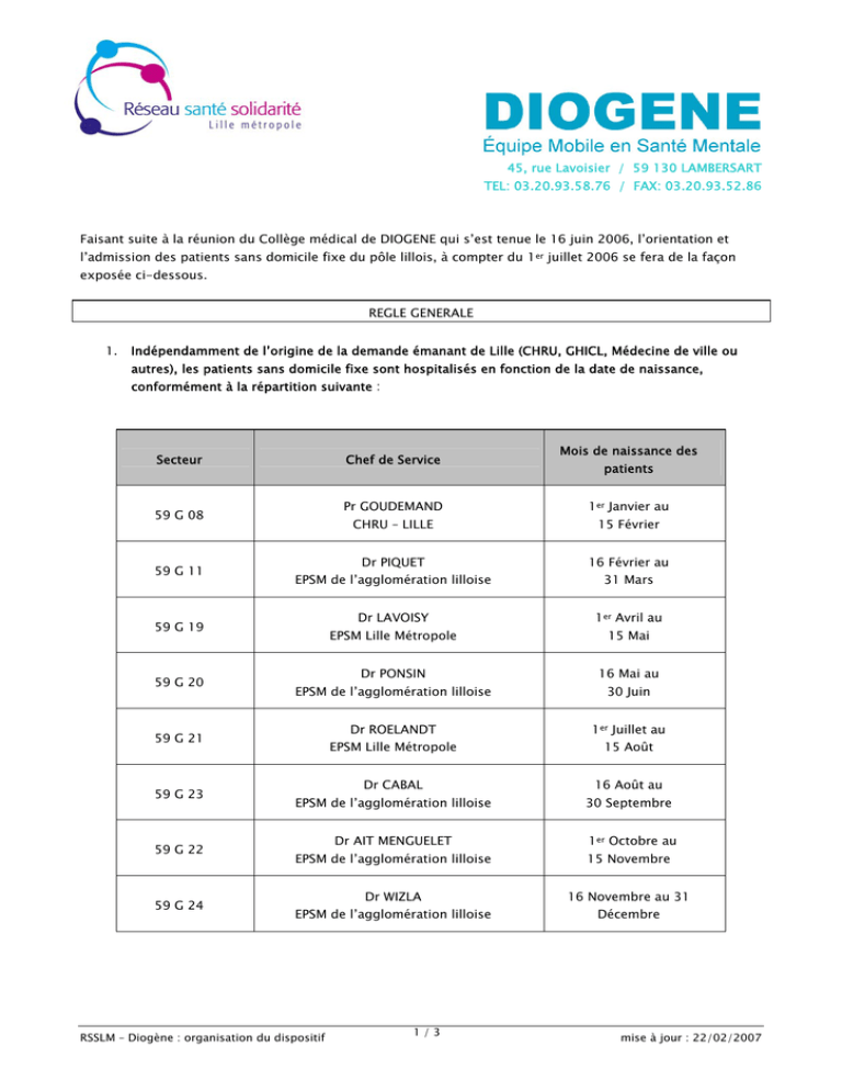 45, rue Lavoisier / 59 130 LAMBERSART TEL: 03.20.93.58.76 / FAX: 03.20.93.52.86 Faisant suite à la réunion du Collège médical de DIOGENE qui s’est tenue le 16 juin 2006, l’orientation et l’admission des patients sans domicile fixe du pôle lillois, à compter du 1er juillet 2006 se fera de la façon exposée ci-dessous. REGLE GENERALE 1. Indépendamment de l’origine de la demande émanant de Lille (CHRU, GHICL, Médecine de ville ou autres), les patients sans domicile fixe sont hospitalisés en fonction de la date de naissance, conformément à la répartition suivante : Secteur Chef de Service 59 G 08 59 G 11 59 G 20 59 G 23 59 G 22 59 G 24 1er Janvier au CHRU – LILLE 15 Février Dr PIQUET 16 Février au Dr LAVOISY 1er Avril au EPSM Lille Métropole 15 Mai Dr PONSIN 16 Mai au Dr ROELANDT 1er Juillet au EPSM Lille Métropole 15 Août EPSM de l’agglomération lilloise 59 G 21 patients Pr GOUDEMAND EPSM de l’agglomération lilloise 59 G 19 Mois de naissance des Dr CABAL EPSM de l’agglomération lilloise Dr AIT MENGUELET 31 Mars 30 Juin 16 Août au 30 Septembre 1er Octobre au EPSM de l’agglomération lilloise 15 Novembre Dr WIZLA 16 Novembre au 31 EPSM de l’agglomération lilloise RSSLM – Diogène : organisation du dispositif 1/3 Décembre mise à jour : 22/02/2007 2. Pour les personnes bénéficiant d’un suivi psychiatrique antérieur On entend par suivi psychiatrique antérieur un suivi ambulatoire ou une hospitalisation datant de moins d’un an en excluant un passage ponctuel en urgence ou en surnombre dans un service de psychiatrie. La prise en charge se poursuit dans le service concerné. L’orientation du patient sans domicile fixe se fera : - auprès du service concerné en fonction du suivi antérieur si l’information concernant celui ci est disponible dans la journée et vérifiable auprès d’un médecin du secteur impliqué ; - en fonction de la date de naissance si l’information n’est pas immédiatement disponible. Si une information parvient à l’unité d’hospitalisation dans un délai de 24 à 48 h au plus tard, un transfert peut être organisé. 3. Pour les personnes en hébergement d’urgence dans les structures suivantes et en l'absence d’un suivi psychiatrique antérieur, l’orientation se fera conformément à la date de naissance : ACCUEILS D’URGENCE Adresse LES PORTES DU SOLEIL 46 rue Ph Lebon – 59260 HELLEMMES ABEJ 9 avenue Denis Cordonnier - 59000 LILLE ARMEE DU SALUT 48 rue de Valenciennes - 59000 LILLE ARS FOYER THIRIEZ 96 rue Brûle Maison - 59000 LILLE ARS ABRI 16 rue Van Hende - 59000 LILLE CAPHARNAUM 4 rue Mirabeau - 59000 LILLE FIVES CEDRE BLEU (Sleep in) 247 bd Victor Hugo - 59000 LILLE FARE 8 tue Tenremonde - 59000 LILLE L’ESCALE 6 rue Auguste Bonte - 59000 LILLE MAGDALA 29 rue des Sarrazins - 59000 LILLE Résidence AROUET 81 rue Jemmappes - 59000 LILLE CMAO 45 rue Lavoisier – 59130 LAMBERSART Les personnes en hébergement d’urgence mais ayant fait l’objet d’un suivi psychiatrique antérieur seront orientées conformément aux dispositions figurant au point 2. RSSLM – Diogène : organisation du dispositif 2/3 mise à jour : 22/02/2007 4. La règle de l’orientation en fonction de la date de naissance s’applique également : - aux personnes en « voyage pathologique » - aux personnes présentant une pathologie psychiatrique aiguë et résidant dans un département autre que le Nord. A défaut de pathologie psychiatrique aiguë, l’orientation doit se faire sur le secteur concerné. DEROGATION Par dérogation à la règle générale (date de naissance), les personnes hébergées de façon prolongée en CHRS ou en résidence sociale et qui ne sont pas déjà suivies par un secteur psychiatrique seront orientées selon les Secteur 59 G 08 CHRU LILLE Nom et adresse de la structure CENTRE MARTINE BERNARD : CHRS Eugénie SMET, 168 rue Aragon – 59120 Loos 59 G 11 CEDRE BLEU : 247 Bd Victor Hugo - 59000 Lille (A REEVALUER) 59 G 19 CENTRE MARTINE BERNARD : 44 rue du Pont Neuf – 59000 Lille EPSM de l’agglomération lilloise LOUISE MICHEL : 3 rue Jean Vilar – 59650 Villeneuve d’Ascq EPSM Lille Métropole 59 G 20 EPSM de l’agglomération lilloise LE CLIQUENOIS : 1 Chemin de la Marote – 59118 Wambrechies LA PHALECQUE : route de Verlinghem – 59840 Lompret CENTRE MATERNEL MERE-ENFANT : 59130 Lambersart HALTE SAINT JEAN : rue du Gal Leclerc – 59350 Saint André ABEJ Résidence Martin Luther King : 5 rue Pline – 59000 Lille ARELI : 8 rue Auguste Bonte – 59000 Lille 59 G 21 EPSM Lille Métropole ARELI : 79 rue Jean Jaurès – 59155 Faches-Thumesnil LES PORTES DU SOLEIL (hébergement) : 48 rue Ph Lebon – 59260 Hellemmes CAPHARNAUM : 4 rue Mirabeau - 59000 Lille MAGDALA : 111 rue Kléber – 59155 Faches-Thumesnil 59 G 22 EPSM de l’agglomération lilloise 59 G 23 EPSM de l’agglomération lilloise ARMEE DU SALUT CHRS : 48 rue de Valenciennes – 59000 Lille RESIDENCE AROUET : 81 rue Jemmappes – 59000 Lille ARS FOYER THIRIEZ : 96 rue Brûle Maison - 59000 Lille ARMEE DU SALUT FERON VRAU HEBERGEMENT : 329 bd Victor Hugo – 59000 Lille ARAS Résidence SARA : 80 rue de Condé – 59000 Lille MAGDALA : rue de Colmar - 59000 Lille ARS CATRY : 7 rue M.Ravel – 59000 Lille 59 G 24 EPSM de l’agglomération lilloise ARS HOME DES MERES : 15 rue Bourgembois – 59000 Lille FARE (CADA + Escale) : 6 rue Auguste Bonte – 59000 Lille ARELI : 20 rue Lannoy – 59000 Lille ABEJ CHRS (Hôtel social) : 9 avenue Cordonnier – 59000 Lille En cas de suivi psychiatrique antérieur, il convient de se reporter aux règles du point 2. RSSLM – Diogène : organisation du dispositif 3/3 mise à jour : 22/02/2007 Note rédigée avec le concours de la direction des affaires juridiques et contentieuses de l’EPSM de l’agglomération lilloise. modalités suivantes :