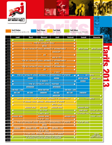 5H30 Tarifs 6H00 TITRE DE L’ACTUALITÉ LOCALE 6H10 MÉTÉO Tarif Platine de 5h50 à 8h et de16h à 18h Lundi Mardi Tarif Titane Tarif Gold de 8h à 11h Mercredi MÉTÉO Jeudi Vendredi JOUR DE FÊTE 6H50 TITRE DE L’ACTUALITÉ LOCALE, NATIONALE ET INTERNATIONALE MÉTÉO 7H10 TITRE DE L’ACTUALITÉ LOCALE, NATIONALE ET INTERNATIONALE 7H30 GAG 7H45 LE GOLD 7H55 TITRE DE L’ACTUALITÉ LOCALE, NATIONALE ET INTERNATIONALE ET SPORTIVE AGENDA 8H30 AGENDA 9H10 LE ZOOM TV 10H00 TITRE DE L’ACTUALITÉ LOCALE + PACIFIQUE INTERVIEWS 10H03 10H10 1 MN POUR 1 LIVRE NRJ LIVE INTERVIEWS CINENEWS 1 MN POUR 1 LIVRE NRJ BOX NRJ LIVE 11H00 RAPPEL DES TITRES + SPORT NEWS LOCAL, NATIONALE ET INTERNATIONALE 11H30 LE JOURNAL LOCAL, NATIONAL, INTERNATIONAL ET SPORTIF 11H10 MÉTÉO MÉTÉO LAGON 12H30 MUSIQUE NEWS 13H30 WEB NEWS MUSIQUE NEWS MUSIQUE NEWS 14H30 NRJ STORY 15H30 PLANÈTE MUSIC 16H30 MUSIQUE NEWS MUSIQUE NEWS 16H40 PLAY HIT LOCAL 17H00 TITRE DE L’ACTUALITÉ LOCALE, NATIONALE ET INTERNATIONALE ET SPORTIVE GAME NEWS 14H Rediff. NRJ STORY 15H HITDANCE 30mn 16H/18H EUROHOT 30 PENDANT 2 HEURES MUSIQUE NEWS PLAY HIT LOCAL MÉTÉO 17H10 CINENEWS 1 MN POUR 1 CLUB GAME NEWS 1 MN POUR 1 CLUB 17H40 PLAY HIT LOCAL 18H00 LE FLASH LOCAL, NATIONAL, INTERNATIONAL ET SPORTIF 18H30 TITRES DE L’ACTUALITÉ LOCALE, NATIONALE, INTERNATIONALE ET SPORTIVE ET TITRES DES NOUVELLES DU LENDEMAIN 19H00 CINENEWS HOROSCOPE 10H40 17H30 MÉTÉO LAGON AGENDA MICRO TROTTOIR NRJ BOX MÉTÉO LAGON 8H10 MÉTÉO MÉTÉO LAGON Tarifs 2013 GAG 7H00 Dimanche 2013 MÉTÉO LAGON HOROSCOPE 6H45 Samedi LAGON 6H40 10H30 de 14h à 16h et de 18h à 20h TITRE DE L’ACTUALITÉ LOCALE, NATIONALE ET INTERNATIONALE 6H30 8H00 Tarif Silver de 11h à 14h 18H/19H PLANETE MUSIC REDIFF 3 ÉMISSIONS Tarifs Tarifs 2013 Tarif Platine de 5h50 à 8h et de16h à 18h Tarif Titane Tarif Silver Tarif Gold de 8h à 11h de 14h à 16h et de 18h à 20h de 11h à 14h Forfait « Découverte » - - Tarif net HT Un annonceur n’a jamais communiqué sur NRJ, pour rendre sa campagne encore plus performante NRJ rajoute 50% de spots au plan media initial. • Les frais techniques sont offerts (enregistrement local). • Règlement à l’ouverture de compte. • Delais de mise à l’antenne : 72 heures. Ne peut etre cumulée à une autre remise. Durée 1 20’’ DÉCOUVERTE FORCE 2 20’’ DÉCOUVERTE FORCE 3 20’’ Programmation sur 2 semaines maximum Programmation sur 2 semaines maximum Programmation sur 3 semaines maximum 3 + 1 passage offert 5 + 3 passages offerts 6 + 3 passages offerts Titane 4 + 1 passage offert 4 + 2 passages offerts 6 + 3 passages offerts Gold 2 + 2 passages offerts 4 + 2 passages offerts 5 + 2 passages offerts Silver Tarifs 3 56 986 XPF 5 85 328 XPF 7 107 893 XPF + 2 passages offerts + 2 passages offerts + 4 passages offerts Forfait «Flash» - Tarif net HT Planning : respect des quantités par tranches horaires annoncées dans l’offre. • Programmation sur 10 jours maximum. • Week-end compris. • Frais techniques : suivant tarif 2013. • Non cumulable avec les autres offres du tarif. • Règlement à 30 jours. Durée FLASH 15 15’’ Programmation sur 10 jours maximum (week-end compris) 20’’ FLASH 20 15’’ Programmation sur 10 jours maximum (week-end compris) 20’’ Platine Titane 3 Gold 4 5 3 4 5 Tarifs 2013 DÉCOUVERTE FORCE Platine 18 passages dont 6 offerts 27 passages dont 9 offerts 36 passages dont 12 offerts Silver Tarifs bruts Remise Tarifs 5 59 910 XPF FLASH 44 934 XPF 70 665 XPF FLASH 52 991 XPF 80 107 XPF FLASH 59 279 XPF 94 474 XPF FLASH 69 911 XPF 6 Forfait «Caddy» Respect des tranches horaires : Platine 16/18h - Silver 2 en 14/16h. 1 en 18/20h et 2 le week-end. • Programmation 1 semaine maximum et du jeudi au dimanche. • Frais techniques : suivant tarif 2013. • Non cumulable avec les autres offres du tarif. Durée Platine Titane Gold Silver Tarifs bruts Remise Tarifs CADDY 15 12 spots de 3 5 35 665 XPF 12 spots de 2 CADDY CADDY 20 2 47 533 XPF 56 082 XPF CADDY 42 062 XPF 15’’ 20’’ Offre spéciale Grand Nouméa et Offre chantier - Tarif net HT spéciale Grand Nouméa Le siège de votre entreprise se trouve sur le secteur du Mont dore, Robinson, Boulari • NRJ tient compte de cet éloignement 1 Offre géographique et vous propose une offre adaptée • Vous avez besoin de capter les habitants du Mont dore • Aux heures de pointe, 1 véhicule sur 3 écoute NRJ, profitez de cette affluence d’auditeurs en communiquant sur NRJ. 2 Principe : 1 payé = 2 diffusés (pas de remise sur ce tarif) Offre chantier Nouméa Proposée aux nouveaux annonceurs et pour une commande passée avant le départ de l’activité • Offre soumise aux conditions d’une ouverture de compte GHM. Durée FORCE 1 20’’ FORCE 2 20’’ Programmation sur 2 semaines maximum Programmation sur 1 semaine maximum Platine Titane Gold Silver Tarifs + 3 passages offerts + 2 passages offerts + 1 passage offert 4 47 338 XPF + 4 passages offerts 20 passages dont 10 offerts 4 3 2 5 66 283 XPF 3 + 4 passages offerts 2 + 3 passages offerts 1 + 2 passages offerts + 5 passages offerts 28 passages dont 14 offerts Les parrainages Nom Tarifs 2 RDV/S 5(Lundi et Vendredi) L/V de 12h à 15h30 L/V de 6h à 9h L/V de 9h à 12h 3 RDV/S 3 RDV/S (lundi, mercredi, samedi) 1 RDV LE DIMANCHE (2h) 2 RDV/S L/V 1 RDV/J 2 RDV/S L/D 2 RDV/J 1 RDV/S LE SAMEDI (1/2h) L/V 5 RDV/J L/V 3 RDV/J L/V 3 RDV/J 2 RDV/S L/V 1 RDV/J L/V 1 RDV/J L/D 1 RDV/J L/V 1 RDV/J L/V 3 RDV/J + 2 le S et D L/S 3 RDV/J L/V 1 RDV/J 1 RDV/S L/V 1 RDV/J + REDIF LE D (1h) L/V 1 RDV/J L/V 2 RDV/J + 1 RDV LE SAMEDI L/D 1 RDV/J L/V 1 RDV/J 2 RDV/S 1 RDV/S 6 RDV/S 1/JR 1/JR 1/JR 1/JR 1/JR 1/JR 1/JR 1/JR 1/JR 1/JR 1/JR 1/JR 1/JR 1/JR 1/JR 1/JR 1/JR 1/JR 0/JR 1/JR 1/JR 1/JR 1/JR 1/JR 1/JR 1/JR 1/JR 1/JR 1/JR 1/JR 1/JR 1/JR Prix net ht/mois 65 000 135 000 135 000 135 000 100 000 95 000 65 000 65 000 80 000 65 000 100 000 45 000 135 000 120 000 120 000 65 000 100 000 100 000 80 000 70 000 