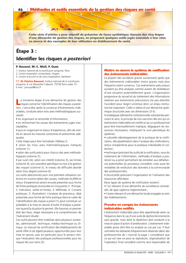 46 Méthodes et outils essentiels de la gestion des risques en santé Cette série d’articles a pour objectif de présenter de façon synthétique chacune des cinq étapes d’une démarche de gestion des risques, en proposant quelques outils jugés essentiels à leur mise en œuvre et des exemples de leur utilisation en établissement de santé. Étape 3 : Identifier les risques a posteriori Tirer des leçons des expériences du passé P. Roussel, M.-C. Moll, P. Guez 1. Institut national de la transfusion sanguine, Paris 2. Centre hospitalier universitaire, Angers 3. Centre d’accueil et de soins hospitaliers, Nanterre Dr Patrice Roussel, Institut national de la transfusion sanguine, 6 rue Alexandre Cabanel, 75739 Paris cedex 15 E-mail : [email protected] a troisième étape d’une démarche de gestion des risques concerne l’identification des risques a posteriori, c’est-à-dire après la survenue d’événements indésirables, conduite selon trois axes méthodologiques successifs : • en organisant la remontée d’informations ; • en recherchant les causes des événements jugés inacceptables ; • puis en organisant le retour d’expérience, afin de mettre en œuvre les mesures correctives et préventives adéquates. Cette étape peut être formalisée (Tableau I) : • selon les trois axes méthodologiques indiqués (colonne 1) ; • selon des outils précis pour chacun des axes méthodologiques (colonne 2) ; • par outil cité, selon son intérêt (colonne 3), ses limites (colonne 4), son caractère spécifique ou non à la gestion des risques (colonne 5), le niveau de difficulté abordé selon trois degrés (colonne 6). Les outils sélectionnés pour une première utilisation collective en routine (arbre des causes, méthode ALARM et retour d’expérience) seront ensuite présentés sous forme de fiches pratiques structurées en cinq points (1. Principe, 2. Indication, utilité et limites, 3. Méthode, 4. Conseils pratiques, 5. Illustration). L’analyse de processus, déjà présentée sous forme de fiche pratique dans le cadre de l’identification des risques a priori (1), peut constituer un préalable à la mise en œuvre d’outils d’analyse a posteriori quand la situation le permet. Elle favorise un premier état des lieux, étape nécessaire à la compréhension de l’événement étudié. Ces outils peuvent être mobilisés dans plusieurs contextes, administratif, technique, médico-technique ou clinique. Le manuel de certification des établissements de santé offre à cet égard plusieurs opportunités pour leur mise en œuvre, avec en particulier pour le secteur clinique l’évaluation des pratiques professionnelles pour les risques liés aux soins (2). L Mettre en œuvre le système de notification des événements indésirables La plupart des accidents graves surviennent après que des événements indésirables moins graves mais plus fréquents soient survenus. Ces événements précurseurs auraient pu être analysés comme autant de révélateurs d’une situation potentiellement grave. L’organisation progressive du recueil et du traitement des informations relatives aux événements précurseurs (ne pas attendre l’accident pour réagir) constitue donc un enjeu institutionnel important. Celle-ci relève d’une démarche systémique structurée avec ses dimensions (3-5) : • stratégique (démarche institutionnelle volontariste précisant le sens, le principe de non-sanction dès lors qu’un événement indésirable est notifié et qu’un professionnel peut être éventuellement impliqué, dégageant les ressources nécessaires, impliquant le suivi périodique du système) ; • culturelle (développement de la pratique de la notification, déculpabilisation dans l’analyse des notifications, retour d’expérience pour la pratique individuelle et collective) ; • technique (précisant les outils de la notification, ceux du traitement de l’information, méthodes d’analyse a posteriori ou a priori permettant de remédier aux défaillances potentielles du processus considéré, mais aussi les modalités de restitution des données à la communauté des professionnels) ; • structurelle (précisant l’organisation et l’utilisation des ressources affectées). Deux types de système de notification existent : • l’un relevant d’une démarche de surveillance centralisée, de type vigilance réglementaire ; • l’autre relevant d’une démarche locale engagée au sein des établissements. Prendre en compte les événements indésirables notifiés L’événement indésirable peut être appréhendé selon sa fréquence dans le cas d’une suite de dysfonctionnements sans gravité, mais dont la répétition doit conduire à la mise en place d’action d’amélioration. L’événement indésirable grave doit être lui analysé au cas par cas. Il faut connaître les obstacles fréquemment observés (désir des professionnels de « tourner la page » considérant que ce qui est rare ne peut se reproduire, stigmatisation de l’opérateur final considéré comme seul responsable de RISQUES & QUALITÉ • 2008 - VOLUME V - N°1 Méthodes et outils essentiels de la gestion des risques en santé l’événement, absence de culture d’analyse collective et d’outils adaptés…). L’événement indésirable grave doit être appréhendé comme une opportunité managériale pour améliorer la sécurité des organisations et des pratiques. Là où il pouvait y avoir déni ou réticence avant l’événement, on observe après sa survenue un questionnement qu’il convient de gérer au mieux, tant les enjeux sont importants : • enjeu diagnostique par la mise en évidence des causes réelles d’une défaillance, non pas tant les causes immédiates apparentes que les causes racines plus profondes (choix stratégiques contradictoires, défauts concernant l’organisation, la communication, la formation, l’évaluation, l’information, 