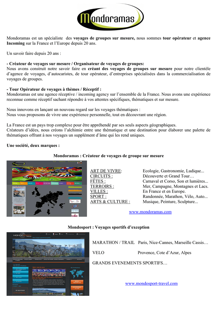 Mondoramas est un spécialiste des voyages de groupes sur mesure, nous sommes tour opérateur et agence Incoming sur la France et l’Europe depuis 20 ans. Un savoir faire depuis 20 ans : - Créateur de voyages sur mesure / Organisateur de voyages de groupes: Nous avons construit notre savoir faire en créant des voyages de groupes sur mesure pour notre clientèle d’agence de voyages, d’autocaristes, de tour opérateur, d’entreprises spécialisées dans la commercialisation de voyages de groupes. - Tour Opérateur de voyages à thèmes / Réceptif : Mondoramas est une agence réceptive / incoming agency sur l’ensemble de la France. Nous avons une expérience reconnue comme réceptif sachant répondre à vos attentes spécifiques, thématiques et sur mesure. Nous innovons en lançant un nouveau regard sur les voyages thématiques : Nous vous proposons de vivre une expérience personnelle, tout en découvrant une région. La France est un pays trop complexe pour être appréhendé par ses seuls aspects géographiques. Créateurs d’idées, nous créons l’alchimie entre une thématique et une destination pour élaborer une palette de thématiques offrant à nos voyages un supplément d’âme qui les rend uniques. Une société, deux marques : Mondoramas : Créateur de voyages de groupe sur mesure ART DE VIVRE: CIRCUITS : FÊTES : TERROIRS : VILLES : SPORT : ARTS & CULTURE : Ecologie, Gastronomie, Ludique... Découverte et Grand Tour… Carnaval et Corso, Son et lumières... Mer, Campagne, Montagnes et Lacs. En France et en Europe. Randonnée, Marathon, Vélo, Auto... Musique, Peinture, Sculpture... www.mondoramas.com Mondosport : Voyages sportifs d’exception MARATHON / TRAIL Paris, Nice-Cannes, Marseille Cassis… VELO Provence, Cote d’Azur, Alpes GRANDS EVENEMENTS SPORTIFS… www.mondosport-travel.com Nos objectifs, un engagement de qualité : Enrichir vos voyages en leur offrant des contenus valorisants avec les envies et les passions de vos clients. Vous assurer du meilleur suivi, garantir votre satisfaction et vous offrir les meilleurs services. Les atouts de Mondoramas : - Une expérience et un savoir faire de 20 ans. - Un site web, www.mondoramas.com, décliné en 3 langues (Français, Anglais, Allemand) - Une riche palette de programmes avec thématiques pour un catalogue de plus de 600 idées de voyages - Un moteur de recherche par région / par thématique - Un carnet de voyages unique véritable signature de notre savoir faire - Un partenariat garanti : Nous collaborons exclusivement avec des professionnels du tourisme. Nous sélectionnons avec le plus grand soin nos prestataires. Nous sommes des spécialistes de toute l'Europe et du bassin Méditerranéen. Nous vous offrons un seul contact, du devis au carnet de voyage. Nous vous proposons de vous aider à séduire vos clients en co-développant et personnalisant nos e-mailings au nom de votre entreprise. Contactez nous, élaborons un projet ensemble, vous serez satisfait. Historique et perspectives Mondoramas, s’affirme depuis 20 ans comme un spécialiste du voyage sur mesure. Nous avons acquis une grande expertise de réceptif autour des attentes particulières que requières le bon déroulement des voyages à thématiques. L'entreprise est basée à La Ciotat dans LES BOUCHES DU RHONE, cela nous confère une légitimité de notre savoir faire sur l’ensemble de la Provence et de la Côte d’Azur. Nous restons fidèle à notre positionnement de "Business to Business", nous travaillons exclusivement pour des professionnels en France et à l'étranger. Mondoramas a été repris par Yves Guivarch en Avril 2008. Il insuffle une stratégie de créateur d'idées, d’offres novatrices, en développant des voyages et séjours thématiques afin de rester au plus près des besoins et de l’exigence des professionnels. Informations légales : © Mondoramas Mondoramas, 375 avenue du Mistral- Athelia IV – 13600 La Ciotat – France Tel : 0033 (0)442 360 360 – Fax 0033 (0) 442 360 370 - Mail : [email protected] Effectif de 14 collaborateurs SAS au capital de 76 224 € Immatriculée SIRET 387 663 735 au RCS de Marseille Société créée en 1992 à Aix en Provence – France Immatriculation Atout FRANCE Tour Opérateur IM 0831 0000 3 Assurance responsabilité civile HISCOX Garantie financière APS 100 000 € Membre du Syndicat National des Agents de Voyage Membre Associé d’Atout France