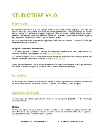 STUDIOTURF V4.0 Présentation Le logiciel Studioturf V4.0 est un logiciel dédié à l’étude des courses hippiques, une aide à la décision basée sur une quantité importante de données permettant une analyse détaillée des courses et des partants. Il va de soi que le logiciel ne peut en aucun cas prévoir l'arrivée d'une course, mais il permet de déterminer, selon les paramètres choisis par l'utilisateur, quels sont les chevaux ayant le plus de chances théoriques de passer le poteau d'arrivée en tête. En raison des nombreuses améliorations apportées à cette nouvelle version, la version 4.0 n’est pas compatible avec les précédentes. Le logiciel se décline en deux versions : - La version gratuite « Standard », offrant de nombreuses possibilités de calcul mais limitée sur certaines fonctions, téléchargeable sur le site www.studioturf.fr. - La version complète « Plus », comprenant toutes les options du logiciel pour un calcul optimal des arrivées théoriques, disponible à l'achat sur le site www.studioturf.fr. Quelle que soit la formule choisie, le logiciel offre tous les jours la possibilité de télécharger toutes les courses de la réunion du Quinté +, soit entre 7 et 10 courses à étudier chaque jour. Installation Double-cliquez sur le fichier d'installation du logiciel et allez jusqu'au bout du processus d'installation en modifiant le moins de paramètres possibles. Quand cela est terminé, Lancez le logiciel. Lancement du logiciel Au démarrage, le logiciel recherche les mises à jour ou courses disponibles et les télécharge automatiquement. LE MENU Le menu du logiciel est assez simple, l’option « Quitter » sert à quitter le logiciel, l’option « Réindexation de la base » permet de réparer, si besoin, votre base de données et la boite « A propos » vous donne le numéro de votre version de Studioturf. Studioturf 4.0 – www.studioturf.fr © Les Editions Studio Turf 2014 LES ONGLETS A l'ouverture du logiciel, vous vous trouvez face à l'onglet principal de Studioturf (l'onglet « Détails Courses »), c’est la page qui vous permettra de mettre en place vos stratégies de calcul. Vous remarquez également la présence de quatre autres onglets. Le deuxième onglet comporte les informations détaillées sur chaque partant d'une course, le troisième offre une étude de rentabilité et de réussite sur vos stratégies de jeu, le quatrième permet de rajouter, d'éditer ou de modifier les données d'une course (cotes des chevaux, favoris de la presse, arrivée, rapports, etc). Enfin, sur le dernier, vous avez accès à des informations statistiques sur les hippodromes, les entraîneurs, etc… afin de vous aider dans le choix de vos chevaux. Onglet 1 – Détails Courses C’est la page principale du logiciel, probablement celle où vous passerez le plus de temps. L'onglet comporte : - Un bandeau d’information concernant la course sélectionnée dans le tableau 1. - Le tableau des courses en mémoire (tableau 1). - Le tableau des partants dans la course sélectionnée (tableau 2). - Le module de calcul central avec la sélection personnelle et l'arrivée de la course sélectionnée, le bouton de calcul de l'arrivée théorique et le graphique correspondant. - La sélection de la Presse (uniquement disponible dans la version complète). - Les jauges de chaque paramètre de calcul (24 dans la version gratuite, 30 dans la complète). - Les rapports de chaque course. Studioturf 4.0 – www.studioturf.fr © Les Editions Studio Turf 2014 Onglet 2 – Détails Partants C’est ici que vous trouverez toutes les informations détaillées sur les chevaux au départ d'une course. L'onglet comporte : - Le tableau des courses en mémoire. - Le tableau des partants dans la course sélectionnée. - Les informations concernant chaque partant ainsi que son entourage. Onglet 3 – Permanence C’est la page qui vous permettra de vérifier le bien-fondé de vos stratégies de jeu. L'onglet comporte : - Un tableau avec le détail des arrivées des courses en mémoire. - Des filtres d'affichage des courses. - Des statistiques sur votre % de réussite et votre rentabilité en fonction des filtres sélectionnés. - Des statistiques sur le nombre global de courses, hors filtres. - Une zone récapitulative des paramètres utilisés pour chaque course. Onglet 4 – Edition/Modifications C’est la page qui vous permettra d'ajouter ou de modifier les informations relatives à une course. L'onglet comporte : - Le tableau des courses en mémoire (tableau 1). - Le tableau des partants dans la course sélectionnée (tableau 2). - Le module d'édition des courses (cotes du jour, sélection de la presse, arrivée de la course). - Le module d'édition des partants (chronos, dernière cote, aptitude terrain, non-partant). - Le module d'édition du % de réussite du jockey et de l'entraîneur de chaque cheval au départ. - Le module d'édition des rapports. Attention, les éléments suivants ne sont modifiables que dans la version complète du logiciel : - Sélection de la presse. - Dernière cote du cheval et meilleur chrono sur la distance. - % de réussite de l'entraîneur et du jockey. Onglet 5 – Hippodromes Vous trouverez, sur ce dernier onglet, des informations et des statistiques sur les hippodromes. Elles sont données à titre informatif pour vous aider dans l’élaboration de vos stratégies de jeu. Il y a notamment la position des chevaux derrière l'autostart, le pourcentage de réussite des favoris en général, en fonction du type de course, de l'hippodrome, des entraîneurs, de la discipline, etc… Studioturf 4.0 – www.studioturf.fr © Les Editions Studio Turf 2014