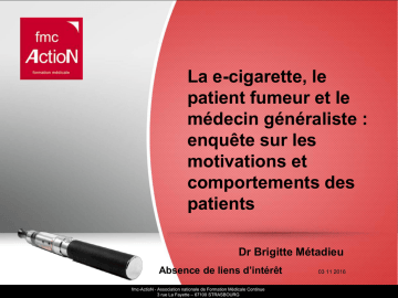 La e-cigarette, le patient fumeur et le médecin généraliste : enquête sur les motivations et comportements des patients Dr Brigitte Métadieu Absence de liens d’intérêt . fmc-ActioN - Association nationale de Formation Médicale Continue 3 rue La Fayette – 67100 STRASBOURG 03 11 2016 CONSTATS En 2014, la e cigarette n’est pas un médicament et pourtant elle est bien présente en médecine générale mais peu de données sur les représentations des patients ...et sur les infos utiles à leur transmettre fmc-ActioN - Association nationale de Formation Médicale Continue 3 rue La Fayette – 67100 STRASBOURG Méthode • Etude transversale • 375 Médecins participants au DPC de FMC Action sur l’e cigarette en 2014 • Chaque MG devait interroger 10 patients fumeurs ou ex fumeurs sur les motivations, freins, causes de rejet et comportement d’utilisation liés à la e cigarette( 1ère partie du DPC) : questions ouvertes et fermées • données anonymisées fmc-ActioN - Association nationale de Formation Médicale Continue 3 rue La Fayette – 67100 STRASBOURG LES PATIENTS • 3319 fumeurs ou ex fumeurs +/- vapoteurs • répartis en France métropolitaine, • milieu rural et urbain fmc-ActioN - Association nationale de Formation Médicale Continue 3 rue La Fayette – 67100 STRASBOURG Limites de l’enquête • absence de données sur la consommation quotidienne de tabac, Sur le niveau de dépendance sur le type de prise en charge antérieure et actuelle ( SN ? TCC ?....) sur les consommations conjointes, p.e. le cannabis. …… fmc-ActioN - Association nationale de Formation Médicale Continue 3 rue La Fayette – 67100 STRASBOURG Premiers résultats • 61 % d’ATCD de tentatives d’arrêt • 47 % avaient essayé une e cigarette idem Baromètre INPES : stagnation ???? 63% continuaient à l’utiliser ( durée moyenne d’utilisation : 11 semaines) fmc-ActioN - Association nationale de Formation Médicale Continue 3 rue La Fayette – 67100 STRASBOURG Les freins à l’essai • A priori je préfère les « vraies » cigarettes : 39% • C’est dangereux, on ne sait pas ce qu’il y a dedans : 33% • Mon entourage me l’a déconseillé 9% • Je n’aime pas les parfums 6% • Je ne peux pas y mettre de cannabis 2% • Autre 25% fmc-ActioN - Association nationale de Formation Médicale Continue 3 rue La Fayette – 67100 STRASBOURG Motivations à l’essai • arrêter le tabac : 47 % • diminuer le tabac : 36% • finances : 18% • Conseillé par l’entourage : 11% • Autre : 7% fmc-ActioN - Association nationale de Formation Médicale Continue 3 rue La Fayette – 67100 STRASBOURG Et dans la littérature…. • arrêt , réduction et finances : idem Baromètre INPES 2014 • Santé, plaisir, finances : JF Etter 2013 • L’entourage compte peu : c’est une décision personnelle avec rejet des campagnes de prévention enquête INSERM 2015 chez de jeunes adultes: Ref Baromètre INPES, Revue Cochrane, Etude JF Etter fmc-ActioN - Association nationale de Formation Médicale Continue 3 rue La Fayette – 67100 STRASBOURG Vapoteurs ou usagers mixtes ? • 63% des expérimentateurs continuaient à utiliser la e cigarette , dont : 12% avaient arrêté le tabac (78% au moins depuis 4 semaines soit 5,9 % des expérimentateurs) 78% vapoteurs mixtes ( 10 cigarettes en moyenne) fmc-ActioN - Association nationale de Formation Médicale Continue 3 rue La Fayette – 67100 STRASBOURG Dosages de e nicotine • Avez-vous essayé plusieurs dosages ? non = 70% • Dosage actuel en nicotine : 1/3 n’a pas répondu et 16% NSP désintérêt ? Méconnaissance ? 0 : 8% 5 à 10mg/ml : 35% 10 à 15 mg/ml : 30% 15 à 20 mg/ml : 10% fmc-ActioN - Association nationale de Formation Médicale Continue 3 rue La Fayette – 67100 STRASBOURG Dosage en e nicotine : est-ce important ? 8% à 0 nicotine et 16% NSP Farsalinos 2013 : dosage efficacité 20% des V : dosage > 20 M ~ 2 fois plus d’arrêt et de diminution avec nicotine vs sans nicotine JF Etter 2013: Le soulagement du besoin de fumer = niveaux élevés de nicotine dans les e liquides Revue Cochrane : fmc-ActioN - Association nationale de Formation Médicale Continue 3 rue La Fayette – 67100 STRASBOURG Causes de rejet de l’e cigarette • contraintes techniques ( recharger batterie, remplissage, fuite) • incertitudes sur la sécurité • irritation de la gorge, toux : intérêt du « HIT ? » ? • moindre efficacité % tabac , surtout sur le stress : pb de dosage ? Pas de shoot ? • dépendance à l’objet: toujours à la bouche, peu d’info sur la cinétique, pb dosage ? fmc-ActioN - Association nationale de Formation Médicale Continue 3 rue La Fayette – 67100 STRASBOURG Pb techniques et de sûreté • pb techniques : 1ère cause de rejet • incertitudes sur la sûreté = 2ème frein à l’essai et 2 ème cause de rejet la perception du risque = 1ère cause de poursuite du tabac en + de la vape K Farsalinos 2014 • Recommandations de l’Académie de médecine : réglementer la fabrication et la distribution de l’ecigarette afin d’en assurer la sûreté et la fiabilité (norme AFNOR) ; fmc-ActioN - Association nationale de Formation Médicale Continue 3 rue La Fayette – 67100 STRASBOURG Quelques pistes d’intervention pour le MG Informer et soutenir ! dosages bas ou inconnus de la nicotine, peu de titration : risque de déception Fort taux de poursuite du tabac : informer sans démobiliser Problème de la toux : préférer les e cigarettes sans propylène glycol, l’arôme menthol, diminuer la concentration en nicotine et rajouter un patch… Importance des Problèmes techniques : informer ? plus simple qd norme AFNOR ! fmc-ActioN - Association nationale de Formation Médicale Continue 3 rue La Fayette – 67100 STRASBOURG