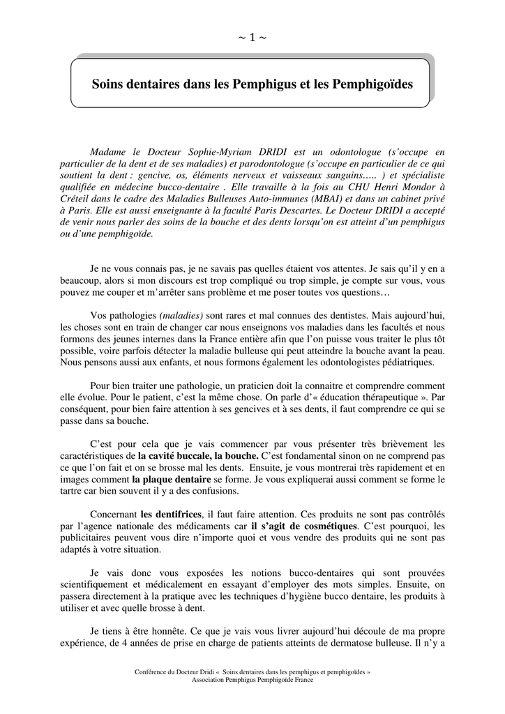 ~1~ Soins dentaires dans les Pemphigus et les Pemphigoïdes Madame le Docteur Sophie-Myriam DRIDI est un odontologue (s’occupe en particulier de la dent et de ses maladies) et parodontologue (s’occupe en particulier de ce qui soutient la dent : gencive, os, éléments nerveux et vaisseaux sanguins….. ) et spécialiste qualifiée en médecine bucco-dentaire . Elle travaille à la fois au CHU Henri Mondor à Créteil dans le cadre des Maladies Bulleuses Auto-immunes (MBAI) et dans un cabinet privé à Paris. Elle est aussi enseignante à la faculté Paris Descartes. Le Docteur DRIDI a accepté de venir nous parler des soins de la bouche et des dents lorsqu’on est atteint d’un pemphigus ou d’une pemphigoïde. Je ne vous connais pas, je ne savais pas quelles étaient vos attentes. Je sais qu’il y en a beaucoup, alors si mon discours est trop compliqué ou trop simple, je compte sur vous, vous pouvez me couper et m’arrêter sans problème et me poser toutes vos questions… Vos pathologies (maladies) sont rares et mal connues des dentistes. Mais aujourd’hui, les choses sont en train de changer car nous enseignons vos maladies dans les facultés et nous formons des jeunes internes dans la France entière afin que l’on puisse vous traiter le plus tôt possible, voire parfois détecter la maladie bulleuse qui peut atteindre la bouche avant la peau. Nous pensons aussi aux enfants, et nous formons également les odontologistes pédiatriques. Pour bien traiter une pathologie, un praticien doit la connaitre et comprendre comment elle évolue. Pour le patient, c’est la même chose. On parle d’« éducation thérapeutique ». Par conséquent, pour bien faire attention à ses gencives et à ses dents, il faut comprendre ce qui se passe dans sa bouche. C’est pour cela que je vais commencer par vous présenter très brièvement les caractéristiques de la cavité buccale, la bouche. C’est fondamental sinon on ne comprend pas ce que l’on fait et on se brosse mal les dents. Ensuite, je vous montrerai très rapidement et en images comment la plaque dentaire se forme. Je vous expliquerai aussi comment se forme le tartre car bien souvent il y a des confusions. Concernant les dentifrices, il faut faire attention. Ces produits ne sont pas contrôlés par l’agence nationale des médicaments car il s’agit de cosmétiques. C’est pourquoi, les publicitaires peuvent vous dire n’importe quoi et vous vendre des produits qui ne sont pas adaptés à votre situation. Je vais donc vous exposées les notions bucco-dentaires qui sont prouvées scientifiquement et médicalement en essayant d’employer des mots simples. Ensuite, on passera directement à la pratique avec les techniques d’hygiène bucco dentaire, les produits à utiliser et avec quelle brosse à dent. Je tiens à être honnête. Ce que je vais vous livrer aujourd’hui découle de ma propre expérience, de 4 années de prise en charge de patients atteints de dermatose bulleuse. Il n’y a Conférence du Docteur Dridi « Soins dentaires dans les pemphigus et pemphigoïdes » Association Pemphigus Pemphigoïde France ~2~ pas encore de consencius professionnel mais avec le Professeur Catherine Prost et d’autres dermatologues, nous allons nous réunir prochainement. Ensemble nous allons essayer d’établir des recommandations officielles pour les praticiens, qu’ils soient médecins ou odontologistes. Donc tout ce que je vais vous dire, c’est ce que je fais dans ma pratique et c’est ce que j’enseigne à mes patients. Tout est critiquable. Ensuite, je vous parlerai des soins dentaires qu’il est possible de réaliser en fonction des stades évolutifs de la maladie bulleuse. Effectivement, j’entends souvent, « Mon dentiste n’a pas voulu me soigner », « Il a vu une bulle et il a dit, non non, je ne fais rien », « On m’a grondé, pourtant je fais ce que je peux pour me brosser les dents, mais je n’y arrive pas … » ou encore « Cela fait 4 ans que j’ai mal, je n’arrive plus à manger, je n’arrive plus à me brosser les dents ». (Le paragraphe concernant les soins dentaires sera publié dans notre prochaine lettre d’information.) I. Caractéristiques de la cavité buccale (de l’ensemble de la bouche) La première caractéristique de la cavité buccale, c’est l’humidité apportée par la salive. La bouche est rarement sèche en dehors du cadre de certaines pathologies. La deuxième caractéristique, c’est que la cavité buccale n’est jamais stérile sauf dans le ventre de sa mère. Dès la naissance, une multitude de bactéries vont coloniser le tube digestif. On appelle cela la flore endogène, endogène parce qu’elle appartient à l’individu. Un être humain a énormément de bactéries sur sa peau, ses cheveux et dans tout le tube digestif qui commence par la bouche, c’est normal. L’ensemble de ces bactéries constitue le microbiote qui est spécifique à chaque personne et indispensable pour le maintien de sa santé (c’est un peu l’empreinte digitale de la bouche). A tel point que si l’on prend trop d’antibiotiques ou si ces derniers sont contre indiqués, certaines personnes peuvent développer des troubles digestifs telle une diarrhée. Le médicament n’a pas une tête chercheuse, il est capable de détruire les bonnes bactéries comme les mauvaises et être à l’origine de pathologies. Donc ce qu’il faut bien comprendre, c’est que les bactéries endogènes nous protègent, en tapissant notre tube digestif et en secrétant des substances bénéfiques comme des vitamines. Une bactérie n’est donc pas forcément pathogène ; pathogène veut dire : qui va entrainer une maladie. C’est pour cette raison qu’il ne faut pas abuser des bains de bouche antiseptiques sinon, vous détruisez votre flore bactérienne bénéfique avec le risque d’être malade. Par conséquent et c’est un dogme, à chaque instant les bactéries endogènes vont se fixer sur les d