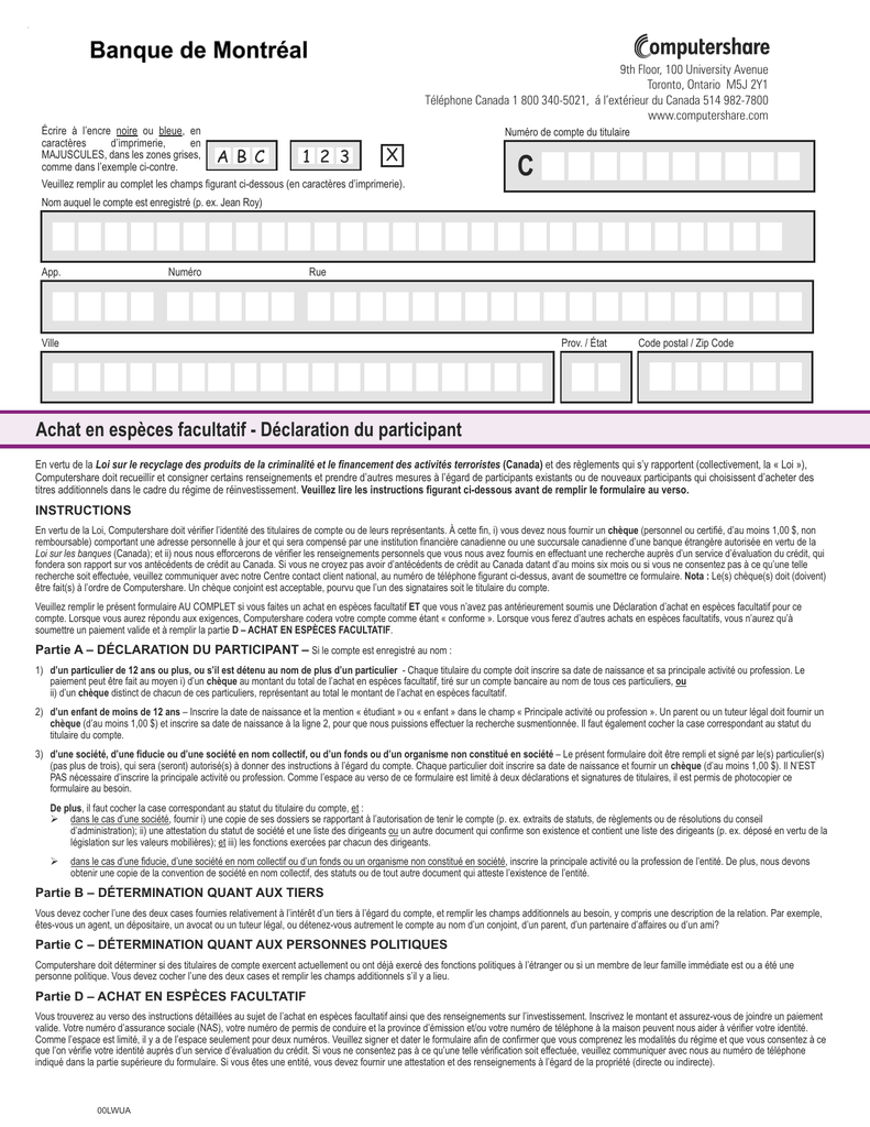 . 9th Floor, 100 University Avenue Toronto, Ontario M5J 2Y1 Téléphone Canada 1 800 340-5021, á l’extérieur du Canada 514 982-7800 www.computershare.com Écrire à l’encre noire ou bleue, en caractères d’imprimerie, en MAJUSCULES, dans les zones grises, A B C X 1 2 3 comme dans l’exemple ci-contre. Veuillez remplir au complet les champs figurant ci-dessous (en caractères d’imprimerie). Numéro de compte du titulaire C Nom auquel le compte est enregistré (p. ex. Jean Roy) Numéro App. Rue Prov. / État Ville Code postal / Zip Code Achat en espèces facultatif - Déclaration du participant En vertu de la Loi sur le recyclage des produits de la criminalité et le financement des activités terroristes (Canada) et des règlements qui s’y rapportent (collectivement, la « Loi »), Computershare doit recueillir et consigner certains renseignements et prendre d’autres mesures à l’égard de participants existants ou de nouveaux participants qui choisissent d’acheter des titres additionnels dans le cadre du régime de réinvestissement. Veuillez lire les instructions figurant ci-dessous avant de remplir le formulaire au verso. INSTRUCTIONS En vertu de la Loi, Computershare doit vérifier l’identité des titulaires de compte ou de leurs représentants. À cette fin, i) vous devez nous fournir un chèque (personnel ou certifié, d’au moins 1,00 $, non remboursable) comportant une adresse personnelle à jour et qui sera compensé par une institution financière canadienne ou une succursale canadienne d’une banque étrangère autorisée en vertu de la Loi sur les banques (Canada); et ii) nous nous efforcerons de vérifier les renseignements personnels que vous nous avez fournis en effectuant une recherche auprès d’un service d’évaluation du crédit, qui fondera son rapport sur vos antécédents de crédit au Canada. Si vous ne croyez pas avoir d’antécédents de crédit au Canada datant d’au moins six mois ou si vous ne consentez pas à ce qu’une telle recherche soit effectuée, veuillez communiquer avec notre Centre contact client national, au numéro de téléphone figurant ci-dessus, avant de soumettre ce formulaire. Nota : Le(s) chèque(s) doit (doivent) être fait(s) à l’ordre de Computershare. Un chèque conjoint est acceptable, pourvu que l’un des signataires soit le titulaire du compte. Veuillez remplir le présent formulaire AU COMPLET si vous faites un achat en espèces facultatif ET que vous n’avez pas antérieurement soumis une Déclaration d’achat en espèces facultatif pour ce compte. Lorsque vous aurez répondu aux exigences, Computershare codera votre compte comme étant « conforme ». Lorsque vous ferez d’autres achats en espèces facultatifs, vous n’aurez qu’à soumettre un paiement valide et à remplir la partie D – ACHAT EN ESPÈCES FACULTATIF. Partie A – DÉCLARATION DU PARTICIPANT – Si le compte est enregistré au nom : 1) d’un particulier de 12 ans ou plus, ou s’il est détenu au nom de plus d’un particulier - Chaque titulaire du compte doit inscrire sa date de naissance et sa principale activité ou profession. Le paiement peut être fait au moyen i) d’un chèque au montant du total de l’achat en espèces facultatif, tiré sur un compte bancaire au nom de tous ces particuliers, ou ii) d’un chèque distinct de chacun de ces particuliers, représentant au total le montant de l’achat en espèces facultatif. 2) d’un enfant de moins de 12 ans – Inscrire la date de naissance et la mention « étudiant » ou « enfant » dans le champ « Principale activité ou profession ». Un parent ou un tuteur légal doit fournir un chèque (d’au moins 1,00 $) et inscrire sa date de naissance à la ligne 2, pour que nous puissions effectuer la recherche susmentionnée. Il faut également cocher la case correspondant au statut du titulaire du compte. 3) d’une société, d’une fiducie ou d’une société en nom collectif, ou d’un fonds ou d’un organisme non constitué en société – Le présent formulaire doit être rempli et signé par le(s) particulier(s) (pas plus de trois), qui sera (seront) autorisé(s) à donner des instructions à l’égard du compte. Chaque particulier doit inscrire sa date de naissance et fournir un chèque (d’au moins 1,00 $). Il N’EST PAS nécessaire d’inscrire la principale activité ou profession. Comme l’espace au verso de ce formulaire est limité à deux déclarations et signatures de titulaires, il est permis de photocopier ce formulaire au besoin. De plus, il faut cocher la case correspondant au statut du titulaire du compte, et : dans le cas d’une société, fournir i) une copie de ses dossiers se rapportant à l’autorisation de tenir le compte (p. ex. extraits de statuts, de règlements ou de résolutions du conseil d’administration); ii) une attestation du statut de société et une liste des dirigeants ou un autre document qui confirme son existence et contient une liste des dirigeants (p. ex. déposé en vertu de la législation sur les valeurs mobilières); et iii) les fonctions exercées par chacun des dirigeants. dans le cas d’une fiducie, d’une société en nom collectif ou d’un fonds ou un organisme non constitué en société, inscrire la principale activité ou la profession de l’entité. De plus, nous devons obtenir une copie de la convention de société en nom collectif, des statuts ou de tout autre document qui atteste l’existence de l’entité. Partie B – DÉTERMINATION QUANT AUX TIERS Vous devez cocher l’une des deux cases fournies relativement à l’intérêt d’un tiers à l’égard du compte, et remplir les champs additionnels au besoin, y compris une description de la relation. Par exemple, êtes-vous un agent, un dépositaire, un avocat ou un tuteur légal, ou détenez-vous autrement le compte au nom d’un conjoint, d’un parent, d’un partenaire d’affaires ou d’un ami? Partie C – DÉTERMINATION QUANT AUX