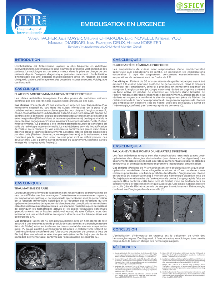 EMBOLISATION EN URGENCE VANIA TACHER, JULIE MAYER, MÉLANIE CHIARADIA, LUIGI NOVELLI, KETSAKIN YOU, MARJANE DJABBARI, JEAN-FRANÇOIS DEUX, HICHAM KOBEITER Service d’imagerie médiale, CHU Henri-Mondor, Créteil INTRODUTION CAS CLINIQUE 3 L’embolisation est l’intervention urgente la plus fréquente en radiologie interventionnelle. Elle implique le plus souvent le pronostic vital immédiat des patients. Le radiologue est un acteur majeur dans la prise en charge de ces patients depuis l’imagerie diagnostique, jusqu’au traitement. L’embolisation d’hémostase est une décision multidisciplinaire prise en fonction de l’état clinique du patient, de l’imagerie et des potentiels risques encourus. Voici quatre cas illustratifs. PLAIE D’ARTÈRE FÉMORALE PROFONDE CAS CLINIQUE 1 PLAIE DES ARTÈRES MAMMAIRES INTERNE ET EXTERNE Les plaies artérielles iatrogènes lors des poses de cathéters veineux centraux par des abords sous-claviers sont rares (0.5% des cas). Cas clinique : Patiente de 27 ans explorée en urgence pour l’apparition d’un hématome extensif du cou dans les suites immédiates de la pose d’un cathéter veineux central sous-clavier gauche pour dialyse. L’angioscanner (A, coupe coronale) montre un hématome associé à une fuite active de produit de contraste (tête de flèche) depuis des branches des artères mamaire interne et externe gauches (flèches bleue et jaune respectivement). Le risque vital de la patiente était engagé avec 2 risques majeurs: 1- compression trachéale, 2- choc hypovolémique. La patiente a été immédiatement intubée et transférée en salle de radiologie interventionnelle. Le cathétérisme suivi de l’opacification de l’artère sous clavière (B, vue coronale) a confirmé les plaies vasculaires (flèches bleue et jaune respectivement). Ces deux artères ont été embolisées par des coils (flèches bleue et jaune respectivement) et le traitement a été complété par la pose d’un stent couvert pour exclure définitivement ces deux artères. Ceci a permis l’arrêt immédiat du saignement, confirmé par les images de l’angiographie finale (C). Les amputations de cuisse sont responsables d’une morbi-mortalité supérieure aux amputations de jambe. En particulier, les complications vasculaires à type de saignement concernent essentiellement les amputations de cuisse et sont de l’ordre de 7 %. Cas clinique : Patient de 58 ans en attente de gree hépatique ayant été amputé à la cuisse pour une prothèse de genou infectée. Dans le décours immédiat de l’amputation, celui-ci a présenté un hématome expansif du moignon. L’angioscanner (A, coupe coronale) réalisé en urgence a révélé un fuite active de produit de contraste au dépends d’une branche de l’artère fémorale profonde responsable du saignement. L’artériographie (B) réalisée en urgence a confirmé le site du saignement (tête de flèche). Le cathétérisme de la branche responsable du saignement a permis de réaliser une embolisation sélective (tête de flèche) avec des coils jusqu’à l’arrêt de l’hémorragie, confirmé par l’artériographie de contrôle (C). CAS CLINIQUE 4 FAUX ANÉVRISME ROMPU D’UNE ARTÈRE DIGESTIVE Les faux anévrismes rompus sont des complications rares mais graves postopératoires des chirurgies abdominales (vasculaires et/ou digestives). Les saignements artériels actifs post-opératoires amènent à être explorés et traités en urgence et ce majoritairement en première intention par embolisation. CAS CLINIQUE 2 TRAUMATISME DE RATE Cas clinique : Patiente de 74 ans présentant une déglobulisation aigue postopératoire immédiate d’une allogree aortique et d’une duodenectomie réalisées pour traitrer une fistule prothéto-duodénale. L’angioscanner réalisé en urgence (A, coupe coronale) a montré une hémorragie digestive (tête de flèche) depuis une branche de l’artère jéjunale droite. L’angiographie faite en urgence (B) a confirmé cette fuite (tête de flèche) mise en évidence lors du cathétérisme de l’artère mésentérique supérieure. Une embolisation sélective par coils (tête de flèche) a permis de stopper immédiatement l’hémorragie, confirmé sur l’angiographie de contrôle (C). Les traumatismes fermés de l’abdomen sont responsables de traumatisme de rate dans 47% des cas. Les avantages d’un traitement conservateur en urgence, par embolisation splénique, par rapport à la splénectomie sont : la préservation de la fonction immunitaire splénique et la réduction des infections du site opératoire, du nombre de laparotomie blanche et des complications immédiates et tardives relatives aux laparotomies. Les scanners multiphasiques permettent de distinguer: les hémorragies actives et les plaies vasculaires contenues (pseudo-anévrismes et fistules artério-veineuses) de rate. Celles-ci sont des indications à une embolisation en urgence dont le succès thérapeutique est de l’ordre de 87%. Cas clinique : Patient de 42 ans polytraumatisé avec un hématome de rate associé à une extravasation de produit de contraste intra-parenchymateuse (tête de flèche) mise en évidence au temps portal du scanner corps entier initial (A, coupe axiale). L’artériographie (B) après le cathétérisme sélectif de l’artère splénique a confirmé une fuite active de produit de contraste (tête de flèche). Une embolisation sélective par coils (tête de flèche) a permis l’arrêt immédiat de l’hémorragie, confirmé par l’angiographie de contrôle (C). CONCLUSION L’embolisation d’hémostase en urgence est le traitement de choix des hémorragies aigues. Du diagnostic à l’embolisation, le radiologue joue un rôle majeur dans la prise en charge des hémorragies aigues. RÉFÉRENCES 1. Uyeda JW, LeBedis CA, Penn DR, Soto JA, Anderson SW. Ac ve hemorrhage and vascular injuries in splenic trauma: u lity of the arterial phase in mul detector CT. Radiology 2