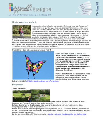 Sortir avec son enfant Introduction d’une réflexion sur la notion du temps, celui que l’on perçoit subjectivement, qui échappe toujours, celui dont on manque, mais aussi celui que l’on peut choisir, pour soi, seul, mais aussi comment on veut le passer et avec qui. L’angle retenu pour illustrer, étayer le temps, est celui d’un inventaire des espaces en plein air, faciles d’accès, beaux, gratuits dans le monde rural ou urbain… pour passer du « bon temps »… Il n’est peut être pas aussi inaccessible qu’on le croit et on peut choisir d’en prendre soin ! Loin des tentations marchandes et des injonctions à passer du temps ensemble « parents et enfants », avec ces propositions de sites ludiques et gratuits, il est davantage question de découvrir des lieux accessibles … pour soi, avec les personnes de son choix, et sans professionnels ! Être parent, c’est aussi prendre du temps pour soi, pour se reposer, se détendre, se promener, rêver, … seul ou entouré. Sûr que les bénéfices seront multiples… ! Finistère : des aires pour prendre l’air ! Sortir avec son enfant. Oui mais où ? Après l’école, le mercredi ou le week-end, s’il ne pleut pas (ou juste un peu !), qu’il est bon de sortir avec son enfant, prendre l’air, le regarder se dégourdir les jambes, jouer, découvrir. Pour une demi-heure, une après-midi, une journée, voici une suggestion de lieux aménagés et gratuits où se rendre avec vos enfants. Tour d’horizon finistérien. Dans le département, une sélection de parcs et jardins qui peut être complétée par vos adresses et ainsi rendre le plus complet possible la liste pour découvrir de nouveaux buts-promenade ! N’hésitez pas à partager vos informations. Douarnenez > Les Plomac’h Espace naturel protégé d’une superficie de 20 hectares, les Plomarc’h sont en libre accès au public. Entouré de champs et de pâturages, c’est un endroit de détente entre terre et mer : un décor magnifique en fond de baie de Douarnenez ! Ferme avec espèces animales protégées : vache pie noire, poule Coucou de Rennes, porc blanc de l’ouest… Promenade, site gallo-romain, avec ses cuves à salaison, jardin des simples pour y respirer romarin, sauge, marjolaine… Le site est ouvert 24/24, 7/7 (entrée gratuite) – Accès : rue Jean Jaurès prendre rue du Carrefour. Brest et alentours > Bois de Keroual : situé entre Brest et Guilers, il offre une espace de randonnées pour chercher le loup, cueillir des champignons, ramasser des feuilles, admirer les plantes et les canards. L’aire de jeux réaménagée en avril propose des activités pour les enfants et même pour les grands « enfants » avec des équipements de fitness d’extérieur. (Plusieurs entrées tout autour du bois – pour le parking le plus près des jeux direction du Manoir de Keroual – entrée du chemin rue de la Croix rouge) > Jardin Kennedy : équipé de deux aires de jeux (dont une avec de nouveaux jeux électroniques pour les 8/15 ans), le jardin Kennedy ente la gare et le Quartz peut convenir aux plus jeunes comme aux plus grands. Des rampes pour le skate board sont aussi installées. > Place Wilson : avec ses toboggans, balançoires, toupies et autres jeux sur ressorts, l’aire de la place Wilson est source d’inspiration et de défoulement. > Parc Arc’hantel : au milieu des arbres et des pelouses, les allées sont un bon terrain pour faire rouler son vélo ou son tricycle. Les emprunter mène vers trois aires de jeux : pour les petits, les moyens et les grands. (Une entrée – route de Kervallan) > Vallon du Stang Alar : C’est dans le vallon du Stang Alar que se situe le jardin botanique, occasion de découvrir 1001 plantes. La promenade peut se prolonger, être complétée, se terminer par un tour sur les aménagements non loin où les enfants se partagent tourniquet, balançoires, « toile d’araignée » à escalader... (Une des entrées par la rampe du Stang Alar) > Rives de Penfeld : Au bord de la rivière la Penfeld, marcheurs, vélos, rollers, trottinettes se côtoient et les trois aires de jeux accueillent les enfants. Quant aux espaces d’herbe ils sont une invitation à se détendre ou faire des passes de ballon. (Plusieurs accès possibles dont (le parking au bout de la rue de Normandie) > Parc de Kervallon : étendu sur près de 3 hectares, les chemins de promenade y sont nombreux. Deux aires de jeux, une pour les tout-petits, une pour les plus grands proposent des jeux classiques. Et un château fort en bois avec ses tunnels, réveille en chaque enfant la princesse ou le chevalier qu’il rêve d’être. (Plusieurs accès au parc possibles dont (celui situé rive droite rue Hegel face au Patronage laïque de la Cavale Blanche) > Cours d’Ajot et le jardin de l’académie : Surplombant le port, ils offrent une vue sur la rade et les plus petits pourront s’essayer sur les jeux récemment aménagés pour eux. > Plage du moulin blanc : outre les pâtés sur le sable, les enfants pourront s’en donner à cœur joie sur les pyramides de cordes à escalader et les jeux pour les petits. > Jardin des explorateurs : Il abrite des espèces botaniques rapportées des quatre coins du monde par des explorateurs et des botanistes partis de Brest. L’occasion de découvrir avec les petits explorateurs des plantes et pourquoi pas, de faire une partie de cache-cache dans les allées (Sur la rive droite – une des entrées rue de la pointe). > Le Fort du Questel : Situé à proximité de l’hôpital de la Cavale blanche, le fort du Questel est un lieu plein de recoins. On peut se promener à l’extérieur, mais aussi à l’intérieur (souterrains, escaliers…) – (Entrée rue Pierre-Maximin Audemar) > Et aussi, les jardin Rosenbaum ((une entrée rue du Moulin à poudre) et jardin de Kérinou (quartier de Kérinou – (entrée place Jo Tanguy) ; le jardin de Kerbonne (rive droite – (une entrée rue Amérigo Vespucci), le Parc d’Eo