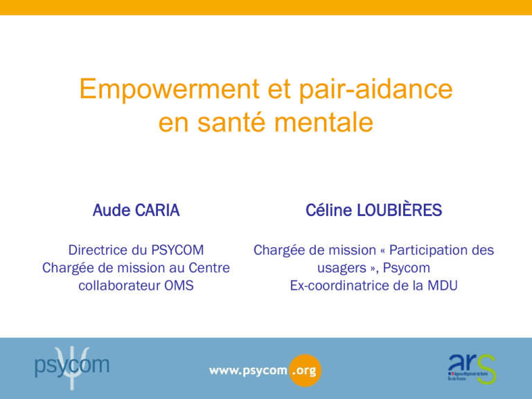 Empowerment et pair-aidance en santé mentale Aude CARIA Céline LOUBIÈRES Directrice du PSYCOM Chargée de mission au Centre collaborateur OMS Chargée de mission « Participation des usagers », Psycom Ex-coordinatrice de la MDU Missions du Psycom Informer pour participer à la prévention • • • Brochures Guides des services de santé mentale Site internet www.psycom.org Communiquer pour lutter contre la stigmatisation • • Travail avec les medias (espace presse) Semaine d’information sur la santé mentale Former pour favoriser la participation citoyenne • Actions de formations construites et mises en œuvre avec des usagers et des proches La patiente au psychiatre : « Vous comprenez docteur, vous et moi on forme une équipe contre la maladie » Le psychiatre à la patiente : « Ah bon ? Et vous faîtes quoi vous dans l’équipe ? » Eléments de contexte • Peu d’actions de promotion de la santé mentale en France • Des attentes fortes de la part des usagers et un besoin de structurer leur demande (associations) • Leur savoir-faire et leur expérience de la maladie et du rétablissement trop peu pris en compte • Des politiques de santé mentale qui se fondent encore trop sur une vision passive et individualisée des « patients/usagers » Et pourtant au niveau international • L’article 4 de la Déclaration d’Alma-Ata sur les soins de santé primaire stipule que « tout être humain a le droit et le devoir de participer individuellement et collectivement à la planification et à la mise en oeuvre des soins de santé qui lui sont destinés. » • L’empowerment est l’une des 5 priorités définies par l’OMS en 2005 dans son Plan d’actions pour la santé mentale en Europe Définir l’empowerment en santé mentale « L’empowerment fait référence au niveau de choix, de décision, d’influence et de contrôle que les usagers des services de santé mentale peuvent exercer sur les événements de leur vie. (…) La clé de l’empowerment se trouve dans la transformation des rapports de force et des relations de pouvoir entre les individus, les groupes, les services et les gouvernements » (OMS, 2006) Les dimensions du concept • L’interdépendance • L’écologie des relations • Le respect et la dignité des personnes • L’information partagée • La participation • Le soutien mutuel • L’autodétermination • L’autogestion Les dimensions du concept L’empowerment désigne : • la succession d’étapes par lesquelles un individu ou une collectivité s’approprie le pouvoir • et la capacité de l’exercer de façon autonome Les deux niveaux d’empowerment • L’empowerment individuel des personnes – – – – • Garantir et renforcer l’autonomie et la participation dans la relation de soins et d’accompagnement Former les personnes (information, éducation thérapeutique) Valoriser et tenir compte de leur savoir expérientiel Créer les espaces de communication garantissant la voix de l’usager L’empowerment organisationnel – – – – Former les professionnels Repenser l’organisation des services dans une logique de coconstruction des réponses aux besoins Garantir la représentation et le pouvoir des usagers Utiliser les médias comme vecteur d’évolution des représentations sociales de la maladie mentale Un changement radical d’organisation du système de santé mentale VERS ... DE ... Soins Focus Institutions / Asiles Soins dans la communauté Hôpitaux Cercles de soutiens multiples, équipes mobiles de coordination Paternalisme, hiérarchie Approches horizontales, partenariats équitables Soin Rétablissement (Recovery) Traitement de la maladie Promotion et maintien des capacités (life skills) Coercition Coopération, contrat de soins Modèle bio-médical Modèle holistique / bio-psycho-social Contrôle Auto-détermination et autonomie Empowerment in Mental Health – working together towards Leadership WHO-EURO 2011 Un changement radical des rôles DE ... Professionnel Usager des services Aidant VERS ... Soignant Facilitateur / médiateur “Fou”, “Malade mental” Usager des services, citoyen Comme un objet Comme un sujet Défini en termes de déficits Défini en termes de possiblités Exclu du soin Devenant un partenaire du soin Empowerment in Mental Health – working together towards Leadership WHO-EURO 2011 Les leviers politiques de l’action • • • • • • Favoriser la prise de conscience et les changements positifs pour les usagers et les familles, l’environnement social, les pouvoirs publics et les agences gouvernementales; Conduire des politiques et des activités de promotion des droits et d’inclusion effective des personnes souffrants de troubles de santé mentale; Réduire la stigmatisation de la maladie et la discrimination qui en résulte Produire une information ciblée, claire et loyale permettant aux usagers et à leurs proches de décider et d’exprimer leur choix concernant les soins, le traitement et les services; Favoriser la représentation des associations d’usagers et des aidants naturels à tous les échelons de décision; Soutenir les organisations (associations, agences) qui mettent véritablement en œuvre l’empowerment et la défense des droits des personnes. Les leviers opérationnels en France • La place des associations d’usagers • Les groupes d’entraide mutuelle • Les conseils locaux de santé mentale • Les maisons des usagers • Les médiateurs pairs de santé • Les actions de sensibilisation et de déstigmatisation (SISM, CCOMS-France, Enquête SMPG) …etc. • Les notions voisines • Le rétablissement « Le rétablissement est la reconquête des territoires perdus à la suite d’un problème de santé mentale et la découverte des ressources, souvent insoupçonnées, ouvrant de nouveaux horizons » Ethuin cité par Le Cardinal, 2006 • Pair-aidance / pair-émulation / médiateurs-pairs: « Principe d’entraide e