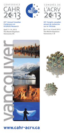 22e Congrès canadien annuel de recherche sur le VIH/sida April 11-14, 2013 The Westin Bayshore Vancouver, BC Du 11 au 14 avril 2013 The Westin Bayshore Vancouver, C-B vancouver 22nd Annual Canadian Conference on HIV/AIDS Research www.cahr-acrv.ca The Canadian Association for HIV Research welcomes you to its 22nd Annual Canadian Conference on HIV/AIDS Research! L’Association canadienne de recherche sur le VIH/sida vous souhaite la bienvenue à son 22e Congrès canadien annuel de recherche sur le VIH/sida ! Innovations to Address Complex Challenges Idées nouvelles pour relever les défis complexes CAHR would like to take this opportunity to welcome you to the 22nd Annual Canadian Conference on HIV/AIDS Research – CAHR 2013. Once again, CAHR will have a stellar program of world-renowned speakers, allowing you to connect with researchers, frontline public health and community-based workers, policy makers, people living with HIV and AIDS, and others interested in the field of HIV research. We thank you for your active participation as well as the over 100 volunteers who have contributed their time and talents — as committee members, reviewers, sponsors, rapporteurs and on-site volunteers. L’ACRV aimerait profiter de cette occasion pour vous souhaiter la bienvenue au 22e Congrès canadien annuel de recherche sur le VIH (congrès de l’ACRV 2013). Cette année encore, le programme exceptionnel du congrès, dans lequel figurent notamment des conférenciers de renommée mondiale, favorisera l’établissement de liens entre les chercheurs, les travailleurs de la santé publique de première ligne, les travailleurs communautaires, les décideurs, les personnes vivant avec le VIH/sida et d’autres personnes s’intéressant au domaine de la recherche sur le VIH. Nous vous remercions de votre participation active et sommes reconnaissants envers la centaine de bénévoles – membres des comités, examinateurs, commanditaires, rapporteurs et bénévoles sur place – pour le temps et les compétences qu’ils ont généreusement consacrés à l’événement. Connect with CAHR online! Suivez l’ACRV en ligne! CanadianAssociationforHIVResearch CAHR_ACRV CAHRACRV 22nd Annual Canadian Conference on HIV/AIDS Research 1 Table of Contents / Table des matières Saturday Sunday Sponsoring Organizations www.cahr-acrv.ca Friday Association canadienne de recherche sur le VIH 1, rue Rideau, Poste 744 Ottawa (Ontario) K1N 8S7 Courriel : [email protected] Téléphone : 613-670-5842 Thursday Canadian Association for HIV Research One Rideau Street, Suite 744 Ottawa, ON K1N 8S7 Email: [email protected] Telephone: 613-670-5842 Exhibition Oral Presentations / Exposés oraux....................................... 113 Friday, April 12 / Vendredi 12 avril....................................... 115 Saturday, April 13 / Samedi 13 avril....................................129 Posters / Affiches....................................................................143 Author Index / Index des auteurs............................................ 211 Next Year’s Conference / Congrès de l’an prochain................239 Downtown Map / Plan du centre-ville.....................................240 Venue Plan / Plan du lieu................................Inside Back Cover Troisième de couverture Program at a Glance / Programme en bref................ Back Cover Couverture arrière Conference Information Programme en français..........................................................55 Table des matières...................................................................55 Welcome CAHR Thanks Our Sponsors and Supporters L’ACRV remercie ses partenaires et ses commanditaires.......2 Glossary of Terms and Acronyms...............................................3 Welcome to CAHR 2013.............................................................4 Message from the CAHR President........................................4 Message from the Co-Chairs of CAHR 2013..........................5 Appreciation of Volunteers......................................................6 CAHR Committees.................................................................6 CAHR 2013 Awards and Scholarships....................................8 Conference Information............................................................ 11 Exhibition..................................................................................15 Conference Program.................................................................16 Wednesday, April 10.............................................................16 Thursday, April 11.................................................................17 Friday, April 12......................................................................28 Saturday, April 13..................................................................36 Sunday, April 14....................................................................47 Sponsoring Organizations’ Profiles...........................................50 Exhibition Conference Information Welcome 2 22nd Annual Canadian Conference on HIV/AIDS Research CAHR Thanks Our Sponsors and Supporters / L’ACRV remercie ses partenaires et ses commanditaires The Canadian Association for HIV Research (CAHR) gratefully acknowledges the companies and organizations that have generously supported the 22nd Annual Canadian Conference on HIV/AIDS Research (CAHR 2013). L’Association canadienne de recherche sur le VIH (ACRV) remercie les entreprises et les organismes qui ont généreusement offert leur appui au 22e Congrès canadien annuel de recherche sur le VIH/sida. Super Platinum / Super Platine ViiV Healthcare ULC / ViiV Soins de santé ULC Government of Canada Gouvernement du Canada Thursday Platinum / Platine Bristol-Myers Squibb Canada Merck Gold / Or Friday Canadian Institutes of Health Research Instituts de recherche en santé du Canada Gilead Sciences Canada Janssen Pharmaceutical Companies Entreprises pharmac