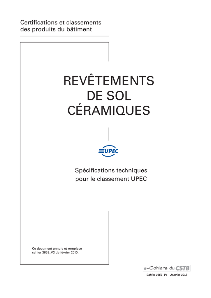 Certifications et classements des produits du bâtiment REVÊTEMENTS DE SOL CÉRAMIQUES Spécifications techniques pour le classement UPEC Ce document annule et remplace cahier 3659_V3 de février 2010. Cahier 3659_V4 – Janvier 2012 Toute reproduction ou représentation intégrale ou partielle, par quelque procédé que ce soit, des pages publiées dans le présent ouvrage, faite sans l’autorisation de l’éditeur ou du Centre Français d’Exploitation du droit de copie (3, rue Hautefeuille, 75006 Paris), est illicite et constitue une contrefaçon. Seules sont autorisées, d’une part, les reproductions strictement réservées à l’usage du copiste et non destinées à une utilisation collective et, d’autre part, les analyses et courtes citations justifiées par le caractère scientifique ou d’information de l’œuvre dans laquelle elles sont incorporées (Loi du 1er juillet 1992 - art. L 122-4 et L 122-5 et Code Pénal art. 425). © CSTB 2012 Spécifications techniques pour le classement UPEC SOMMAIRE Avertissement .............................................................. 3 1 Préambule .............................................................. 5 2 Terminologie........................................................... 5 3 Rappels sommaires relatifs au classement UPEC.............................................. 6 4 Contenu des lettres U, P, E et C............................. 6 4.1 Signification de « U » ............................................ 6 4.2 Signification de « P » ............................................. 6 4.3 Signification de « E » ............................................. 6 4.4 Signification de « C » ............................................. 6 5 Spécifications pour le classement d’usage des revêtements de sol céramiques .................... 6 5.1 Spécifications dimensionnelles communes générales ............................................ 7 5.2 Spécifications pour le classement U .................... 7 5.3 Spécifications pour le classement P..................... 8 5.4 Spécifications pour le classement E................... 10 5.5 Spécifications pour le classement C .................. 10 5.6 Cas particulier des carreaux lisses non émaillés polis ................................................ 10 Annexe 1 ......................................................................11 Annexe 2.......................................................................11 Annexe 3.......................................................................11 Annexe 4.......................................................................11 Annexe 5.......................................................................11 Annexe 6...................................................................... 14 Annexe 7...................................................................... 15 Annexe 8...................................................................... 15 Annexe 9...................................................................... 16 Annexe 10 .................................................................... 16 e-Cahiers du CSTB -1- Cahier 3659_V4 – Janvier 2012 e-Cahiers du CSTB -2- Cahier 3659_V4 – Janvier 2012 Avertissement – l’aménagement des spécifications de format, d’épaisseur et de flexion en vue du classement P4S ; Le classement UPEC des revêtements de sol est un classement fonctionnel d’usage de l’ensemble des revêtements de sol utilisés dans les ouvrages du bâtiment (cf. § 1 Préambule). Le présent document décrit les spécifications techniques des carreaux céramiques en vue de leur classement UPEC. – l’introduction de l’indice P4+. 5 – l’introduction de la norme NF EN 14411, mai 2004 « Carreaux et dalles céramiques – Définitions, classification, caractéristiques et marquage » ; Historique des modifications 1 e-Cahiers du CSTB 3515 « Revêtements de sol céramiques - Spécifications techniques pour le classement UPEC », janvier 2005 constitue le cinquième référentiel. Cette révision comprend : Cahiers du CSTB, cahier 1905, décembre 1983, « Classement UPEC des carreaux céramiques ». – la fusion en un seul document du cahier du CSTB 3243 et de son modificatif, le cahier 3503. Ce premier référentiel technique sert de base à la certification NF-UPEC des carreaux céramiques mise en place en 1986. 2 Cahiers du CSTB, cahier 2898, juillet-août 1996, « Revêtements de sol céramiques - Spécifications techniques pour le classement UPEC ». 6 e-Cahiers du CSTB, cahier 3659 propose un sixième référentiel pour le classement UPEC des carreaux céramique avec un travail sur les éléments suivants : – introduction de spécifications dimensionnelles particulières complémentaires à la NF EN 14411 ; Après l’expérience de plus de dix ans du premier référentiel, sont mises en relief : – certaines insuffisances du point de vue du comportement en œuvre en fonction des locaux revêtus ; – ouverture à de nouveaux formats de carreaux (suivant l’évolution des textes relatifs à la pose) ; – la nécessité d’une actualisation du fait d’une part des évolutions de la normalisation européenne CEN et internationale ISO, d’autre part des produits eux-mêmes. 7 e-Cahiers du CSTB, cahier 3659_V3 de février 2010 consolide le cahier 3659 avec l’ouverture à la revendication U4 aux carreaux Bla décorés par l’introduction d’un nouvel essai au travers de l’annexe 10. 8 e-Cahiers du CSTB, cahier 3659_V4 de janvier 2012 valide le résultat du travail sur les critères dimensionnels. – précision des élancements de carreaux admis pour le classement UPEC. Les principaux changements sont : – l’introduction de l’indice U3S applicable aux carreaux émaillés entrant dans la classe PEI V, elle-même introduite par la norme ISO 10545 partie 7 ; – l’introduction de l’indice P4S applicable aux carreaux non émaillés qui, en sus de la conformit
