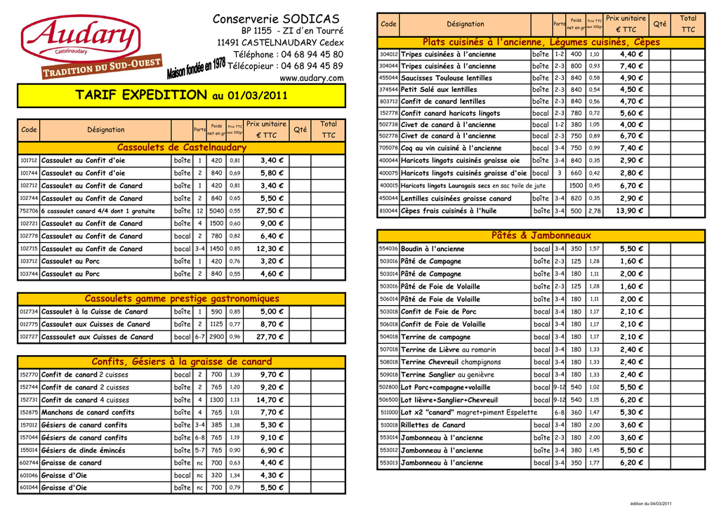 Conserverie SODICAS BP 1155 - ZI d'en Tourré 11491 CASTELNAUDARY Cedex Téléphone : 04 68 94 45 80 Télécopieur : 04 68 94 45 89 www.audary.com TARIF EXPEDITION Code Désignation Parts Poids Prix TTC aux 100gr Prix unitaire € TTC Cassoulets de Castelnaudary Qté Désignation Parts Poids Prix TTC net en gr aux 100gr Prix unitaire € TTC Tripes cuisinées à l'ancienne boîte 1-2 400 1,10 4,40 € 304044 Tripes cuisinées à l'ancienne boîte 2-3 800 0,93 7,40 € 455044 Saucisses Toulouse lentilles boîte 2-3 840 0,58 4,90 € 374544 Petit Salé aux lentilles boîte 2-3 840 0,54 4,50 € 803712 Confit de canard lentilles boîte 2-3 840 0,56 4,70 € 152778 Confit canard haricots lingots bocal 2-3 780 0,72 5,60 € Total 502738 Civet de canard à l'ancienne bocal 1-2 380 1,05 4,00 € TTC 502778 Civet de canard à l'ancienne bocal 2-3 750 0,89 6,70 € 705078 750 0,99 7,40 € 0,35 2,90 € 660 0,42 2,80 € 6,70 € Coq au vin cuisiné à l'ancienne bocal 3-4 101712 Cassoulet au Confit d'oie boîte 1 420 0,81 3,40 € 400044 Haricots lingots cuisinés graisse oie boîte 3-4 840 101744 Cassoulet au Confit d'oie boîte 2 840 0,69 5,80 € 400075 Haricots lingots cuisinés graisse d'oie bocal 102712 Cassoulet au Confit de Canard boîte 1 420 0,81 3,40 € 400015 Haricots lingots Lauragais secs en sac toile de jute 1500 0,45 102744 Cassoulet au Confit de Canard boîte 2 840 0,65 5,50 € 450044 Lentilles cuisinées graisse canard boîte 3-4 820 0,35 2,90 € boîte 12 5040 0,55 27,50 € 810044 Cèpes frais cuisinés à l'huile boîte 3-4 500 2,78 13,90 € 752706 6 cassoulet canard 4/4 dont 1 gratuite 3 102721 Cassoulet au Confit de Canard boîte 4 1500 0,60 9,00 € 102778 Cassoulet au Confit de Canard bocal 2 780 0,82 6,40 € 102715 Cassoulet au Confit de Canard bocal 3-4 1450 0,85 12,30 € 554036 Boudin à l'ancienne bocal 3-4 350 1,57 5,50 € 103712 Cassoulet au Porc boîte 1 420 0,76 3,20 € 503016 Pâté de Campagne boîte 2-3 125 1,28 1,60 € 103744 Cassoulet au Porc boîte 2 840 0,55 4,60 € 503014 Pâté de Campagne boîte 3-4 180 1,11 2,00 € 503016 Pâté de Foie de Volaille boîte 2-3 125 1,28 1,60 € Cassoulets gamme prestige gastronomiques 506014 Pâté de Foie de Volaille boîte 3-4 180 1,11 2,00 € 180 1,17 2,10 € 1,17 2,10 € 012734 Cassoulet à la Cuisse de Canard 012775 Cassoulet aux Cuisses de Canard 102727 Casssoulet aux Cuisses de Canard Pâtés & Jambonneaux boîte 1 590 0,85 5,00 € 503018 Confit de Foie de Porc bocal 3-4 boîte 2 1125 0,77 8,70 € 506018 Confit de Foie de Volaille bocal 3-4 180 bocal 6-7 2900 0,96 27,70 € 504018 Terrine de campagne bocal 3-4 180 1,17 2,10 € 507018 Terrine de Lièvre au romarin bocal 3-4 180 1,33 2,40 € 508018 Terrine Chevreuil champignons bocal 3-4 180 1,33 2,40 € Confits, Gésiers à la graisse de canard Qté Plats cuisinés à l'ancienne, Légumes cuisinés, Cèpes 304012 au 01/03/2011 net en gr Code 152770 Confit de canard 2 cuisses bocal 2 700 1,39 9,70 € 509018 Terrine Sanglier au genièvre bocal 3-4 180 1,33 2,40 € 152744 Confit de canard 2 cuisses boîte 2 765 1,20 9,20 € 502800 Lot Porc+campagne+volaille bocal 9-12 540 1,02 5,50 € 152731 Confit de canard 4 cuisses boîte 4 1300 1,13 14,70 € 506500 Lot lièvre+Sanglier+Chevreuil bocal 9-12 540 1,15 6,20 € 152875 Manchons de canard confits boîte 4 765 1,01 7,70 € 511000 Lot x2 "canard" magret+piment Espelette 360 1,47 5,30 € 6-8 157012 Gésiers de canard confits boîte 3-4 385 1,38 5,30 € 510018 Rillettes de Canard bocal 3-4 180 2,00 3,60 € 157044 Gésiers de canard confits boîte 6-8 765 1,19 9,10 € 553014 Jambonneau à l'ancienne boîte 2-3 180 2,00 3,60 € 155014 Gésiers de dinde émincés boîte 5-7 765 0,90 6,90 € 553012 Jambonneau à l'ancienne boîte 3-4 380 1,45 5,50 € 602744 Graisse de canard boîte nc 700 0,63 4,40 € 553013 Jambonneau à l'ancienne bocal 3-4 350 1,77 6,20 € 601046 Graisse d'Oie bocal nc 320 1,34 4,30 € 601044 Graisse d'Oie boîte nc 700 0,79 5,50 € édition du 04/03/2011 Total TTC Code Désignation Parts Poids Prix TTC net en gr aux 100gr Prix unitaire € TTC Foie Gras de Canard & d'Oie 651712 Foie gras de Canard entier bocal 2-3 130 11,08 14,40 € 651718 Foie gras de Canard entier bocal 3-4 180 10,39 18,70 € 651730 Foie gras de Canard entier bocal 5-6 300 10,03 30,10 € 652713 Bloc de Foie de Canard boîte 2-3 130 5,54 7,20 € 652720 Bloc de Foie de Canard boîte 3-4 200 5,40 10,80 € 761020 Salé-sucré d'oignons frais bocal 3-4 3,37 3,20 € 041011 Cassoulet Gastro. cuisse canard assiette 1 400 041013 Cassoulet Castel. confit canard assiette 1 044911 Confit canard et pdt à la sarladaise assiette 1 048011 Garbure Landaise assiette 048012 Parmentier de canard 048013 Chou farci 95 Qté Adresse de facturation Total TTC (si l'adresse de livraison est différente de celle-ci, merci de nous le préciser) Nom : …………………………………………………………………………………………………………………………………………… Adresse : ……………………………………………………………………………………………………………………………………… ………………………………………………………………………………………………………………………………………………………… Tél :…………………………………………………………………………… ……………………………………………………………………………………………………………………………………………… Code postal : ……………………………Ville : …………………………………………………………………………………… Adresse mail :……………………………………………………………………………………………………………………………. Conformément à la loi infor