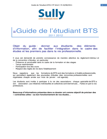 Guide de l’étudiant BTS/ LTP SULLY / R 24/08/2011 Guide de l’étudiant BTS 2011 2012 Objet du guide : donner aux étudiants des éléments d‘information, afin de faciliter l’intégration dans le cadre des études et les premiers pas dans la vie professionnelle. Il vous est demandé de prendre connaissance de manière attentive du règlement intérieur et de la convention d’études, en particulier - Présence et ponctualité dans le cadre de la formation et des stages - Tenue vestimentaire - Participation lors des cours - Respect des règles de vie dans l’établissement Nous rappelons que les formations de BTS sont des formations à finalité professionnelle, qui permettent également des poursuites d’études (des rencontres professionnelles sont organisées chaque année aux mois de janvier : voir agenda). Les étudiants sont invités à participer à la vie des associations ; chaque spécialité de BTS a son association. Les initiatives individuelles et collectives sont bienvenues… Faites en part à vos professeurs. Beaucoup d’informations présentes dans ce dossier ont comme objectif de préciser des « contraintes utiles » au bon fonctionnement de vos études… 1 Guide de l’étudiant BTS/ LTP SULLY / R 24/08/2011 Présentation de l’établissement Organigramme Direction générale: Henri CHASSAGNY (rendez vous à prendre avec Madame Isker ou Madame Ducor) [email protected] - Organisation des devoirs surveillés: Madame Tcherchian (2° étage) [email protected] - Suivi des stages BTS (dont passeport de stage, convention de stage…), assurance, bourses : Madame Ducor (2° étage) educor@ esully.fr - Vie scolaire (absences et retards): Monsieur Payet (RDC) et Monsieur Prats (2° étage) - Paiement de scolarité : Madame Tcherchian (2° étage) [email protected] - Association d’étudiants : voir professeur de spécialité - Coordonnées établissement - Tél LTP: 0491 48 27 87 - Fax LTP: 0491 94 21 32 - Courriel : [email protected] - Site www.ltpsully.com: possibilité de retrait de dossier d’inscription Cycles d’enseignement LTP SULLY ENSEIGNEMENTS (sous contrat) niveaux Bac et Bac+2 NIVEAU IV (BACCALAUREAT) FORMATION CYCLE « Sciences et Technologies de la Gestion» (S.T.G.) − Seconde générale et technologique option « IGC » − 1° S.T.G. spécialité « Communication » − 1° S.T.G. spécialité « Gestion » − Terminale S.T.G. Spécialité « Mercatique - Marketing » − Terminale S.T.G. spécialité « Comptabilité et Finance des entreprises » NIVEAU III (BAC +2) FORMATION CYCLE « BREVET DE TECHNICIEN SUPERIEUR » (B.T.S.) − BTS M.U.C. (Management des Unités Commerciales) − BTS N.R.C. (Négociation et Relation Client) − BTS Assurance − BTS Transport − BTS Comptabilité et Gestion ENSEIGNEMENTS Post- BTS (Hors contrat) niveau Bac+3 − BACHELOR MANAGEMENT – MARKETING – COMMERCE Titre certifié par l’Etat Niveau II (Niveau Licence-Maîtrise) − Bachelor Management Marketing Commerce − Bachelor Management Banque Assurance − Bachelor Management en Immobilier DEMANDE INFORMATION Guy Iozia (bureau 2° étage) au 04 91 94 57 44 ou 061163 09 51 ou [email protected] − LICENCE DCG POST- BTS (HORS CONTRAT) NIVEAU BAC+3 Formation en 2 ans L2 et L3 DEMANDE INFORMATION Patrick BOSI [email protected] 2 Guide de l’étudiant BTS/ LTP SULLY / R 24/08/2011 Les démarches obligatoires 1°/ Inscription sécurité sociale étudiante et bourses: Vous êtes étudiant(e) vous devez adhérer à un centre de sécurité sociale étudiant (MEP ou LMDE) ; les formalités se font à la pré rentrée (voir Mme Ducor). L’établissement est tenu d'encaisser la cotisation forfaitaire sécurité sociale étudiant (sauf dispense, situation d'ayant droit, boursier...) puis de reverser à l'URSSAF le montant global correspondant, et ce dès octobre et au plus tard le 15 décembre. L'URSSAF de Marseille possède un N°de Tel. direct dédié aux étudiants : 04 91 83 52 30 et se tient à votre disposition pour toute précision complémentaire 2°/ Visite médicale obligatoire lors de la première année de BTS (courant des mois de février et mars…) ; Les convocations sont affichées dans le Hall DC). Vous devez : vous présenter à la médecine préventive, muni impérativement de votre carnet de santé (les vaccinations doivent être à jour, pour que la visite médicale soit validée). - présenter à M. PENNETIER votre carte d’étudiant tamponnée par le centre médical. Les frais de la visite médicale sont pris en charge par le lycée. Adresse Visite médicale : 10 place de la Joliette Les Docks Atrium N°10-1 (6° étage) 13002 Marseille Métro ligne 2 sortie Joliette 3°/ Inscription aux examens : réalisée par l’intermédiaire du Lycée. Il vous sera demandé une photocopie de votre carte d’identité, votre attestation de stage et un chèque d’environ 4 euros pour couvrir les frais d’envoi de votre diplôme. 4°/ Le stationnement des cyclomoteurs et motos (deux roues) des élèves et étudiants est permis dans la cour dans les lieux prévus à cet effet. L'établissement dégage toute responsabilité quant aux détériorations, vols ou tout incident liés à ce stationnement. Le moteur doit être arrêté à l'intérieur du lycée (pour entrée et sortie de l'établissement) (voir règlement intérieur). Les élèves et/ou leur famille et étudiants doivent remettre à la pré rentrée une attestation d'assurance au nom de l'intéressé et une carte grise. En cas d'absence de respect des consignes, les détenteurs ne seront pas autorisés à stationner leurs deux roues dans l'enceinte de l'établissement (Voir article 4.4. du RI) 5°/ Vous devez prendre connaissance du règlement intérieur et de la charte informatique. Votre inscription dans l’établissement vaut adhésion aux différents articles de ces textes qui vous sont communiqués dans ce guide. 6°/ La messagerie devra être consultée régulièrement chaque semaine pa
