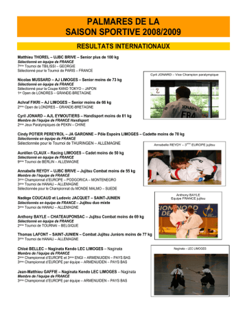 PALMARES DE LA SAISON SPORTIVE 2008/2009 RESULTATS INTERNATIONAUX Matthieu THOREL – UJBC BRIVE – Senior plus de 100 kg Sélectionné en équipe de FRANCE 7ème Tournoi de TBILISSI – GEORGIE Sélectionné pour le Tournoi de PARIS – FRANCE Cyril JONARD – Vice Champion paralympique Nicolas MUSSARD – AJ LIMOGES – Senior moins de 73 kg Sélectionné en équipe de FRANCE Sélectionné pour la Coupe KANO TOKYO – JAPON 1er Open de LONDRES – GRANDE-BRETAGNE Achraf FIKRI – AJ LIMOGES – Senior moins de 66 kg 2ème Open de LONDRES – GRANDE-BRETAGNE Cyril JONARD – AJL EYMOUTIERS – Handisport moins de 81 kg Membre de l’équipe de FRANCE Handisport 2ème Jeux Paralympiques de PEKIN – CHINE Cindy POTIER PEREYROL – JA GARONNE – Pôle Espoirs LIMOGES – Cadette moins de 70 kg Sélectionnée en équipe de FRANCE Sélectionnée pour le Tournoi de THURINGEN – ALLEMAGNE Annabelle REYDY – 3 ème EUROPE jujitsu Aurélien CLAUX – Racing LIMOGES – Cadet moins de 50 kg Sélectionné en équipe de FRANCE 9ème Tournoi de BERLIN – ALLEMAGNE Annabelle REYDY – UJBC BRIVE – Jujitsu Combat moins de 55 kg Membre de l’équipe de FRANCE 3ème Championnat d’EUROPE – PODGORICA – MONTENEGRO 3ème Tournoi de HANAU – ALLEMAGNE Sélectionnée pour le Championnat du MONDE MALMO – SUEDE Nadège COUCAUD et Ludovic JACQUET – SAINT-JUNIEN Sélectionnés en équipe de FRANCE – Jujitsu duo mixte Anthony BAYLE Equipe FRANCE jujitsu 3ème Tournoi de HANAU – ALLEMAGNE Anthony BAYLE – CHATEAUPONSAC – Jujitsu Combat moins de 69 kg Sélectionné en équipe de FRANCE 2ème Tournoi de TOURNAI – BELGIQUE Thomas LAFONT – SAINT-JUNIEN – Combat Jujitsu Juniors moins de 77 kg 3ème Tournoi de HANAU – ALLEMAGNE Chloé BELLEC – Naginata Kendo LEC LIMOGES – Naginata Membre de l’équipe de FRANCE 2ème Championnat d’EUROPE et 3ème ENGI – ARMENUIDEN – PAYS BAS 3ème Championnat d’EUROPE par équipe – ARMENUIDEN – PAYS BAS Jean-Matthieu GAFFIE – Naginata Kendo LEC LIMOGES – Naginata Membre de l’équipe de FRANCE 3ème Championnat d’EUROPE par équipe – ARMENUIDEN – PAYS BAS Naginata – LEC LIMOGES RESULTATS NATIONAUX Matthieu THOREL – UJBC BRIVE – Senior plus de 100 kg 3ème Championnat de FRANCE 1ère division – 1er Tournoi de CHATELLERAULT Jérémy MACHURET – UJBC BRIVE – Senior moins de 60 kg – Niveau national 1ère division Nicolas MUSSARD – AJ LIMOGES – Senior moins de 73 kg – Niveau national 1ère division Cédric DAHAN – UJBC BRIVE – Senior moins de 73 kg – Niveau national 1ère division – 3ème Tournoi de LAVAL Emilie CATOIS – UJBC BRIVE – Senior moins de 48 kg – Niveau national 1ère division Adrien RAYMOND – AJ LIMOGES – Senior moins de 60 kg Niveau national 1ère division – 2ème Tournoi de WASQUEHAL – 3ème du Tournoi de CHATELLERAULT – 3ème Tournoi de NIORT Audrey THOREL – UJBC BRIVE – Senior moins de 78 kg – Niveau national 1ère division – 1ère Tournoi de LAVAL Stéphanie FAURE – AJL LINARDS – Senior moins de 57 kg – Niveau national 1ère division – 3ème Tournoi de CHATELLERAULT Adil FIKRI – AJ LIMOGES – Senior moins de 100 kg – Niveau national 1ère division Achraf FIKRI – AJ LIMOGES – Senior moins de 66 kg Niveau national 1ère division – 2ème Championnat de FRANCE FFSU – 1er Tournoi de NIORT Alliance Judo LIMOGES – 3ème Coupe de FRANCE entreprises « équipes régionales mixtes » Romain EYSSARTIER – ACTISPORT– Senior moins de 60 kg – 1er Coupe de FRANCE entreprises Aubin DOH – JC SAINT-YRIEIX – Senior moins de 90 kg – 3ème Coupe de FRANCE entreprises Cyril JONARD – AJ LIMOGES – Senior moins de 81 kg – 3ème Coupe de FRANCE entreprises Gaylor GOURONG – Union Judo CAS – Senior moins de 81 kg – 2ème Coupe nationale 3ème division Pierre BECHADE – AJL BOSMIE – Senior moins de 73 kg – 3ème Coupe nationale 3ème division Raymond GORDIEN – Judo en MARCHE – Vétérans plus de 60 ans – moins de 90 kg – 1er Masters TOURS Cyril JONARD – Handisport LIMOGES – Handisport moins de 81 kg 1er Championnat de FRANCE « handisport » et « sourds » – 1er Championnat de FRANCE « toutes catégories » Fabien BOUTAREL – Handisport LIMOGES – Handisport plus de 100 kg 2ème Championnat de FRANCE « sourds » et 3ème Championnat de FRANCE « toutes catégories » Benoît VERGOS – Handisport LIMOGES – Handisport moins de 100 kg 2ème Championnat de FRANCE « handisport » et 3ème Equipe AJL « entreprises » Championnat de FRANCE « sourds » Stéphanie FAURE – AJL LINARDS – Junior moins de 57 kg 1ère Tournoi d’AIX en PROVENCE – 3ème Tournoi de NANTES – 4ème Circuit national juniors Fanny POSVITE – AJL PIERRE-BUFFIERE – Junior moins de 70 kg Niveau national FFJDA – 1ère Tournoi de NANTES – 6ème Circuit national juniors Lise ANDRIEUX – Racing LIMOGES – Junior moins de 44 kg – Niveau national FFJDA Mélanie BIALOUX – Judo en MARCHE – Junior moins de 63 kg – Niveau national FFJDA Cindy POTIER PEREYROL – JA GARONNE – Pôle Espoirs LIMOGES – Junior moins de 70 kg– Niveau national FFJDA Lydie PINARDON – AJL GARTEMPE – Junior moins de 78 kg – Niveau national FFJDA Arnaud DURCOS – AJL BOSMIE – Junior moins de 66 kg – Niveau national FFJDA Florian SEGUIN – AJL BOSMIE – Junior moins de 60 kg – Niveau national FFJDA Pierre BECHADE – AJL BOSMIE – Junior moins de 73 kg– Niveau national FFJDA Anthony MARTIN – AJL SAINT-JOUVENT – Junior moins de 90 kg – Niveau national FFJDA Alban SAULE – MALEMORT – Junior plus de 100 kg – Niveau national FFJDA Aurélien CLAUX – Racing LIMOGES – Cadet moins de 50 kg – 3ème Championnat de FRANCE FFJDA Matthieu LAVALEUR – JA GARONNE – Pôle Espoirs LIMOGES – Cadet moins de 90 kg Niveau national FFJDA – 7ème Championnat de FRANCE UNSS « RENOIR LIMOGES » – 1er Tournoi de NIMES – 2ème Tournoi de CLERMO