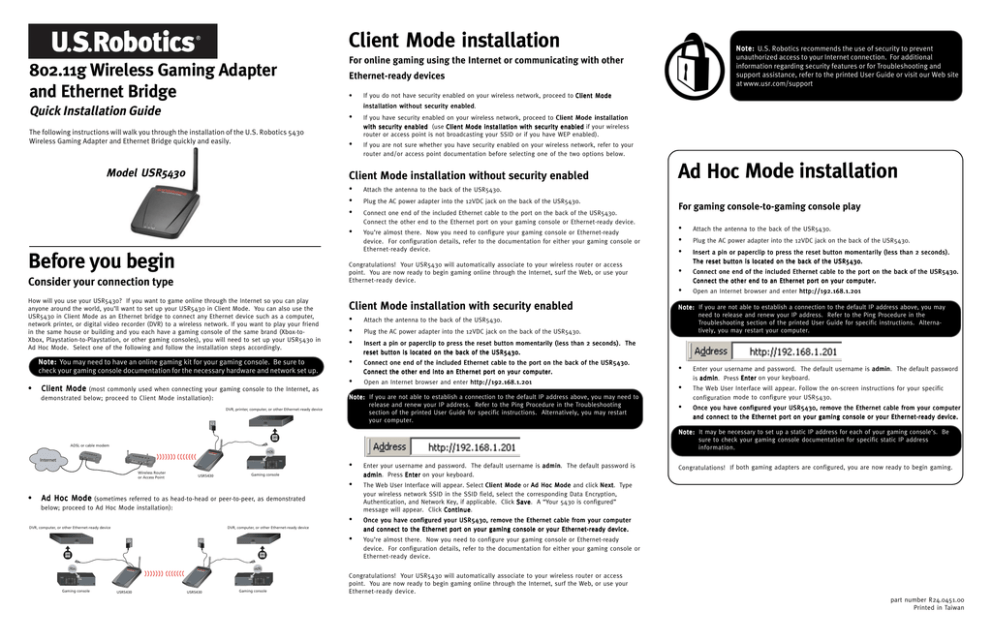 Client Mode installation 802.11g Wireless Gaming Adapter and Ethernet Bridge For online gaming using the Internet or communicating with other Ethernet-ready devices • If you do not have security enabled on your wireless network, proceed to Client Mode installation without security enabled enabled. Quick Installation Guide • The following instructions will walk you through the installation of the U.S. Robotics 5430 Wireless Gaming Adapter and Ethernet Bridge quickly and easily. Model USR5430 • If you have security enabled on your wireless network, proceed to Client Mode installation with security enabled (use Client Mode installation with security enabled if your wireless router or access point is not broadcasting your SSID or if you have WEP enabled). If you are not sure whether you have security enabled on your wireless network, refer to your router and/or access point documentation before selecting one of the two options below. Client Mode installation without security enabled • • • • Before you begin Ad Hoc Mode installation Attach the antenna to the back of the USR5430. Plug the AC power adapter into the 12VDC jack on the back of the USR5430. Connect one end of the included Ethernet cable to the port on the back of the USR5430. Connect the other end to the Ethernet port on your gaming console or Ethernet-ready device. You’re almost there. Now you need to configure your gaming console or Ethernet-ready device. For configuration details, refer to the documentation for either your gaming console or Ethernet-ready device. Congratulations! Your USR5430 will automatically associate to your wireless router or access point. You are now ready to begin gaming online through the Internet, surf the Web, or use your Ethernet-ready device. Consider your connection type For gaming console-to-gaming console play • • • • • How will you use your USR5430? If you want to game online through the Internet so you can play anyone around the world, you’ll want to set up your USR5430 in Client Mode. You can also use the USR5430 in Client Mode as an Ethernet bridge to connect any Ethernet device such as a computer, network printer, or digital video recorder (DVR) to a wireless network. If you want to play your friend in the same house or building and you each have a gaming console of the same brand (Xbox-toXbox, Playstation-to-Playstation, or other gaming consoles), you will need to set up your USR5430 in Ad Hoc Mode. Select one of the following and follow the installation steps accordingly. Note: You may need to have an online gaming kit for your gaming console. Be sure to check your gaming console documentation for the necessary hardware and network set up. • Client Mode (most commonly used when connecting your gaming console to the Internet, as demonstrated below; proceed to Client Mode installation): DVR, printer, computer, or other Ethernet-ready device Client Mode installation with security enabled • • • • • Attach the antenna to the back of the USR5430. Plug the AC power adapter into the 12VDC jack on the back of the USR5430. Attach the antenna to the back of the USR5430. Plug the AC power adapter into the 12VDC jack on the back of the USR5430. Insert a pin or paperclip to press the reset button momentarily (less than 2 seconds). The reset button is located on the back of the USR5430. Connect one end of the included Ethernet cable to the port on the back of the USR5430. Connect the other end to an Ethernet port on your computer. Open an Internet browser and enter http://192.168.1.201 Note: If you are not able to establish a connection to the default IP address above, you may need to release and renew your IP address. Refer to the Ping Procedure in the Troubleshooting section of the printed User Guide for specific instructions. Alternatively, you may restart your computer. Insert a pin or paperclip to press the reset button momentarily (less than 2 seconds). The reset button is located on the back of the USR5430. Connect one end of the included Ethernet cable to the port on the back of the USR5430. Connect the other end into an Ethernet port on your computer. • Open an Internet browser and enter http://192.168.1.201 • Note: If you are not able to establish a connection to the default IP address above, you may need to release and renew your IP address. Refer to the Ping Procedure in the Troubleshooting section of the printed User Guide for specific instructions. Alternatively, you may restart your computer. • admin. The default password Enter your username and password. The default username is admin admin. Press Enter on your keyboard. is admin The Web User Interface will appear. Follow the on-screen instructions for your specific configuration mode to configure your USR5430. Once you have configured your USR5430, remove the Ethernet cable from your computer and connect to the Ethernet port on your gaming console or your Ethernet-ready device. Note: It may be necessary to set up a static IP address for each of your gaming console’s. Be sure to check your gaming console documentation for specific static IP address information. ADSL or cable modem Internet • Wireless Router or Access Point USR5430 Gaming console • • Ad Hoc Mode (sometimes referred to as head-to-head or peer-to-peer, as demonstrated below; proceed to Ad Hoc Mode installation): • DVR, computer, or other Ethernet-ready device DVR, computer, or other Ethernet-ready device • Gaming console Note: U.S. Robotics recommends the use of security to prevent unauthorized access to your Internet connection. For additional information regarding security features or for Troubleshooting and support assistance, refer to the printed User Guide or visit our Web site at www.usr.com/support USR5430 USR5430 Gaming console Enter your username and password. The default username is admin admin. The default password is admin. Press Enter on your keyboard. admin Congratulations! If both gaming adapters are conf
