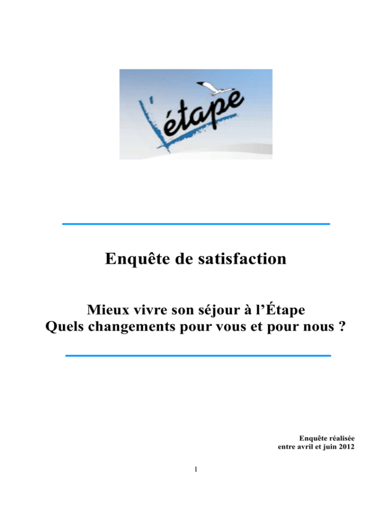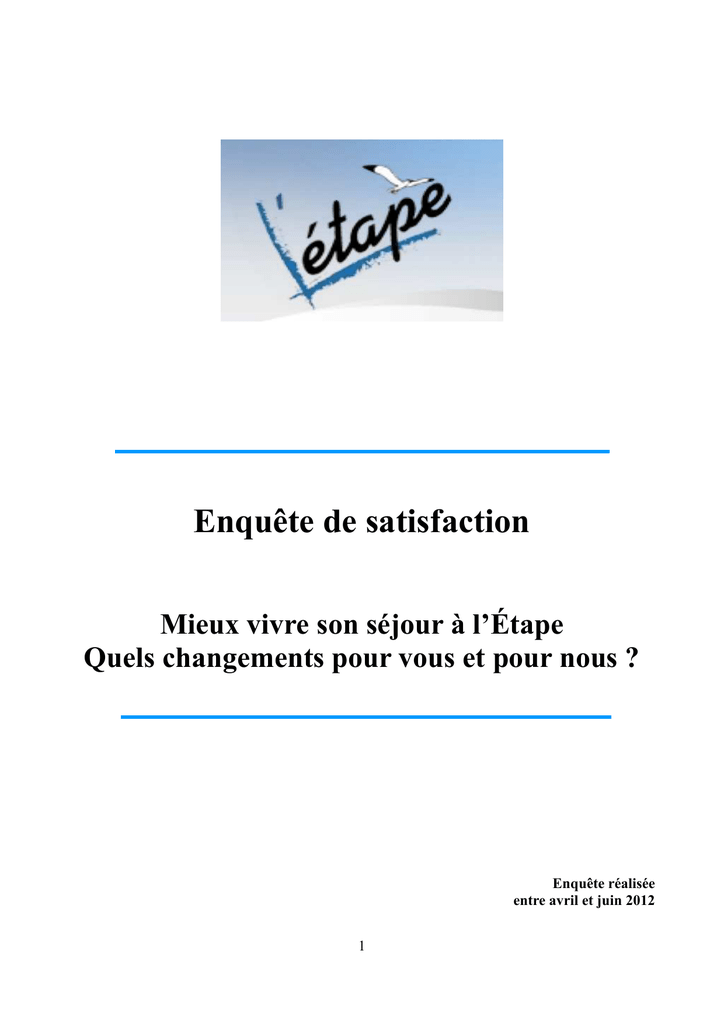 Enquête de satisfaction Mieux vivre son séjour à l’Étape Quels changements pour vous et pour nous ? Enquête réalisée entre avril et juin 2012 1 SOMMAIRE Introduction......................................................................... p.3 I – La participation des usagers : Cadre législatif ............... p.4 à 5 II – Analyse de l'enquête de satisfaction .............................P.6 à 23 A – L'hébergement ............................................................. P.6 à 8 B – Le suivi et l'accompagnement des démarches ........... P.9 à 16 C – L'équipe .......................................................................P.16 à 19 D – Les activités .................................................................P.20 E – Bilan .............................................................................P.21 à 23 III – Les propositions des usagers ....................................... P.24 Conclusion ..........................................................................P.25 à 26 Annexe 1: Les commentaires des usagers Annexe 2 : Le questionnaire Bibliographie 2 Introduction Dans le cadre de la démarche participative des usagers et afin de recueillir leurs opinions et leurs impressions sur leur séjour au centre d’hébergement et de réinsertion sociale de l'association l’Étape, une enquête de satisfaction a été réalisée auprès des personnes accueillies au CHRS. L'objectif de cette enquête étant de réfléchir de façon commune aux améliorations qui peuvent être apportées pour que le séjour des usagers et que le travail des travailleurs sociaux soient de meilleure qualité. Les questionnaires ont été distribués à un échantillon aléatoire des personnes accueillies, soit 90 personnes ou 70 ménages, entre le mois d'avril et le mois de mai. Les travailleurs sociaux ont proposé l'enquête aux usagers en leur expliquant son objectif. 50 questionnaires ont été recueillis, les résultats seront donc à titre indicatif et non exhaustifs mais permettront une analyse significative de l'accompagnement et de l'hébergement temporaire au CHRS. L'accompagnement est une notion abstraite qui peut s'expliquer par le fait de «faire avec» ou de «se joindre à quelqu'un pour aller où il va en même temps que lui». C'est la mission du CHRS, faire avec la personne, mais ne pas faire à sa place. L'hébergement temporaire est une formule d'accueil limité dans le temps qui correspond également aux missions du CHRS. Dans un premier temps, nous présenterons les obligations législatives des établissements sociaux et médico-sociaux en matière de participation des usagers Puis, nous analyserons les résultats de l'enquête. Ensuite, nous évoquerons les propositions des personnes accueillies pour améliorer leur séjour. Enfin, nous proposerons quelques pistes afin de perfectionner le questionnaire de satisfaction. 3 I – La participation des usagers : Cadre législatif La loi du 2 janvier 2002 rénovant l'action sociale et médico-sociale positionne l'usager comme acteur de son parcours. En effet, cette loi assure à l'usager des moyens d'expression et de participation. Ces principes étaient auparavant inscrits dans le code de l'action sociale et des familles mais ils ont été réaffirmés par la loi 2002-2. Avant ces textes, la loi concernant les personnes en grandes difficultés sociales, la loi d'orientation du 29 juillet 1998 relative à la lutte contre les exclusions, insistait plus sur le rôle des institutions pour permettre l'accès aux droits fondamentaux des personnes en difficultés que sur la participation de ces personnes à la construction de leur parcours vers la réinsertion sociale. La charte des droits et libertés de la personne accueillie, en référence à l'arrêté du 8 septembre 2003, permet d'informer les personnes de leurs droits, et notamment celui de leur participation à l'élaboration de leur projet d'accompagnement. Elle est transmise à l'usager lors de son accueil dans une structure sociale ou médico-sociale. L'ANESM, l'agence nationale de l'évaluation et de la qualité des établissements et services médico-sociaux, publie des recommandations pour permettre aux établissements de mettre en place les pratiques favorisant l'expression et la participation des usagers. Les établissements sociaux et médico-sociaux ont donc des obligations en matière de prise en compte et de consultation des usagers. Pour cela, il existe plusieurs moyens, notamment le conseil de vie sociale. Ce conseil est un moyen d'expression pour les usagers qui élisent sept représentants pour une durée de 1 à 3 ans se réunissant plusieurs fois par an pour discuter de toutes les questions en rapport avec le fonctionnement de l'établissement. Le CVS permet également d'appréhender la vie citoyenne à travers des élections. Toutefois, dans certains établissements, le CVS n'est pas obligatoire du fait de la durée d'hébergement inférieure au mandat minimum d'un représentant au CVS. C'est le cas pour les centres d'hébergement et de réinsertion sociale où les usagers sont accueillis pour de relativement courtes durées, ainsi que les centres d'accueil pour demandeurs d'asile. Néanmoins, ces établissements doivent tout de même consulter les usagers par d'autres moyens. Les groupes d'expression permettent une participation directe des usagers grâce à des débats et à une prise de parole de chaque usager dans un collectif réduit. Les groupes-projets permettent aux usagers d'agir sur leur environnement en participant à des activités qu'ils proposent et qu'ils mettent en place euxmêmes. Enfin, les enquêtes de satisfaction permettent de recueillir les opinions des usagers quant aux services et aux prestations fournis par l'établissement. Plusieurs modalités sont à respecter afin de recueillir des informations pertinentes et utilisables de la part des usagers grâce à une enquête de satisfaction. Tout 