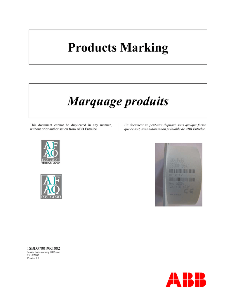 Products Marking Marquage produits This document cannot be duplicated in any manner, without prior authorisation from ABB Entrelec 1SBD370019R1002 Sensor laser marking 2005.doc 05/10/2005 Version 1.1 Ce document ne peut-être dupliqué sous quelque forme que ce soit, sans autorisation préalable de ABB Entrelec. Summary Sommaire General codification of the laser marking Page 3 Codification générale du marquage laser Page 3 39 bar code definition on ES range Page 5 Définition du code bar 39 sur la gamme ES Page 5 39 bar code definition on ESM range Page 6 Définition du code bar 39 sur la gamme ESM Page 6 39 bar code definition on CS range Page 7 Définition du code bar 39 sur la gamme CS Page 7 39 bar code definition on VS range Page 8 Définition du code bar 39 sur la gamme VS Page 8 39 bar code definition on EM range Page 9 Définition du code bar 39 sur la gamme EM Page 9 39 bar code definition on VD range Page 10 Définition du code bar 39 sur la gamme VD Page 10 39 bar code definition on HBO range Page 11 Définition du code bar 39 sur la gamme HBO Page 11 39 bar code definition on NCS range Page 12 Définition du code bar 39 sur la gamme NCS Page 12 2 05/10/2005 Version 1.1 1SBD370019R1002 General codification of the laser marking Codification générale du marquage Laser In order to standardise the Laser marking with the different type of sensors, after the 01/03/98 the sensors Laser marking was modified as follow: • Traction sensors The date code (year & week number) and the sensor serial number (alphanumeric counter) is grouped in 1 code Afin de standardiser le marquage Laser des différents capteurs, après le 01/03/98 le marquage Laser des capteurs a été modifié comme suit: • Capteurs Traction La date code (année & semaine) et le n° de série du capteur (compteur alphanumérique) est regroupé en 1 seul code • Industrial sensors An alphanumeric serial number is added to the date code • Capteurs Industriels Un numéro de série alphanumérique est ajouté à la date code Traction sensors / Capteurs Traction Before / Avant 01/03/98 After / Après 01/03/98 (Date code) (Date code + serial number) XX XX XX XXX XXX Week number N° de semaine Serial number N° de série Year / Année Julian calendar Calendrier julien Year / Année (Serial number / N° de série) XXXXXX Serial number N° de série Industrial sensors / Capteurs Industriels Before / Avant 01/03/98 After / Après 01/03/98 (Date code) (Date code + serial number) XX XX XX XXX XXX Week number N° de semaine Serial number N° de série Year / Année Julian calendar Calendrier julien Year / Année 3 05/10/2005 Version 1.1 1SBD370019R1002 Industrial sensors / Capteurs Industriels HBO Range / Gamme HBO Rating / Calibre Serial Number / Numéro de Série Rating 100 = 100A; 200 = 200A; etc… Calibre 100 = 100A; 200 = 200A; etc… Serial number XX (left) = Year . 04 = 2004 . 05 = 2005 . etc… Numéro de série XX (gauche) = année . 04 = 2004 . 05 = 2005 . etc… XXX (middle) = Julian date . 010 = 10th day of the year XXX (milieu) = jour Julien . 010 = 10ème jour de l'année XX (right) = batch number of the current week XX (droite) = n° de lot de la semaine 4 05/10/2005 Version 1.1 1SBD370019R1002 39 bar code definition on ES range Définition du code barre 39 sur la gamme ES The marking of sensors include from January 2001 a 39 bar code. This bar code codification is designed in 2 sections: . 1 bar code to identify the sensor reference . 1 bar code to identify the date • Sensor identification 1. Standard sensors 3 or 4 digits to specify the rating: ex: 100 for ES100; 500 for ES500 1 digit to specify the sensor type C for Molex type S for JST type Le marquage des capteurs inclue depuis janvier 2001 un code barre de type 39. Ce code barre est constitué de 2 sections: . 1 code barre pour identifier la référence du capteur . 1 code barre pour identifier la date • Identification du capteur 1. Capteurs standards 3 ou 4 digits pour spécifier le calibre: ex: 100 pour ES100; 500 pour ES500 1 digit pour spécifier le type du capteur: C pour type Molex S pour type JST 2. Customised sensors 4 digits to specify the sensor type: ex: 9775 for ES100-9775 2. Capteurs spéciaux 4 digits pour spécifier le type du capteur: ex: 9775 pour ES100-9775 3. ES sensors UL marked Due to the additional information to be marked when the sensors are UL marked, the 39 bar code is not printed on the ES100F, ES300F and ES500F sensors. 3. Capteurs ES avec marquage UL Du fait des informations supplémentaires à marquer lorsque les capteurs sont UL, le code barre 39 n'est pas marqué sur les capteurs ES100F, ES300F et ES500F. • Date identification 1 digit to specify the year: 1 for 2001; 5 for 2005 3 digits to specify the Julian date of the year: 021: 21st day of the year 2001 • Identification de la date 1 digit pour spécifier l’année: 1 pour 2001; 5 pour 2005 3 digits pour spécifier le jour julien de l’année: 021: 21ème jour de l’année 2001 Standard sensors / Capteurs standards ES300C (300C) 01021C45 (1021) Specific sensors / Capteurs spéciaux ES100-9775 (9775) 01021C45 (1021) 5 05/10/2005 Version 1.1 1SBD370019R1002 39 bar code definition on ESM range Définition code barre 39 sur la gamme ESM This 39 bar code codification is designed in 2 sections: . 1 bar code to identify the sensor reference . 1 bar code to identify the date • Sensor identification 1. Standard sensors 1 digit to specify the sensor range: M for ESM range 1 digit to specify the rating: ex: 1K for ESM1000 (1K = 1000) 1 digit to specify the sensor type: C for Molex type S for JST type F for cable type Ce code barre de type 39 est constitué de 2 sections: . 1 code barre pour identifier la référence du capteur . 1 code barre pour identifier la date • Identification du capteur 1. Capteurs standards 1 digit pour spécifier la gamme: M pour la gamme ESM 1 digit pour spécifier le calibre: ex: 1K pour ESM1000 (1K = 1000) 1 digit pour spécifier le type 
