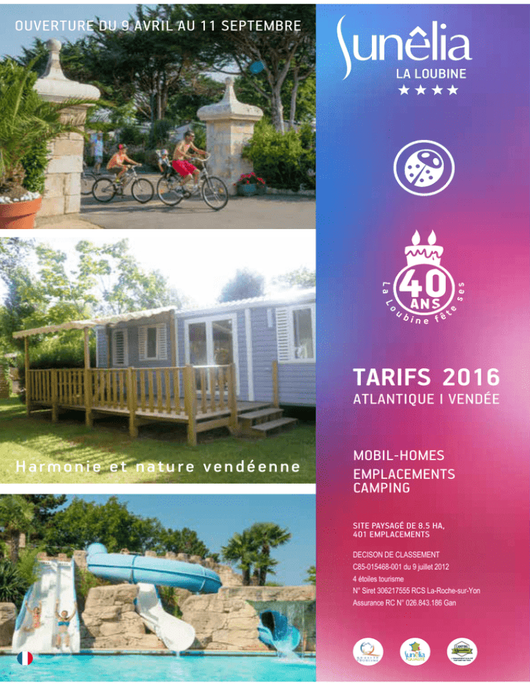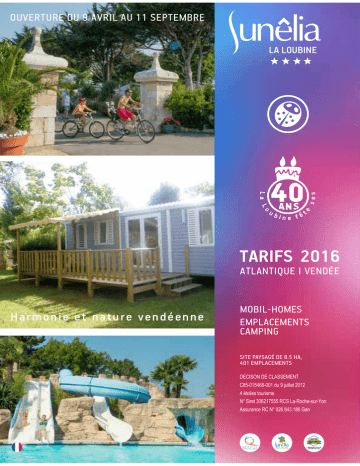 OUVERTURE DU 9 AVRIL AU 11 SEPTEMBRE ub ANS t e o La L 40 ses LA LOUBINE ine fê TARIFS 2016 ATLANTIQUE Ι VENDÉE Har monie et n at u re v e ndé enne MOBIL!HOMES EMPLACEMENTS CAMPING SITE PAYSAGÉ DE 8.5 HA, 401 EMPLACEMENTS DECISON DE CLASSEMENT C85-015468-001 du 9 juillet 2012 4 étoiles tourisme N° Siret 306217555 RCS La-Roche-sur-Yon Assurance RC N° 026.843.186 Gan QUALITÉ TARIFS LOCATIONS 2016 Séjour de mini 2 nuits du 09/04 au 09/07 et du 27/08 au 11/09/2016 (sauf WE ascension mini 3 nuits) Séjour par module de 7 nuits du 09/07 au 27/08/2016, arrivées de 17h à 20h, heure de départ avant 10h. Minimum stay 2 nights from 09/04 to 09/07 and from 27/08 to 11/09/2016 (without Ascension minimum 3 nights). Stays by module of 7 nights from 09/07 to 27/08/2016. Arrivals between 5pm and 8pm, departures before 10am. PROMO ACHETEZ MALIN(1) : –15% pour tous séjours de 7 nuits consécutives en gamme Sunêlia - for all stay of 7 nights in a Sunêlia du 28/05 au 25/06 et du 27/08 au 11/09 PROMO ACHETEZ MALIN(1) : –20% pour tous séjours de 14 nuits consécutives - for all stay of 14 nights du 09/04 au 09/07 et du 20/08 au 11/09 PROMO ACHETEZ MALIN(1) : pour 3 semaines consécutives, la moins chère offerte/ for 3 consecutive weeks the cheaper week for free avant le 09/07 et après le 20/08 09/04 - 05/05 08/05 - 14/05 05/05 - 08/05 02/07 - 09/07 16/05 - 02/07 14/05 - 16/05 27/08 - 11/09 SUNÊLIA 6 ANS MAXIMUM ANIMAUX INTERDITS JUILLET AOUT TARIFS/NUIT ! PRICES/NIGHT 09/07 - 30/07 30/07 - 06/08 06/08 - 20/08 20/08 - 27/08 Jour d’arrivée(3) pour séjours par module de 7 nuits Sunêlia grand Family 36 m² 6/8p. 3ch. terrasse semi couverte T.V. barbecue gaz (Suppl. 7ème et 8ème pers. 6€/pers./jour) 62 € 94 € 123 € 139 € 152 € 162 € 123 € S/D Sunêlia Family 34 m² 6p. 3ch. terrasse semi couverte T.V. (2) 59 € 89 € 116 € 132 € 145 € 155 € 116 € S/D Sunêlia Family Déclick 32m², 6p, 3ch, 1sdb, TV , terrasse semi couverte 62 € 94 € 120 € 136 € 149 € 159 € 120 € S Sunêlia Grand Confort 32 m² 4/6p. 2ch. terrasse semi couverte T.V. 56 € 83 € 106 € 122 € 135 € 145 € 106 € S/D 80 € 102 € LOISIRS + 9 ANS 83 € 104 € 118 € 131 € 141 € 102 € S/D 121 € 133 € 143 € 104 € S (2) Sunêlia Confort 26 m² 4/5p. 2ch. terrasse semi couverte T.V. (2) (2) 52 € Loisir Family TV(2) 32m², 6p 3ch, 1sdb, terrasse 55 € Loisir Mobil-home 32m², 6p 3ch, 1sdb, terrasse 50 € 79 € 99 € 116 € 128 € 138 € 99 € S 51 € 78 € 99 € 114 € 127 € 137 € 99 € S Loisir Mobil-home 26 m² 4/6 p, 2ch, 1sdb, terrasse 46 € 73 € 94 € 109 € 122 € 132 € 94 € S Loisir mobil home 24 m², 4/5p, 2ch, terrasse 43 € 69 € 85 € 100 € 113 € 123 € 85 € S 39 € 65 € 80 € 96 € 109 € 119 € 80 € S 55 € CHALETS 82 € 105 € 120 € 133 € 143 € 105 € S Loisir Confort TV 26 m² 4/6 p, 2ch, 1sdb, terrasse (2) Loisir Helios 31m² 4/6p 2 ch, 1sdb, TV(2), terrasse Loisir mobil home 24 m², 4/5p, 2ch Loisir mobil home 20m², 4p, 2ch, 1sdb, terrasse Chalet 45 m², 6p. 3ch. 1sdb, terrasse 28/05 - 03/07 28/08 - 11/09 Tente aménagée 20 m² 4/5p. 2ch. Terrasse (sans sanitaire) (1) 03/07 - 10/07 10/07 - 31/07 TENTES AMÉNAGÉES 29 € 58 € 73 € 31/07 - 07/08 07/08 - 21/08 21/08 - 28/08 Jour d’arrivée(3) pour séjours par module de 7 nuits 82 € 95 € 58 € D offres limitées et non cumulables, valable en hébergement et en emplacement. (2) la qualité des réseaux TNT ne nous permet pas de vous garantir toutes les chaînes (3) S = Samedi, D= Dimanche TARIFS WEEK-ENDS, WEEK-ENDS SPÉCIAUX ET COURTS SÉJOURS Week-ends ou courts séjours (2 nuits, 3 jours) sauf Ascension et Pentecôte Ascension 05/05 au 08/05 (3 nuits, 4 jours) Pentecôte 14/05 au 16/05 (2 nuits, 3 jours) Nuit supplémentaire SUNÊLIA 6 ANS MAXIMUM Sunêlia grand Family 36 m² 6/8p. 3ch. terrasse semi couverte T.V. barbecue gaz (Suppl. 7ème et 8ème pers. 6€/pers./jour) Sunêlia Family 34 m² 6p. 3ch. terrasse semi couverte T.V. (2) Sunélia Family Déclick 32m², 6p, 3ch, 1sdb, TV(2), terrasse semi couverte Sunêlia Grand Confort 32 m² 4/6p. 2ch. terrasse semi couverte T.V. (2) Sunêlia Confort 26 m² 4/5p. 2ch. terrasse semi couverte T.V. (2) Loisir Family TV(2) 32m², 6p 3ch, 1sdb, terrasse Loisir Mobil-home 32m², 6p 3ch, 1sdb, terrasse Loisir Confort TV(2) 26 m² 4/6 p, 2ch, 1sdb, terrasse Loisir Helios 31m² 4/6p 2 ch, 1sdb, TV(2), terrasse Loisir Mobil-home 26 m² 4/6 p, 2ch, 1sdb, terrasse Loisir mobil home 24 m², 4/5p, 2ch, terrasse Loisir mobil home 24 m², 4/5p, 2ch Loisir mobil home 20m², 4p, 2ch, 1sdb, terrasse 124 € 282 € 188 € 62 € 118 € 124 € 112 € 112 € LOISIRS + 9 ANS 110 € 100 € 267 € 282 € 249 € 240 € 178 € 188 € 166 € 160 € 59 € 62 € 56 € 52 € 249 € 237 € 166 € 156 € 55 € 50 € 102 € 234 € 156 € 51 € 92 € 86 € 219 € 207 € 146 € 138 € 46 € 43 € 78 € 195 € 130 € 39 € 246 € 164 € 55 € CHALETS Chalet 45 m², 6p. 3ch. 1sdb, terrasse 110 € ANIMAUX INTERDITS JUILLET AOÛT. Tous les prix de location figurant dans le présent document sont TTC. La TVA appliquée est celle en vigueur actuellement à la date d’édition du présent catalogue au taux de 10%. Toute modification de ce taux entre la date de réservation et la date du séjour, entrainera la modification des prix de location TTC en conséquence. En juillet-août la semaine se comprend du samedi au samedi. (Arrivées le samedi ou dimanche pour la gamme Sunêlia, le dimanche pour les tentes aménagées). Les arrivées sont prévues de 17H à 20H. Les départs sont tous les 1/4H échelonnés entre 7H30 et 10H. Le nombre de personnes (bébés inclus) est limité dans chaque locatif. In July and august, the accomodations are only from Saturday to Saturday. (Arrivals on saturdays and sundays for Sunelia rentals, on sundays for furnished tents) Arrivals betwe