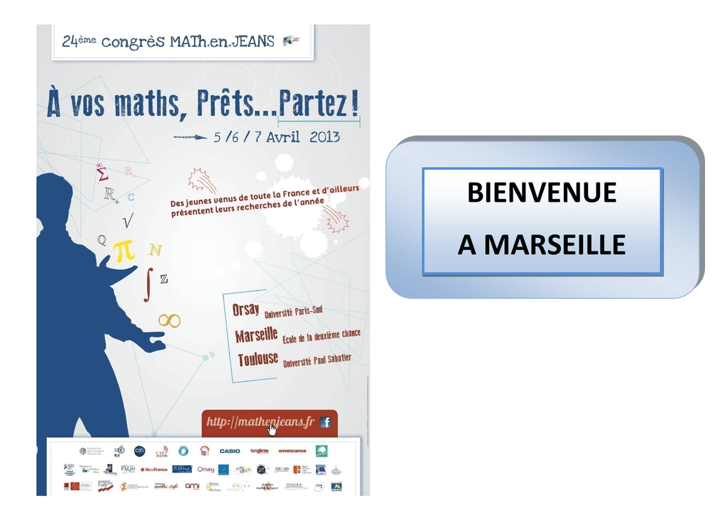 BIENVENUE A MARSEILLE Congrès MATh.en.JEANS 2013 à Marseille Programme général Vendredi 5 avril 2013 13:30 - 15:00 : Exposés et animations Amphi E2C Salle GESIM Amphi Henri Grégoire CNAM •Lycée d'Altitude (Briançon) : Les ensembles gonflés •Collège Mauzan (Gap) : Centrale électrique au milieu de villages •Université d'AixMarseille, campus St Charles (Marseille) : Pièces de monnaie •Université d'AixMarseille, campus St Charles (Marseille) : Lutte contre l'incendie •Collège CamilleClaudel (Paris) : Le problème des couleurs Amphi JeanBaptiste Say CNAM Salle de cours CNAM Salle de réunion E2C Petite salle E2C Petit train rouge Petit train bleu •Collège Gérard, Philipe (Martigues) : Le jeu des trois portes •Collège MarcelPagnol (Pertuis) : Réaliser un solide: les boules ! •Collège CamilleClaudel (Paris) : Les alignements de 3 arbres •Collège ClairSoleil (Marseille) : Les polyèdres semiréguliers •Collège des Gratte-Ciel (Villeurbanne) : Tuiles de Wang •Lycée Esclangon (Manosque) : Messages secrets •Collège JosephVernet (Avignon) : Retournement d'une aiguille •Collège Bernardde-Ventadour (Bagnols-surCèze): Un canapé bien encombrant... 15:00 - 16:00 : Inauguration et conférence Guillemette Chapuisat : Modélisation du cancer (amphi E2C) Michel Bera : Les réseaux sociaux et leur analyse : de nouveaux champs d'application de la statistique appliquée (Amphi CNAM) 20:00 - 21:00 : Conférence (grand amphi St Charles) John Hubbard : Le coût de l'anarchie •Collège Gérard-Philipe (Martigues) : Cryptage et programmation Samedi 6 avril 2013 09:00 - 11:45 : Exposés et animations Amphi E2C Salle GESIM •Ecole Internationale (Manosque) : Aurez-vous la grippe cet hiver ? Amphi Henri Grégoire CNAM •Lycée Arago (Perpignan) jumelé avec Lycée Maillol (Perpignan) : Le pays où les douaniers sont rois. •Lycée d'Altitude (Briançon) : Retournement d'une aiguille Amphi JeanBaptiste Say CNAM •Université d'AixMarseille, campus St Charles (Marseille) : Le mathématicophage •Collège international (Grenoble) : Don't cross the streams Salle GESIM Amphi Henri Grégoire CNAM •Université d'AixMarseille, campus St Charles (Marseille) : Suites symboliques •Collège CamilleClaudel (Paris) : Trajectoires fermées dans un billard triangulaire •Lycée de Vaison (Vaison-laRomaine) : Probabilité du premier chiffre significatif d'un nombre •Collège GérardPhilippe (Martigues) : Cryptage et programmation Salle de réunion E2C Petite salle E2C Petit train rouge Petit train bleu •Collège CamilleClaudel (Paris) : Le problème des Kaplas. •Lycée Esclangon (Manosque) : Messages secrets [animation] •Lycée d'Altitude (Briançon) : Les tas de sable [animation] •Collège ClairSoleil (Marseille) : Les polyèdres semiréguliers •Lycée d'Altitude (Briançon) : Les moulins à vent •Collège des Gratte-Ciel (Villeurbanne) : Tuiles de Wang •Collège JosephVernet (Avignon) : Jeu de croque [animation] •Collège Mauzan (Gap) : Centrale électrique au milieu de villages •Collège MarioMeunier (Montbrison) : Les Amida-Kuji •Université d'AixMarseille, campus de Luminy, (Marseille) : Liste de diviseurs Amphi E2C Salle de cours CNAM Amphi JeanBaptiste Say CNAM •Université d'AixMarseille, campus de Luminy, (Marseille) : Culbuto •Collège CamilleClaudel (Paris) : Les fausses pièces •Lycée Maillol (Perpignan) : Dessiné, c'est gagné •Collège international (Grenoble) : Crêpe au sucre Salle de cours CNAM Salle de réunion E2C Petite salle E2C Petit train rouge Petit train bleu •Université d'AixMarseille, campus de Luminy, (Marseille) : Distance entre mots •Collège MarioMeunier (Montbrison) : Les Amida-Kuji [animation] •Lycée de Vaison (Vaison-laRomaine) : Découpages en un seul coup de ciseaux [animation] •Collège GérardPhilippe (Martigues) : Le jeu des trois portes •Lycée Maillol (Perpignan) : Il faut avoir le compas dans l'œil • Lycée Arago (Perpignan) jumelé avec Lycée Maillol (Perpignan) : Pile Poil •Collège Bernardde-Ventadour (Bagnols-sur-Cèze) : Un canapé bien encombrant... [animation] •Lycée JeanCocteau (Miramas): Les fractales •Lycée d'Altitude (Briançon) : Modélisation du vol des oiseaux Samedi 6 avril 2013 12:15 - 12:45 : Spectacle de magie (amphi E2C) 13:15 - 13:45 : Spectacle de magie (amphi E2C) 13:30 - 15:00 : Exposés et animations Amphi E2C Salle GESIM •Lycée JeanCocteau (Miramas): Les fractales (début à 14h) Amphi Henri Grégoire CNAM • Lycée Arago (Perpignan) jumelé avec Lycée Maillol (Perpignan) : Alea jacta est •Université d'AixMarseille, campus St Charles (Marseille) : Ballon ou chambre à air ? Amphi JeanBaptiste Say CNAM • Lycée de Vaison (Vaison-laRomaine) jumelé avec Lycée LucieAubrac (Bollène) : Billard mathématique. Salle de cours CNAM Salle de réunion E2C Petite salle E2C Petit train rouge Petit train bleu •Collège international (Grenoble) : Crêpe au sucre •Collège Bernardde-Ventadour (Bagnols-sur-Cèze) : Un canapé bien encombrant... [animation] •Lycée d'Altitude (Briançon) : Les tas de sable [animation] •Collège CamilleClaudel (Paris) : Le problème des couleurs •Ecole Internationale (Manosque) : Aurez-vous la grippe cet hiver ? •Collège international (Grenoble) : g HT 1 kdo 4 al1 [animation] •Collège des Gratte-Ciel (Villeurbanne) : Pavage de Penrose •Collège CamilleClaudel (Paris) : Les alignements de 3 arbres. •Lycée Esclangon (Manosque) : Structures de tenségrité [animation] •Lycée Arago (Perpignan) jumelé avec Lycée Maillol (Perpignan) : El centre del mon [animation] 15:00 - 16:00 : Conférence (amphi E2C) Thomas Fernique : Pavages : du jeu à la matière 16:30 - 17:30 : Rencontres élèves-chercheurs (amphi E2C, amphi Jean-Baptiste Say CNAM) 16:30 - 17:30 : Rencontre entre enseignants (amphi Henri Grégoire CNAM) 17:30 - 18:30 : Spectacle (E2C) • Lycée de Vaison (Vaison-laRomaine) jumelé avec Lycée Luc