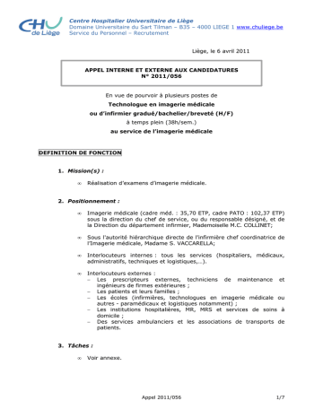 Centre Hospitalier Universitaire de Liège Domaine Universitaire du Sart Tilman – B35 – 4000 LIEGE 1 www.chuliege.be Service du Personnel – Recrutement Liège, le 6 avril 2011 APPEL INTERNE ET EXTERNE AUX CANDIDATURES N° 2011/056 En vue de pourvoir à plusieurs postes de Technologue en imagerie médicale ou d’infirmier gradué/bachelier/breveté (H/F) à temps plein (38h/sem.) au service de l’imagerie médicale DEFINITION DE FONCTION 1. Mission(s) : • Réalisation d’examens d’imagerie médicale. 2. Positionnement : • Imagerie médicale (cadre méd. : 35,70 ETP, cadre PATO : 102,37 ETP) sous la direction du chef de service, ou du responsable désigné, et de la Direction du département infirmier, Mademoiselle M.C. COLLINET; • Sous l'autorité hiérarchique directe de l'infirmière chef coordinatrice de l’Imagerie médicale, Madame S. VACCARELLA; • Interlocuteurs internes : tous les services (hospitaliers, médicaux, administratifs, techniques et logistiques,…). • Interlocuteurs externes : − Les prescripteurs externes, techniciens de maintenance et ingénieurs de firmes extérieures ; − Les patients et leurs familles ; − Les écoles (infirmières, technologues en imagerie médicale ou autres - paramédicaux et logistiques notamment) ; − Les institutions hospitalières, MR, MRS et services de soins à domicile ; − Des services ambulanciers et les associations de transports de patients. 3. Tâches : • Voir annexe. Appel 2011/056 1/7 CONDITIONS D’ENGAGEMENT • Date de prise en fonction : dès que possible • Type de contrat : contrat à durée indéterminée et de remplacement - essai 6 mois • Site de prestation : Sart Tilman, CHU-N.D. des Bruyères, Esneux et Brull. • Horaire : temps plein soit 38h/sem, les prestations sont à assurer selon l’horaire repris en annexe. • Grade : infirmier gradué/bachelier/breveté, technologue en imagerie médicale • Grade / échelle / Traitement (1) : infirmier breveté - échelle 1431 – 1944,50€ infirmier gradué ou technologue en imagerie médicale - échelle 1.55B – 2327,54€ (1) Traitement mensuel brut à temps plein, au départ du grade, càd sans valorisation d’ancienneté - à l’index 1,5157 (octobre 2010) à majorer éventuellement des allocations de foyer ou résidence. Possibilité de valorisation d’expérience professionnelle. PROFIL REQUIS 1. Diplôme, grade, ancienneté : Condition(s) de diplôme (Diplôme belge / diplôme reconnu équivalent par la Communauté Française / reconnaissance professionnelle émanant du Service Public Fédéral Santé Publique) : Graduat/brevet (ou en dernière année) d’infirmier ou de technologue en imagerie médicale Préférence sera donnée aux candidats justifiant d’une expérience en imagerie médicale • Satisfaire ou s’engager à suivre la formation en Radioprotection A.R. 20/07/2001 2. Autres exigences : Maîtrise de la langue française : - Expression orale et écrite courante Expression orale de qualité (téléphonie, guichet,…) Bureautique WORD EXCEL MESSAGERIE : Outlook x x x Appel 2011/056 2/7 Exigences : • • • • • • • • • • être attentif à l’accueil, à l’information et au confort du patient, avoir une attirance pour l’informatique et la technique, s’adapter rapidement aux modifications fréquentes des programmes informatiques et des procédures liées à l’évolution constante et rapide de la technique (consoles 3D, RIS-PACS, DMI,…), respecter les règles d’hygiène, s’impliquer dans les projets du service d’Imagerie Médicale, du département Infirmier et du CHU y compris dans le domaine de la recherche, être particulièrement vigilant à la sécurité dans la salle d’examen, savoir travailler dans des locaux clos, collaborer en bonne entente avec les radiologues, travailler en équipe pluridisciplinaire, être capable après la période de formation de travailler dans tous les secteurs d’imagerie (excepter l’IRM qui est un secteur séparé). 3. Etre de bonne conduite, vie et mœurs MODALITES DE SELECTION - Examen des CV Entrevue en présence d’un jury DEPOT DES CANDIDATURES • Les candidatures doivent parvenir, pour le 30 avril 2011 au plus tard, au Service du Personnel – à l’attention de Madame M.N. ENGLEBERT-THOMAS – C.H.U. – Domaine du Sart Tilman à 4000 Liège, . par écrit, . par fax (n° 04/366.83.63) . ou par mail (e-mail : [email protected]) • Elles doivent être accompagnées : − si o o o vous êtes membre du personnel du CHU : d’une lettre de motivation d’un curriculum vitae détaillé d’une photo d’identité - si o o o o vous n'êtes pas membre du personnel du C.H.U. : d’une lettre de motivation d’un curriculum vitae détaillé d’une copie de votre carte d’identité (avec photo de bonne qualité) d’une copie du diplôme requis pour l’engagement (ou copie de la reconnaissance de l’équivalence) Appel 2011/056 3/7 • Si vous postulez pour plusieurs appels, une copie de ces documents doit être fournie chaque fois. Chaque postulant sera informé de la suite réservée à sa candidature. Cette information interviendra après la date de clôture de l’appel et, au plus tard, 3 mois après cette échéance. POUR TOUT RENSEIGNEMENT COMPLEMENTAIRE • sur la nature exacte des tâches liées à l’emploi, les candidats peuvent se présenter ou s’informer auprès de Madame S. VACCARELLA , tel: 04/366.78.52 – bip 216 Il est vivement conseillé de vous informer préalablement sur la fonction à pourvoir. • à propos des formalités administratives, les candidats peuvent s’adresser au Service du Personnel – Recrutement – Madame L. PUTRONE, tél. 04/366.70.35 Référence de l’appel à rappeler dans toute correspondance : 2011/056 Technologue en imagerie médicale ou infirmier au service d’imagerie médicale sur le site du Sart Tilman ou sur le site du C.H.U. – N.D. des Bruyères Appel 2011/056 4/7 Annexe DEFINITION D