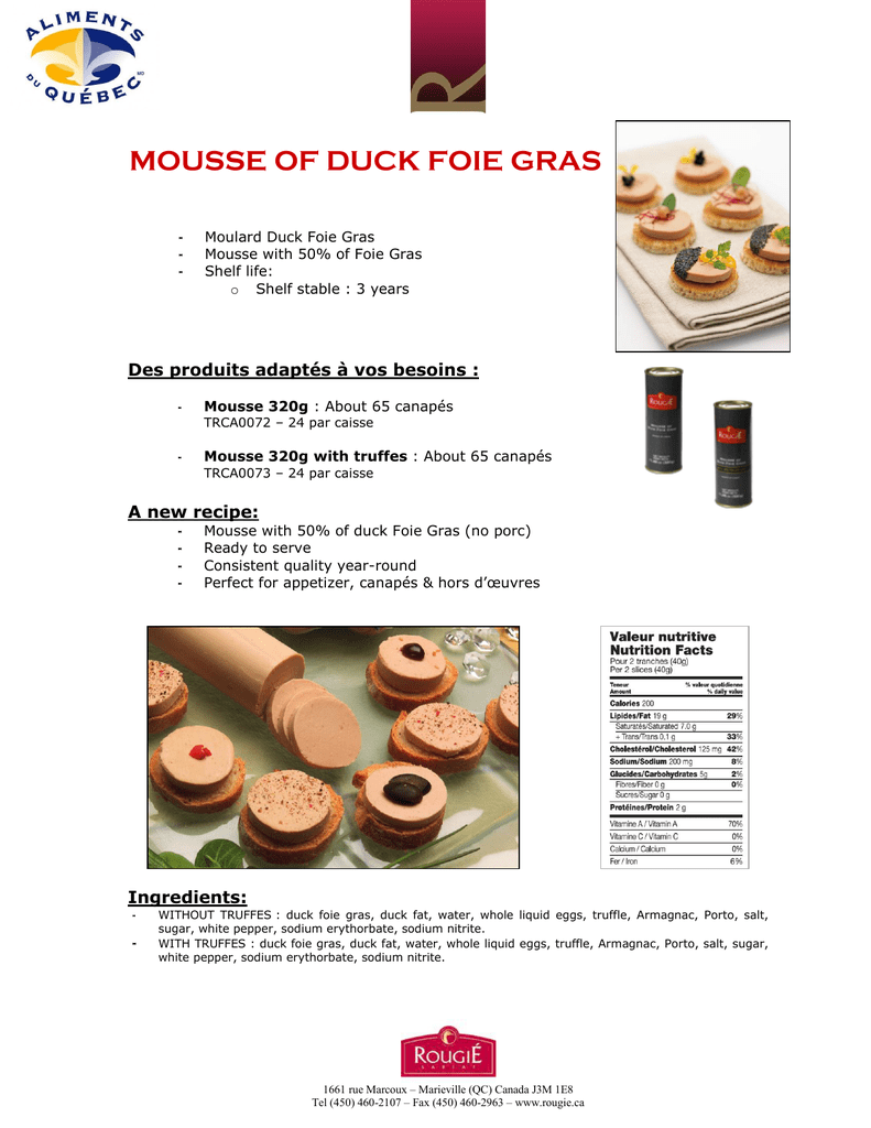 MOUSSE OF DUCK FOIE GRAS - Moulard Duck Foie Gras Mousse with 50% of Foie Gras Shelf life: o Shelf stable : 3 years Des produits adaptés à vos besoins : - Mousse 320g : About 65 canapés TRCA0072 – 24 par caisse - Mousse 320g with truffes : About 65 canapés TRCA0073 – 24 par caisse A new recipe: - Mousse with 50% of duck Foie Gras (no porc) Ready to serve Consistent quality year-round Perfect for appetizer, canapés & hors d’œuvres Ingredients: - - WITHOUT TRUFFES : duck foie gras, duck fat, water, whole liquid eggs, truffle, Armagnac, Porto, salt, sugar, white pepper, sodium erythorbate, sodium nitrite. WITH TRUFFES : duck foie gras, duck fat, water, whole liquid eggs, truffle, Armagnac, Porto, salt, sugar, white pepper, sodium erythorbate, sodium nitrite. 1661 rue Marcoux – Marieville (QC) Canada J3M 1E8 Tel (450) 460-2107 – Fax (450) 460-2963 – www.rougie.ca