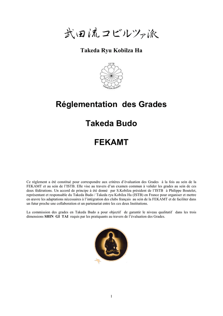 Takeda Ryu Kobilza Ha Réglementation des Grades Takeda Budo FEKAMT Ce règlement a été constitué pour correspondre aux critères d’évaluation des Grades à la fois au sein de la FEKAMT et au sein de l’ISTB. Elle vise au travers d’un examen commun à valider les grades au sein de ces deux fédérations. Un accord de principe à été donné par S.Kobilza président de l’ISTB à Philippe Boutelet, représentant et responsable du Takeda Budo / Takeda ryu Kobilza Ha (ISTB) en France pour organiser et mettre en œuvre les adaptations nécessaires à l’intégration des clubs français au sein de la FEKAMT et de faciliter dans un futur proche une collaboration et un partenariat entre les ces deux Institutions. La commission des grades en Takeda Budo a pour objectif de garantir le niveau qualitatif dans les trois dimensions SHIN GI TAI requis par les pratiquants au travers de l’évaluation des Grades. 1 Extrait des Dispositions Générales FEKAMT Préambule La Fekamt est un organisme regroupant des pratiquants à travers des clubs ou associations, des groupes de clubs, des écoles d'arts martiaux (Ryu) ou des fédérations constituées. Désireuse de coller au plus près de la tradition des arts martiaux asiatiques, elle reconnaît les "Ryu" et établit des règlements pour que chaque pratiquant puisse s'exprimer librement au travers de sa pratique et présenter des évaluations de compétence en fonction de sa propre sensibilité. Conditions générales de présentation Chaque postulant devra fournir les pièces administratives suivantes: - Un certificat médical d'aptitude à la pratique du Karaté ou de la discipline martiale concernée. Ce certificat doit être établi conformément aux lois en vigueur. - Une attestation du temps de pratique conforme à celle prévue dans les règlements (voir chapitre concerné) - Une attestation d'appartenance au Ryu (Ecoles) le parrainant - Le Passeport et les licences FEKAMT, - Pour les nouveaux adhérents une certification prouvant le dan ou le kyu dont ils se prévalent. D'autre part, avant de pouvoir se présenter à une évaluation, chaque candidat devra avoir participé à un minimum de 2 stages préparatoires régionaux, nationaux ou européens Conditions d’âge : - Pour se présenter à l’évaluation du shodan, les candidats devront être âgés de 16 ans au jour de l’examen et être ceinture marron depuis au moins 1 an - Pour se présenter à l’évaluation du nidan, les candidats devront avoir l’âge minimum de 18 ans au jour de l’examen - Pour se présenter à l’évaluation du sandan, les candidats devront être âgés de 21 ans au jour de l’examen - Pour se présenter à l’évaluation du yondan, les candidats devront avoir l’âge minimum de 25 ans au jour de l’examen - Pour se présenter à l’évaluation du godan, les candidats devront avoir l’âge minimum de 30 ans au jour de l’examen - Pour se présenter à l’évaluation du Rokudan, les candidats devront être âgés de 38 ans au jour de l’examen - Pour prétendre au niveau de Shichidan, les candidats devront avoir l’âge minimum de 46 ans. Temps de pratique entre chaque évaluation de dan et grades équivalents : - Ce temps de pratique, attesté par le passeport FEKAMT, ne peut être inférieur à : - 3 ans pour prétendre au passage du Shodan - 2 ans entre le passage du shodan et celui du Nidan - 3 ans entre le passage du nidan et celui du Sandan - 4 ans entre le passage du sandan et celui du Yondan - 5 ans entre le passage du yondan et celui du Godan - 8 ans entre le passage du godan et celui du Rokudan - Les Shichidan, Hachi dan et Kudan, seront évalués sur examen du dossier par le CHGAMT sont des conditions indispensables et essentielles que le collège des experts prendra en compte. Bonifications de temps et d'âge : Sur recommandation du Conseil des experts, certaines bonifications pourront être accordées à titre exceptionnel à des pratiquants dont la moralité et les compétences sont reconnues et qui témoignent par leur rayonnement (recherches et actions pour le développement des arts martiaux) des qualités prônées par notre fédération. Cette Bonification ne pourra jamais être supérieure à la moitié du temps normal requis entre chaque évaluation. Hauts niveaux (Rokudan et +) : Pour pouvoir accéder au titre de Kodansha KYOSHI Rokudan, le candidat doit justifier d’un minimum de 20 ans au niveau de ceinture noire et ceci quelles que soient ses possibilités de bonification et pour autant qu'elles n'aient été utilisées qu'une fois. Après étude du dossier, le CHGAMT décide de l’acceptation ou du refus de celui-ci. IMPORTANT : A partir du Titre de KYOSHI, le comportement, le rayonnement, le dévouement sous toutes ses formes à la cause du Karaté-do, des Arts Martiaux Traditionnels et des disciplines d'origine ou dérivées, la recherche, les connaissances techniques, historiques et philosophiques 2 BUDO NO SEISHIN & SHIN GI TAI : Une seule et même voie ! « Chacune de ces six « qualités » ou « outils » ont la même importance pour nous, et leur ordre représente le chemin du développement d'un pratiquant (Do) tout au long des années. Ce chemin commence par travailler sa concentration (ce qui est normale et nécessaire lorsque vous commencez un apprentissage). La poursuite de cette voie amènera à devenir une personne finalement attentive à son environnement. Elle aura pour intention de faire preuve de sociabilité et de bienveillance envers les autres. Avoir un esprit alerte est généralement la meilleure condition préalable pour apprendre, ainsi nous développons cela dès notre première leçon de Budo. Ce qui inclut d‘être attentif, afin d‘améliorer sa propre concentration, et développer un esprit critique. En somme, c‘est notre force mentale ! Développer un corps vigoureux par la pratique des techniques martiales est évident et compréhensible par tous. Mais pour les pratiquants du 