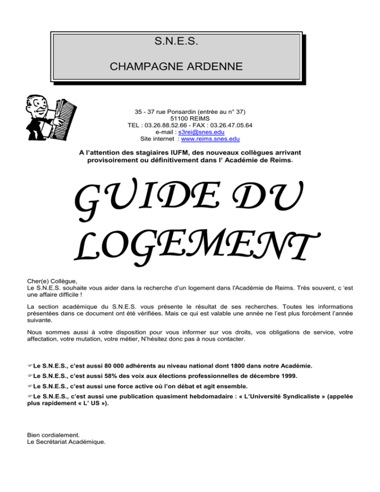 S.N.E.S. CHAMPAGNE ARDENNE 35 - 37 rue Ponsardin (entrée au n° 37) 51100 REIMS TEL : 03.26.88.52.66 - FAX : 03.26.47.05.64 e-mail : [email protected] Site internet : www.reims.snes.edu A l’attention des stagiaires IUFM, des nouveaux collègues arrivant provisoirement ou définitivement dans l’ Académie de Reims. Cher(e) Collègue, Le S.N.E.S. souhaite vous aider dans la recherche d’un logement dans l'Académie de Reims. Très souvent, c ‘est une affaire difficile ! La section académique du S.N.E.S. vous présente le résultat de ses recherches. Toutes les informations présentées dans ce document ont été vérifiées. Mais ce qui est valable une année ne l’est plus forcément l’année suivante. Nous sommes aussi à votre disposition pour vous informer sur vos droits, vos obligations de service, votre affectation, votre mutation, votre métier, N’hésitez donc pas à nous contacter. !Le S.N.E.S., c’est aussi 80 000 adhérents au niveau national dont 1800 dans notre Académie. !Le S.N.E.S., c’est aussi 58% des voix aux élections professionnelles de décembre 1999. !Le S.N.E.S., c’est aussi une force active où l’on débat et agit ensemble. !Le S.N.E.S., c’est aussi une publication quasiment hebdomadaire : « L’Université Syndicaliste » (appelée plus rapidement « L’ US »). Bien cordialement. Le Secrétariat Académique. SOMMAIRE Pied à Terre provisoire : p 3 à 7 Ardennes................................................... page 2 – 3 Aube......................................................... pages 3 - 4 Marne ....................................................... pages 4 - 6 Haute Marne.................................................... page 7 Recherche d’un logement en HLM : p 8 à 15 Ardennes................................................ pages 8 - 11 Aube..................................................... pages 11 - 13 Marne ................................................... pages 13 - 15 Haute Marne.................................................. page 15 Recherche d’un logement en établissement scolaire et IUFM : p 16 Recherche d’un logement dans le secteur locatif : p 17 à 26 Ardennes.............................................. pages 17 - 19 Aube..................................................... pages 19 - 21 Marne ................................................... pages 21 - 24 Haute Marne.................................................. page 25 Page 1 PIED A TERRE PROVISOIRE Cette location, à titre provisoire, vous laissera le temps de chercher une location définitive ATTENTION : Pour les organismes suivants, le SNES indique toutes les possibilités, mais en aucun cas il ne porte de jugement de valeur. ARDENNES LES FOYERS CHARLEVILLE-MÉZIÈRES (08000) Foyer des jeunes travailleurs Quartier la Houillère 66, Rue Albert Poulain " 03.24.33.36.06 Public : mixte. Age d’admission : 16-25 ans Quatre étages : - 120 chambres avec réfrigérateur individuel. Cuisine collective à chaque étage. - 7 studios équipés Possibilité d’APL. Couchage fourni, changé toutes les quinzaines. Cafétéria ouverte à tous. Système de gardiennage avec caméra de surveillance. Tarifs : Chambre individuelle 1352 F avec une caution de 1400 F Studion individuel 2230 F avec une caution de 2500 F A.F.T.A.R 89 rue Monseigneur Loutil " 03.24.58.24.99 Public : mixte. Chambres et studio meublés. Sans possibilité de repas Tarifs : Chambre individuelle : 1365 F Studio 1 personne : 1912 F Studio 2 personnes : 2600 F Possibilité d' APL SEDAN (08200) A.F.T.A.R Rue Berlioz " 03.24.27.02.32 Public : mixte. Age d'admission 16-25 ans Chambres et studio meublés. Sans possibilité de repas. Possibilité d' APL. Tarifs : Chambre individuelle : 1365 F Studio 1 personne : 1912 F Studio 2 personnes : 2600 F Foyer Travailleurs Célibataires 36 rue Berlioz " 03.24.27.02.32 Public : mixte. Age d'admission 16-25 ans Chambres et studio meublé. Sans possibilité de repas. Possibilité d' APL. Page 2 Tarifs : Chambre individuelle : 1365 F Studio 1 personne : 1912 F Studio 2 personnes : 2600 F VIVIER AU COURT (08840) A.F.T.A.R Rue Maurice Thorez " 03.24.52.20.70 Public : mixte. Chambres individuelles avec lavabo dans chaque chambre et studio meublés pour une personnes ou pour un couple Toutes charges comprises et couchage fourni. Tarifs : Chambre : 1352 F Studio 1 personne : 2230 F Studio 2 personnes : 2800 F Une caution de un mois de loyer est demandée, avec possibilité d'APL AUBE LES FOYERS TROYES (10000) Foyer des jeunes travailleurs 15 Chaussée Vouldy " 03.25.80.91.99 Foyer mixte. Chambre meublée individuelle avec cabinet de toilette. Self service la semaine (14,50 F / repas). Cuisine collective le week-end. Tarifs : Étudiants de moins de 25 ans : 1150 F + caution 1 mois de loyer. Travailleurs de plus de 25 ans : 1215F / mois + caution 1 mois de loyer. Foyer des jeunes travailleurs Copainville 1 Place de la Rave " 03.25.71.27.65 Foyer mixte. Age d’admission : 18-25 ans. Chambre individuelle meublée avec douche, lavabo et WC. Prestations proposées midi et soir pour les repas : 15 F. Tarifs : Le mois 1500 F Une caution de 300 F + 70 F de cotisation annuelle est demandée. Possibilité d’APL. Foyer de jeunes filles AVIAT 3 rue Etienne Pédron " 03.25.80.22.00 Foyer uniquement pour les fille. Age d'admission de 16 à 25 ans Possibilité de demi-pension ou de pension complète. Tarifs : La nuit 100 F Le mois 1830 F CROUS 11-13 rue de Québec " 03.25.82.19.45 Le CROUS peut louer des chambres uniquement pendant la période de fin août au 15 octobre. Cuisines et douches collectives. Cafétéria matin, midi et soir. Centre de Promotion sociale du groupe ADPS 18 avenue des Lombards " 03.25.71.10.71 Page 3 260 chambres dont 100 avec douche et lavabo et 160 avec douche sur le palier. Surface des chambres : 10 m 25 salles de séminaire sont à disposition. Self service et restaurant sont à la disposition des locataires dans les locaux du centre. Tarifs