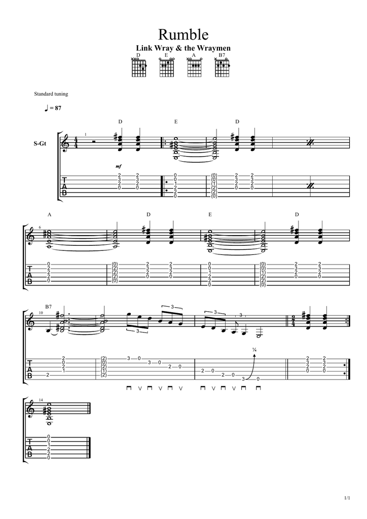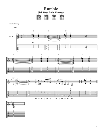 Rumble Link Wray & the Wraymen D E A B7 1 1 2 2 1 3 1 2 3 2 3 4 3 Standard tuning = 87 D E D 1 S-Gt 2 3 2 0 2 3 2 0 A 0 0 1 2 2 0 (0) (0) (1) (2) (2) (0) D 2 3 2 0 2 3 2 0 E D 6 0 2 2 2 0 (0) (2) (2) (2) (0) 2 3 2 0 2 3 2 0 B7 0 0 1 2 2 0 (0) (0) (1) (2) (2) (0) 2 3 2 0 2 3 2 0 3 3 10 3 3 ¼ 2 2 0 2 1 (2) (0) (2) (1) (2) 3 0 3 0 2 0 2 0 2 0 2 3 2 0 3 2 3 2 0 0 14 0 0 1 2 2 0 1/1