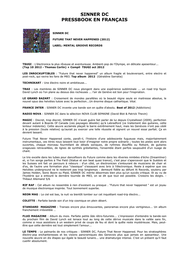 SINNER DC PRESSBOOK EN FRANÇAIS SINNER DC FUTURE THAT NEVER HAPPENED (2012) LABEL: MENTAL GROOVE RECORDS TSUGI : L'électronica la plus rêveuse et aventureuse. Ambient-pop de l'Olympe, en délicate apesenteur... (Top 10 2012 - Thomas Corlin) + Compil TSUGI oct 2012 LES INROCKUPTIBLES : "Future that never happened" un album fragile et bouleversant, entre electro et post-rock, qui ravira les fans de M83. Top album 2012 (Géraldine Sarratia) TECHNIKART : Une électro noire et ambitieuse... TRAX : Les membres de SINNER DC nous plongent dans une expérience subliminale ... un road trip façon David Lynch où l'on plane au dessus des rocheuses ... l'air de Genève est bon pour l'inspiration. LE GRAND BAZART : Croisement de mondes parallèles où la beauté règne seule en maitresse absolue, le nouvel opus des helvètes tutoie avec la perfection...Un énorme disque cathartique. Vital. FRANCE INTER : SINNER DC invente une bande son en quête d'absolu. Best of 2012 (Addictions) RADIO NOVA : SINNER DC dans la sélection NOVA CLUB SEMAINE (David Blot & Patrick Thevin) MAGIC : Discret, trop discret, SINNER DC n'avait guère fait parler de lui depuis Crystallized (2009), perfection devant autant à Boards Of Canada (ces paysages désolés) qu'à Labradford (ce traitement des guitares, cette lenteur indolente). Cette œuvre acclamée plaçait la barre extrêmement haut, mais les Genévois n'ont pas cédé à la pression (toute relative) qu'aurait pu exercer une telle réussite et signent un nouvel essai parfait. Ça en devient lassant. Future That Never Happened conte, paraît-il, l'histoire d'une adolescente fugueuse mais, majoritairement instrumentaux, ces titres nous laissent tout loisir d'imaginer notre propre scénario ; toutes les pistes sont alors ouvertes, chaque morceau fourmillant de détails soniques, de rythmes étouffés ou flottant, de guitares orageuses retravaillées, de lignes de synthés grésillantes, l'ensemble étant parfois saupoudré d'un nuage de chant. Le trio excelle dans les tubes pour dancefloors du Future comme dans les rêveries nimbées d'écho (Dreamliner) et, si l'on songe parfois à The Field (Statue et son beat quasi trance), c'est pour s'apercevoir que le Suédois et les Suisses ont fait un parcours à rebours : d'un côté, un électronicien s'entourant de musiciens de chair et d'os, de l'autre une formation plus “classique” s'essayant avec brio à l'électronique. Reste à espérer que ces Helvètes underground ne le resteront pas trop longtemps : demeuré fidèle au défunt Ai Records, soutenu par James Holden, Sonic Boom ou Plaid, SINNER DC mérite désormais bien plus qu'un succès critique. Et au vu de l'hystérie qui a entouré la dernière tournée de M83, on se dit que tout est possible. Croisons les doigts. Thibaut Allemand 5/6 RIF RAF : Cet album ne ressemble à rien d'existant ou presque . "Future that never happened " est un joyau de musique électronique inspirée. Tout bonnement superbe. NEON MAG : Le ciel est bas, la nuit va bientôt tomber sur cet inquiétant road-trip électro... COLETTE : Parfaite bande son d'un trip cosmique en plein désert. STANDARD MAGAZINE : Transes encore plus émouvantes, panoramas encore plus vertigineux... Un album franchement irrésistible … FLUO MAGAZINE : Album du mois. Parfaite petite ôde rétro-futuriste... L'impression d'entendre la bande-son du prochain film de David Lynch est tenace tout au long de cette dérive musicale dans la vallée sans fin, comme si nous assistions à un western privé de coups de feu et dont la quête reste mystérieuse. Mais, peutêtre que cette dernière est tout simplement l'amour... LE TEMPS : Le palmarès de nos critiques : SINNER DC, Future That Never Happened. Pour les stratosphères électro-pop enchanteresses et les visions panoramiques des Genevois plus que jamais en apesanteur. Une nouvelle œuvre en dix étapes qui égale la beauté lunaire... une dramaturgie intense. C’est un présent qu’il faut cueillir absolument. VACARM : Une électro-pop inclassable puisant dans des ambiances electronica pour une épopée lancinante et torturée, un véritable voyage initiatique dans l’atmosphère d’un album concept racontant la fugue d’un adolescent, disséminant de-ci de-là des envolées électroniques et des vocaux aériens soutenus par des rythmes éthérés. LA PLANETE BLEUE : L'espace est-il vraiment... flexible? Y a-t-il eu un début au temps? Quel est l'avenir du futur? Au menu : SINNER DC VICE : ...l’impression irrésistible de voyager en sous-marin au plus profond des abysses... ZUT MAGAZINE : SINNER DC dans la sélection Best of 2012 ! POP IS ON FIRE : Top 2012 de Pop is on Fire MUSIQU'AZIMUTS : Est-ce que l’une des injustices les plus flagrantes de ces dernières années va enfin cesser ? Le groupe suisse SINNER DC paye probablement le prix de sa discrétion malgré une production irréprochable, faisant se succéder à un rythme régulier des albums entre pop et electro cotoyant bien souvent la perfection. L'HEBDO : Si son nouvel album impose à la première écoute une ambient élégiaque, on est rapidement saisis par des beats plus rugueux et de subtiles accélérations, donnant une belle profondeur à cette electronica privilégiant toujours, envers et contre tout, l’émotion. Une fois encore, SINNER DC égale les meilleures productions du label Warp. "Hey Girl" sur tout les vols longs courrier Air France! LE COURRIER : Equilibré entre écoute attentive et titres plus rythmés, l’album se prête au voyage, «trip» chamanique débutant dans un canyon désert.SINNER DC, des architectes du son qui matérialisent leurs rêves. EDELWEISS : Un album au son somptueux, qui entraîne les galaxies au fond d’un canyon, entre mélancolie épique, ésotérisme capiteux et bains rituels de lumière psychédélique… RTS : SINNER DC invente la techno Canyon… 2MUCHPONEY : Découverte de taille donc, tant le disque nous aura laissé sans voix. On voyage, on