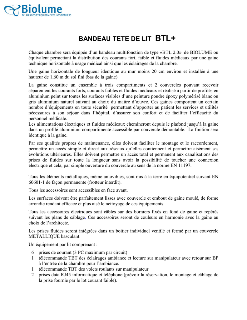 BANDEAU TETE DE LIT BTL+ Chaque chambre sera équipée d’un bandeau multifonction de type «BTL 2.0» de BIOLUME ou équivalent permettant la distribution des courants fort, faible et fluides médicaux par une gaine technique horizontale à usage médical ainsi que les éclairages de la chambre. Une gaine horizontale de longueur identique au mur moins 20 cm environ et installée à une hauteur de 1,60 m du sol fini (bas de la gaine). La gaine constitue un ensemble à trois compartiments et 2 couvercles pouvant recevoir séparément les courants forts, courants faibles et fluides médicaux et réalisé à partir de profilés en aluminium peint sur toutes les surfaces visibles d’une peinture poudre époxy polymérisé blanc ou gris aluminium naturel suivant au choix du maitre d’œuvre. Ces gaines comportent un certain nombre d’équipements en toute sécurité permettant d’apporter au patient les services et utilités nécessaires à son séjour dans l’hôpital, d’assurer son confort et de faciliter l’efficacité du personnel médicale. Les alimentations électriques et fluides médicaux chemineront depuis le plafond jusqu’à la gaine dans un profilé aluminium compartimenté accessible par couvercle démontable. La finition sera identique à la gaine. Par ses qualités propres de maintenance, elles doivent faciliter le montage et le raccordement, permettre un accès simple et direct aux réseaux qu’elles contiennent et permettre aisément ses évolutions ultérieures. Elles doivent permettre un accès total et permanent aux canalisations des prises de fluides sur toute la longueur sans avoir la possibilité de toucher une connexion électrique et cela, par simple ouverture du couvercle au sens de la norme EN 11197. Tous les éléments métalliques, même amovibles, sont mis à la terre en équipotentiel suivant EN 60601-1 de façon permanente (frotteur interdit). Tous les accessoires sont accessibles en face avant. Les surfaces doivent être parfaitement lisses avec couvercle et embout de gaine moulé, de forme arrondie rendant efficace et plus aisé le nettoyage de ces équipements. Tous les accessoires électriques sont câblés sur des borniers fixés en fond de gaine et repérés suivant les plans de câblage. Ces accessoires seront de couleurs en harmonie avec la gaine au choix de l’architecte. Les prises fluides seront intégrées dans un boitier individuel ventilé et fermé par un couvercle METALLIQUE basculant. Un équipement par lit comprenant : 6 prises de courant (3 PC maximum par circuit) 1 télécommande TBT des éclairages ambiance et lecture sur manipulateur avec retour sur BP à l’entrée de la chambre pour l’ambiance. 1 télécommande TBT des volets roulants sur manipulateur 2 prises data RJ45 informatique et téléphone (prévoir la réservation, le montage et câblage de la prise fournie par le lot courant faible). 1 prise pour appel infirmière (prévoir la réservation, le montage et câblage de la prise fournie par le lot courant faible). prises fluides prétubées (Oxygène, Air Médicale et Vide) 3 Eclairages Intégrés à la gaine technique, diffusants polycarbonate incassables, insensibles au jaunissement par UV et fixés à la gaine par clippage afin d’autoriser leur démontage à l’aide d’un outil. Aucune retenue de poussiére. Les lampes ne doivent pas être visible directement (visiteur ou personnel soignant en situation debout), ni visibles par le patient couché, conformes aux recommandations AFE relatives à l’éclairage en milieu hospitalier pour la protection des patients et du corps soignant. Eclairage ambiance Par éclairage indirect au moyen de 2 lampes 54w/T5 alimentées par équipements hautes fréquences électronique. • • • • Ambiance EN = 100 lux. Plafond : maximum 500 cd/m² Luminance maximum 1.000 cd/m². Tube fluorescent 4000°K, IRC ≥ 80, version T5 à allumage électronique. Eclairage de lecture Caractéristiques d’un éclairage de lecture ou direct au moyen de 1 lampe 24w/T5 alimentées par équipements hautes fréquences électronique. • EN = 200 lux sur le plan de lecture de 900 x 300 mm, incliné à 75° par rapport au plan transversal au lit, situé à 1.100 mm en hauteur (le plan de couchage/matelas pouvant varier en hauteur de 550 mm à 950 mm), mesuré à 1.000 mm de mur.Luminance maximum 1.000 cd/m². • Tube fluorescent 4000°K, IRC ≥ 80, version T5 à allumage électronique Eclairage de soins Eclairage direct de 300 lux minimum sur le lit. Cet éclairage ne doit pas éblouir le personnel soignant. Le système utilisera une seconde lampe de lecture 24w indépendante commandée individuellement par un inter simple allumage sous le bandeau. Eclairage de veille Eclairage intégré dans la partie supérieure de la gaine technique horizontale procure un éclairage permettant au patient de se guider s’il doit se déplacer la nuit. Cet éclairage sera réalisé par technologie LED sur douille E14 pour son infime consommation et surtout son faible relamping. Un inter en entrée de chambre commandera l’allumage de la veille. Un diffuseur en polycarbonate clair démontable protégera cette source. Responsabilité Sous la responsabilité d’une entreprise unique, les gaines têtes de lits doivent arriver sur le chantier complètement équipées, totalement pré-câblées, pré-tubées et prêtes à être branchées aux réseaux électriques et fluides médicaux afin de correspondre aux attentes du marquage CE médical (directive 93/42) Le produit est donc un ensemble complet et reste sous l’entière responsabilité de l’entreprise jusqu’à la réception par le Maître d’Ouvrage. Limites de l’entreprise L’entreprise fluides médicaux raccordera au réseau fluides médicaux les bandeaux de lits après réception des documents attestant la conformité des bandeaux au marquage CE médical en classe IIb afin de pouvoir marquer son propre réseau. L’entreprise adjudicataire n’a