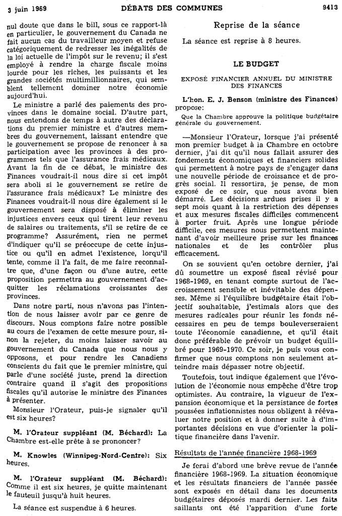3 juin 1969 DÉBATS DES COMMUNES nul doute que dans le bill, sous ce rapport-là en particulier, le gouvernement du Canada ne fait aucun cas du travailleur moyen et refuse catégoriquement de redresser les inégalités de la loi actuelle de l'impôt sur le revenu; il s'est à rendre la charge fiscale moins lourde pour les riches, les puissants et les grandes sociétés multimillionnaires, qui semblent tellement dominer notre économie aujou.rd'hui. Le ministre a parlé des paiements des proinc ces dans le domaine social. D'autre part, nous entendons de temps à autre des déclarations du premier ministre e t d'autnes membres du gouvernement, laissant entendre que le gouvernement se propose de renoncer à sa participation avec les provinces à des programmes tels que l'assurance fra.is médicaux. Avant la fin de ce débat, le ministre des Finances voudrait-il nous dire si cet impôt sera aboli si le gouvernement se retire de l'assurance frais médicaux? Le ministre des Finances voudrait-il nous dire également si le gouvernement sera disposé à éliminer les injustices envers ceux qui tirent leur revenu de salaires ou traitements, s'il se retire de ce programme? Assurément, rien ne permet d'indiquer qu'il se préoccupe de cette injustice ou qu'il e n admet l'existence, lorqu'il tente, comme il l'a fait, de me faire reconnaitre que, d'une façon ou d'une autre, cette proposition permettra au gouvernement d'acquitter les réclamations croissantes des Provinces. Dans notre parti, nous n'avons pas l'intention de nous laisser avoir par c e genre de discours. Nous comptons faire notre possible au cours de l'examen de cette mesure pour, sinon la rejeter, du moins laisser savoir a u gouvernement du Canada que nous nous y opposons, et pour rendre les Canadiens conscients du fait que &e premier ministre, qui Parle d'une société juste, prend la direction contraire quand il s'agit des propositions fiscales qu'il autorise le ministre des Finances a Présenter. Monsieur l'orateur, puis-je signaler qu'il est six heures? M. l'orateur suppléant (M. Béchard): La Chambre est-elle prête à se prononcer? R e p r i s e d e la s é a n c e La séance est reprise à 8 heures. LE BUDGET EXPOSÉ FINANCIER ANNUEL DU MINISTRE DES FINANCES L'hon. E. J. Benson (minisire des Finances) propose: Que la Chambre approuve la politique budgétaire générale du gouvernement. -Monsieur l'orateur, lorsque j'ai présenté mon premier budget à ia Chambre en octobre dernier, j'ai dit qu'il nous fallait assurer des fondements économiques e t financiers solides qui permettent à notre pays de s'engager dans une nouvelle période de croissance et de progrès social. Il ressortira, je pense, de mon exposé de ce soir, que nous avom bien démarré. Les décisions ardues prises il y a sept mois quant à la restriction des dépenses et aux mesures fiscales difficiles commencent à porter fruit. Après une longue période difficile, ces mesures nous permettent maintenant d'avoir meilleure prise sur les finances nationales et de les contrôler plus efficacement. On se souvient qu'en octobre dernier, j'ai dû soumettre un exposé fiscal révisé pour 1968-1969, en tenant compte surtout de l'accroissement sensible et inévitable des dépenses. Même si l'équilibre budgétaire était l'objectif souhaitable, j'estimais alors que des mesures radicales pour réunir les fonds nécessaires en peu de temps bouleverseraient toute l'économie canadienne, et qu'il était donc préférable de prévoir un budget équilibré pour 1969-1970. Ce soir, je puis vous confirmer que nous comptons non seulement atteindre mais dépasser notre objectif. Toutefois, tout indique également que l'évolution de l'économie nous empêche d'être trop optimistes. Au contraire, la vigueur de l'expansion économique et la persistance de fortes poussées inflationnistes nous obligent à réévaluer notre position et à donner suite à d'importantes décisions e n vue d'orienter la politique financière dans l'avenir. M. Knowles (Winnipeg-Nord-Centre): Six Résultats de l'année financière 1968-1969 heures. J e ferai d'abord une brève revue de llann&e 1968-1969. La situation économique M. l'Orateur suppléanf (M. Béchard): efinancière t les résultats financiers de l'année passée il est six heures, je quitte maintenant sont exposés en détail dans les documents le fauteuil jusqu'à huit heures. budgétaires déposés mardi dernier. Les faits La séance est suspendue à 6 heures. saillants ont été l'apparition d'une forte 9414 DÉBATS DES COMMUNES relance de l'économie, un accroissement des recette;; :~ic:; rapide qu'on n î le prévoyait et certains résultats prcjduits par un contrdle rigo~xet:xdes dépen:;es. Ainsi, non seuleinent le déficit hudgGtîirc a é16 sensibiement '&duit par rapport a l'année fisancicre précéderi.te, mais il a été dc 109 millions de doilars inlbrieur au chiffre prfivu dans lc budget d'octobre. II ressort aussi des c!iilircs pr'rliainaires qua, m$i-fia si les dépenses glcbsles ont augmen% de qüelqu-. 9 p. 100, la rnoitié de cette augmentation réziilte dc paiements plus éleaux province,. Ces paiements, qu'il s'agisse de transferts fiscaux inconditionnels ou dc su::~veiitlons pour des programmes à frais partagés I? l'égard de la santé, d l ~bicn-ctre social et de i ' e n ~ e i ~ e m e nont t , a~lgment8de plus de 4.53 miilians a c dollars, soit de quelque 27 p. 100. Il y a eu un montant supplémentaire de 178 millions de dollars au titre des frais de la dette publique. L'augmentation imputable à tous les autres programmes et services fédéraux prévus dans le budget a été meintenue à moins de 4 p. 100, ce qui est inférieur au talix d'augmentation des salaires et des prix dans l'ensemble d u pays. Malgré tout ce qu'on a dit à l'encontre, ce résultat prouve indubitablement le succèr; de n?s eiforts eii vLie de restreindre nos dépenses et de les rkdcire partout où c'était possible. En octobre, j'ai anno