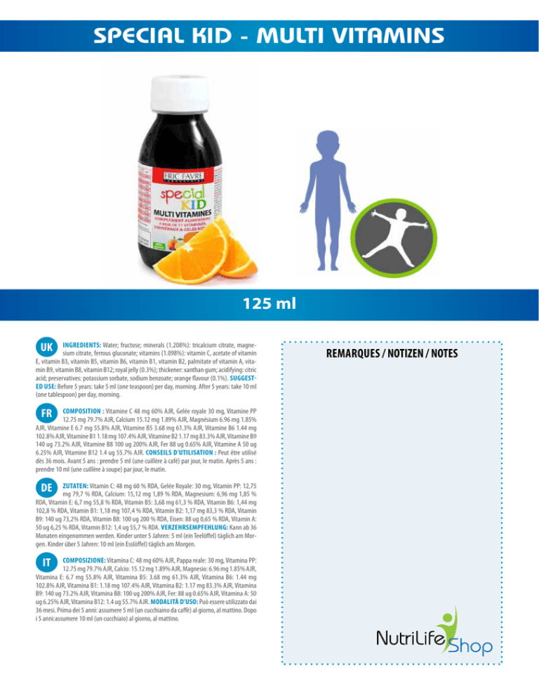 SPECIAL KID - MULTI VITAMINS 125 ml UK INGREDIENTS: Water; fructose; minerals (1.208%): tricalcium citrate, magnesium citrate, ferrous gluconate; vitamins (1.098%): vitamin C, acetate of vitamin E, vitamin B3, vitamin B5, vitamin B6, vitamin B1, vitamin B2, palmitate of vitamin A, vitamin B9, vitamin B8, vitamin B12; royal jelly (0.3%); thickener: xanthan gum; acidifying: citric acid; preservatives: potassium sorbate, sodium benzoate; orange flavour (0.1%). SUGGESTED USE: Before 5 years: take 5 ml (one teaspoon) per day, morning. After 5 years: take 10 ml (one tablespoon) per day, morning. FR COMPOSITION : Vitamine C 48 mg 60% AJR, Gelée royale 30 mg, Vitamine PP 12.75 mg 79.7% AJR, Calcium 15.12 mg 1.89% AJR, Magnésium 6.96 mg 1.85% AJR, Vitamine E 6.7 mg 55.8% AJR, Vitamine B5 3.68 mg 61.3% AJR, Vitamine B6 1.44 mg 102.8% AJR, Vitamine B1 1.18 mg 107.4% AJR, Vitamine B2 1.17 mg 83.3% AJR, Vitamine B9 140 ug 73.2% AJR, Vitamine B8 100 ug 200% AJR, Fer 88 ug 0.65% AJR, Vitamine A 50 ug 6.25% AJR, Vitamine B12 1.4 ug 55.7% AJR. CONSEILS D’UTILISATION : Peut être utilisé dès 36 mois. Avant 5 ans : prendre 5 ml (une cuillère à café) par jour, le matin. Après 5 ans : prendre 10 ml (une cuillère à soupe) par jour, le matin. DE ZUTATEN: Vitamin C: 48 mg 60 % RDA, Gelée Royale: 30 mg, Vitamin PP: 12,75 mg 79,7 % RDA, Calcium: 15,12 mg 1,89 % RDA, Magnesium: 6,96 mg 1,85 % RDA, Vitamin E: 6,7 mg 55,8 % RDA, Vitamin B5: 3,68 mg 61,3 % RDA, Vitamin B6: 1,44 mg 102,8 % RDA, Vitamin B1: 1,18 mg 107,4 % RDA, Vitamin B2: 1,17 mg 83,3 % RDA, Vitamin B9: 140 ug 73,2% RDA, Vitamin B8: 100 ug 200 % RDA, Eisen: 88 ug 0,65 % RDA, Vitamin A: 50 ug 6,25 % RDA, Vitamin B12: 1,4 ug 55,7 % RDA. VERZEHRSEMPFEHLUNG: Kann ab 36 Monaten eingenommen werden. Kinder unter 5 Jahren: 5 ml (ein Teelöffel) täglich am Morgen. Kinder über 5 Jahren: 10 ml (ein Esslöffel) täglich am Morgen. IT COMPOSIZIONE: Vitamina C: 48 mg 60% AJR, Pappa reale: 30 mg, Vitamina PP: 12.75 mg 79.7% AJR, Calcio: 15.12 mg 1.89% AJR, Magnesio: 6.96 mg 1.85% AJR, Vitamina E: 6.7 mg 55.8% AJR, Vitamina B5: 3.68 mg 61.3% AJR, Vitamina B6: 1.44 mg 102.8% AJR, Vitamina B1: 1.18 mg 107.4% AJR, Vitamina B2: 1.17 mg 83.3% AJR, Vitamina B9: 140 ug 73.2% AJR, Vitamina B8: 100 ug 200% AJR, Fer: 88 ug 0.65% AJR, Vitamina A: 50 ug 6.25% AJR, Vitamina B12: 1.4 ug 55.7% AJR. MODALITÀ D‘USO: Può essere utilizzato dai 36 mesi. Prima dei 5 anni: assumere 5 ml (un cucchiaino da caffè) al giorno, al mattino. Dopo i 5 anni:assumere 10 ml (un cucchiaio) al giorno, al mattino. REMARQUES / NOTIZEN / NOTES