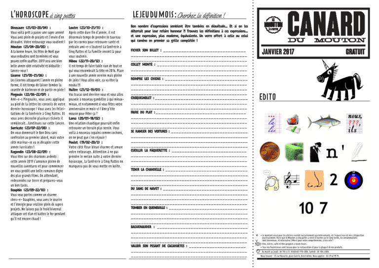 L’HOROSCOPE à cinq pattes Dinosaure (21/03-20/04) : Loutre (23/10-21/11) : Vous voilà prêt à passer une super année! Après cette dure fin d’année, il est Vous avez plein de projets et l’envie d’en désormais temps de prendre le taureau découdre. Votre entourage vous soutient ! par les cornes pour retrouver santé et Mouton (21/04-20/05) : entrain ami-e-s loutres! La Confrérie à A la bonne heure, les fêtes de Noël que Cinq Pattes et la Famille seront là pour vous redoutiez sont terminées et vous vous soutenir. pouvez enfin souffler. 2017 sera une bien Hibou (22/11-20/12) : belle année côté créativité et bidouille : Il est temps de faire table rase de tout ce lancez-vous ! qui vous encombrait la tête en 2016. Place Licorne (21/05-21/06) : à une nouvelle année sereine mais pleine Les licornes attaquent l’année en pleine de joies ! Vous allez voir, ça va être la forme, il est temps de laisser tomber la nouba !!! couette de bûcheron et de partir en piste ! Huître (21/12-19/01) : Pingouin (22/06-22/07) : Vos tracas sont derrière vous et vous allez Ami-e-s Pingouins, vous avez appliqué pouvoir à nouveau gambiller à qui mieuxau pied de la lettre les conseils de votre mieux, et n otamment si vous fêtez votre dernier horoscope ! Vous avez les félici- anniversaire ce mois-ci ! Une p’tite tations de la Confrérie à Cinq Pattes. Et mousse pour fêter ça ? vous avez décroché plusieurs tickets il Lama (20/01-18/02) : semblerait...Continuez sur cette lancée. Une relation chaotique pourrait enfin Surricate (23/07-22/08) : retrouver un terrain plus serein. Vous On vous donnerait le Bon Dieu sans voilà à nouveau copains comme cochons, confession au premier abord, mais votre on ne peut que s’en réjouir ! côté marieur-se va se décupler cette Poulet (19/02-20/3) : année Surricates ! Votre côté fleur bleue charme et amuse Ragondin (23/08-22/09) : votre entourage. Attention à ne pas Vous êtes sur des charbons ardents : prendre le melon suite à votre dernier cette année 2017 s’annonce pleine de horoscope, la Confrérie à Cinq Pattes ne nouvelles aventures et pour commencer manquera pas de vous mette en boîte. on vous prédit une belle romance digne des plus grands films. En attendant, redescendez sur terre et préparez-vous un bon tacos. Dauphin (23/09-22/10) : Vous vous portez comme un charme chers-e- Dauphins, vous avez le sourire et l’énergie pour réaliser plein de supers projets. Ne laissez pas le froid hivernal attaquer cet élan et battez le fer pendant qu’il est encore chaud ! LEJEUDUMOIS:Cherchez la définition ! Bon nombre d’expressions semblent être tombées en désuétude... Et si on les déterrait pour leur refaire honneur ?! Trouvez les définitions à ces expressions... et une expression, plus moderne, équivalente. Un verre offert à celle ou celui qui ramène en premier sa grille complétée ! FICHER SON BILLET : ________________________________ _____________________________________________ _____________________________________________ COLLET MONTÉ : ___________________________________ _____________________________________________ _____________________________________________ ROMPRE LES CHIENS : ________________________________ _____________________________________________ _____________________________________________ _____________________________________________ CROQUIGNOLET : ____________________________________ _____________________________________________ _____________________________________________ FAIRE DU PLAT : ___________________________________ _____________________________________________ _____________________________________________ _____________________________________________ SE RANGER DES VOITURES : ______________________________ _______________________________________________ _______________________________________________ ______________________________________________ CUEILLIR LA PÂQUERETTE : _____________________________ _____________________________________________ _____________________________________________ _____________________________________________ TENIR LA CHANDELLE : ________________________________ ______________________________________________ ______________________________________________ ______________________________________________ DU SANG DE NAVET : _________________________________ ______________________________________________ ______________________________________________ _____________________________________________ TOMBER EN QUENOUILLE : _______________________________ _______________________________________________ ______________________________________________ ______________________________________________ BAGUENAUDER : ___________________________________ _____________________________________________ _____________________________________________ _____________________________________________ VALOIR SON PESANT DE CACAHUÈTES : ______________________ _____________________________________________ _____________________________________________ JANVIER 2017 EDITO • Le montant versé pour les ateliers revient exclusivement aux intervenants, et l’espace leur est mis à disposition gracieusement. Parce que le Mouton à cinq pattes a envie d’exister sur le long terme, les consommations sont bienvenues, et nécessaires ! Merci pour votre compréhension, à très vite ! • Vins, bières, cafés et thés proposés à toute heure. • Tous nos fournisseurs sont locaux pour la restauration et pour la plupart de nos produits . Du mardi au jeudi : de 11h à 21. Vendredi /11h-00h. Samedi : de 14h à 00h. Nous trouver : 25 rue Navarin, place Guérin, Brest même. Nous appeler : 02 29 62 99 91. /// PROGRAMME JANVIER2017 /// MAR 18h-20h : Dépôt de paniers bio avec la ferme de Biodivy. Sur réservations. 19h-21h : Vernissage de l’exposition de Claire Szutka, en sa présence. 3 VEN 6 L’EXPODUMOIS:C laire Sztuka Sans savoir réellement d’ou émane cette énergie, je la ressens et je l