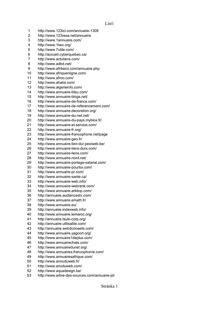 List1 1 2 3 4 5 6 7 8 9 10 11 12 13 14 15 16 17 18 19 20 21 22 23 24 25 26 27 28 29 30 31 32 33 34 35 36 37 38 39 40 41 42 43 44 45 46 47 48 49 50 51 52 53 http://www.123ici.com/annuaire-1308 http://www.123resa.net/annuaire http://www.1annuaire.com/ http://www.1two.org/ http://www.7utile.com/ http://accueil.cyberquebec.ca/ http://www.actuliens.com/ http://www.adbd.net/ http://www.afrikeco.com/annuaire.php http://www.afriquenligne.com/ http://www.afroo.com/ http://www.ahalia.com/ http://www.algerieinfo.com/ http://www.annuaire-bleu.com/ http://www.annuaire-blogs.net/ http://www.annuaire-de-france.com/ http://www.annuaire-de-referencement.com/ http://www.annuaire-decoration.org/ http://www.annuaire-du-net.net/ http://www.annuaire-du-pays.myblox.fr/ http://www.annuaire-et-service.com/ http://www.annuaire-fr.org/ http://www.annuaire-francophone.net/page http://www.annuaire-geo.fr/ http://www.annuaire-lien-dur.pexiweb.be/ http://www.annuaire-liens-durs.com/ http://www.annuaire-liens.com/ http://www.annuaire-nord.net/ http://www.annuaire-portage-salarial.com/ http://www.annuaire-pourtoi.com/ http://www.annuaire-pr.com/ http://www.annuaire-sante.ca/ http://www.annuaire-web.info/ http://www.annuaire-webrank.com/ http://www.annuaire.arkitop.com/ http://annuaire.audiencestv.com/ http://www.annuaire.emath.fr/ http://www.annuaire.eu/ http://annuaire.indexweb.info/ http://www.annuaire.lemaroc.org/ http://annuaire.tsuki-corp.org/ http://annuaire.utilisable.com/ http://annuaire.webdconseils.com/ http://www.annuaire.yagoort.org/ http://www.annuaire1deplus.com/ http://www.annuairechats.com/ http://www.annuairedunet.org/ http://www.annuaires-francophonie.com/ http://www.annuairesafrique.com/ http://www.annuduweb.fr/ http://www.anoduweb.com/ http://www.aquadesign.be/ http://www.arbre-des-sources.com/annuaire-jdr Stránka 1 List1 54 55 56 57 58 59 60 61 62 63 64 65 66 67 68 69 70 71 72 73 74 75 76 77 78 79 80 81 82 83 84 85 86 87 88 89 90 91 92 93 94 95 96 97 98 99 100 101 102 103 104 105 106 http://www.archeophile.com/ http://www.awreferencement.com/annuaire_fr http://www.babulle.com/ http://www.beehoo.com/ http://www.best-fr.com/ http://www.bestannuaire.net/ http://www.big-annuaire.com/ http://blagues.x-annuaires.com/ http://www.blogonautes.com/ http://www.bloxdir.fr/ http://www.blue.lu/ http://www.bon-site.com/ http://www.boncap.com/ http://www.boussole-fr.com/ http://www.campingcaravaning.ca/annuaire http://www.cecif.com/ http://www.celebrite.be/ http://www.chercher.eu.com/ http://www.cliweb.com/annuaire http://www.cluzz.com/ http://www.colorimetrie.be/annuaire.php http://www.compare-le-net.com/ http://www.contre-offre.com/ http://www.cote.azur.fr/annuaire http://www.denicher.com/ http://www.depensez.com/ http://www.dicodunet.com/annuaire http://www.dicorama.com/ http://www.direct-annuaire.com/ http://www.directory-web-sites.onesurf.fr/ http://www.djibnet.com/ http://www.e-annuaire.net/ http://www.ecupidon.com/ http://www.edenlord.net/annuaire http://www.el-annuaire.com/ http://www.exportation.org/ http://www.flesko.com/ http://www.fou2sport.com/ http://www.franceliens.com/ http://www.francesurf.net/ http://www.francetop.com/ http://www.francite.com/ http://www.free-annu.fr.nf/ http://www.free-scores.com/ http://www.frenchclassified.com/ http://www.furty.com/ http://www.genevanight.ch/ http://www.glaneur.fr/ http://gratuit.hitclic.com/ http://www.gratuitement.org/ http://www.gratuitout.com/ http://www.grocodile.com/ http://guide-oueb.evoconcept.net/ Stránka 2 List1 107 108 109 110 111 112 113 114 115 116 117 118 119 120 121 122 123 124 125 126 127 128 129 130 131 132 133 134 135 136 137 138 139 140 141 142 143 144 145 146 147 148 149 150 151 152 153 154 155 156 157 158 159 http://www.guitar-directory.com/ http://www.hebdotop.com/ http://www.hitmaroc.net/ http://hommarobase.hommart.net/ http://www.icommerces.ch/annu http://www.idfabrik.com/annuaire http://www.index.connexpro.com/ http://www.indexa.fr/ http://www.infoantilles.com/ http://www.italiq-expos.com/ http://www.itinerances.info/ http://www.joelouvier.info/ http://www.kouaa.com/ http://www.lagitane.com/ http://www.lalogitheque.com/ http://www.lebest.fr/ http://www.lesannuaires.com/ http://www.lewub.com/ http://www.liensfrancais.net/ http://www.littoral-ouest.com/ http://www.looking.fr/ http://www.love-references.com/guide http://lowin.1annuaire.com/ http://www.ludomanie.com/ http://www.lyon-web.net/ http://www.mariage.ws/ http://www.marweb.com/ http://www.marweb.com/libye http://www.mbolo.com/ http://www.mdpublicite.com/annuairegen/pageannuaire.htm http://www.meilleurduweb.com/ http://www.mezidir.com/ http://www.mirti.com/ http://www.monentreprise.myannuaire.com/ http://www.mongenie.com/ http://www.monsite.net/ http://www.monsurf.com/ http://www.montmain.com/ http://www.mylinea.com/annuaire-gagnant http://neogogol.free.fr/ http://www.netoo.com/ http://www.noogle.fr/ http://www.novascoop.com/ http://www.nseo.com/ http://www.onatoo.ca/ http://www.oositoo.com/ http://www.oubah.com/ http://www.ousurfer.com/ http://www.outils-web.com/ http://www.pages-presence.net/annuaire http://www.pagure.com/ http://www.paintings-directory.com/ http://www.pcparadise.fr/annuaire Stránka 3 List1 160 161 162 163 164 165 166 167 168 169 170 171 172 173 174 175 176 177 178 179 180 181 182 183 184 185 186 187 188 189 http://www.poesie-poemes.com/annuaire http://www.power-apple.com/ http://prolisteur.free.fr/ http://www.pubannuaire.com/ http://quotidien.refannuaire.com/ http://www.rentapart.com/annuaire http://www.repertoire-btob.com/ http://www.repertoire-quebec.com/ http://www.s-annuaire.com/ http://shobu.creezvotreannuaire.com/ http://www.sigles.net/ http://www.sites-fr.com/ http://www.sitespourenfants.com/ http://www.socialsquare.com/ http://superbe.creezvotreannuaire.com/ http://www.surfandbiz.com/ http://www.thollonapartment.com/links http://www.todoojeux.com/ http://www.toile.com/ http://www.toutgratuit.fr/ http://www.trouvezleamontreal.com/ http://www.trouvezleau