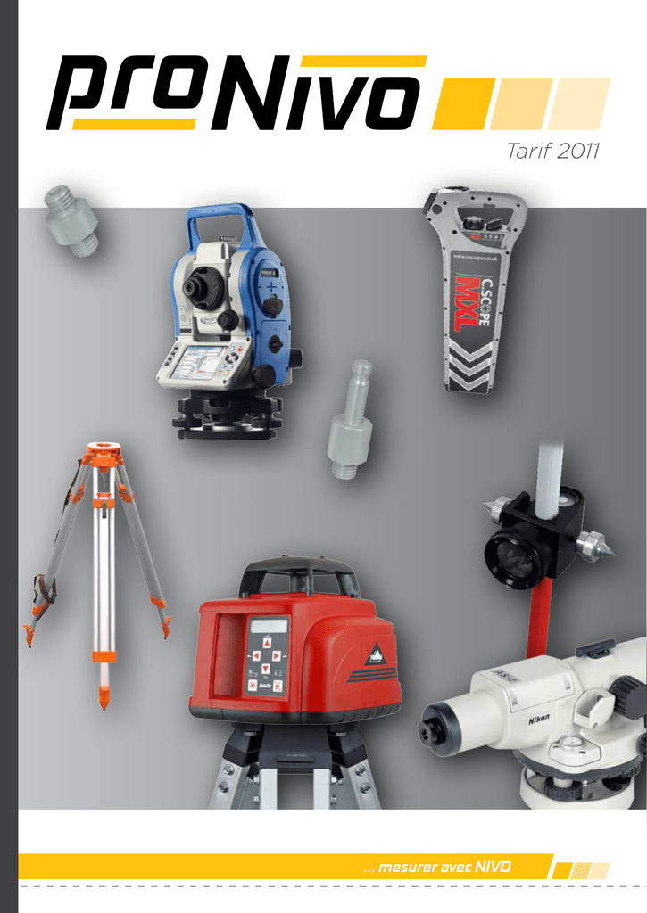 Tarif 2011 ... mesurer avec nivo Tarif 2011 Visuel des matières Code article Table Désignation Lasers rotatifs Apache Lasers rotatifs Ubexi GR Prix en € PAGE 3 3, 4 Laser de canalisation Ubexi 4 Cellules de détection Apache 4 Cellules de détection Ubexi 4 Cellules de guidage d’engins Apache 4 Accessoires pour cellules de guidage d’engins Apache 5 Lasers lignes et points Ubexi 5 Niveaux automatiques Nikon 5 Niveau optique Apache 5 Théodolites de chantier Nikon 6 Théodolite de chantier Apache 6 Détecteurs de câbles C.Scope Accessoires pour détecteurs de câbles C.Scope Guidage d’engins DigPilot 6 6, 7 7 Accessoires pour guidage d’engins DigPilot 7, 8 Stations totales Spectra avec compensateur 2 axes 8, 9 Stations totales gamme NIVO 9 Carnets de terrain Ranger 10 Carnets de terrain Recon 10 Carnets de terrain Nomad 10 Supports pour carnets de terrain 11 Logiciels 11 Accessoires Spectra 11 Accessoires pour instruments (embases, prismes, adaptateurs) 12, 13, 14 Cannes porte-prisme, cannes GPS carbone, bipodes, tripodes 15 Odomètres 15 Trépieds, mires, sacs de transport 16, 17 2 Tarif 2011 Visuel Code article Désignation GR Prix en € 102-Q104375 Mesa HL100-5 Laser rotatif horizontal avec mire différentielle et accessoires, pente manuelle ; Livré avec : mire différentielle métrique, trépied, cellule Twister avec support, manuel d’utilisation, mallette A 685,00 102-Q104377 Plateau HL300-4 Laser rotatif horizontal, pente manuelle. Livrée avec : cellule Lightning 2 avec support, batterie NiMH rechargeable, chargeur, manuel d’utilisation, mallette A 895,00 102-950298-4EU Horizon Laser rotatif horizontal avec cellule Storm. Livré avec : cellule Storm avec support, batterie NiMH rechargeable, chargeur, manuel d’utilisation, mallette A 1.515,00 102-Q104374 Mesa SL101 Laser rotatif horizontal/vertical. Livré avec : cellule Twister avec support, télécommande, trépied télescopique, mire différentielle, piles alcalines, manuel d’utilisation, mallette A 865,00 102-Q104376 Plateau SL301 Laser rotatif horizontal/vertical. Livré avec : cellule Thunder56 avec aimants et support, télécommande RC601, support mural, lunettes laser, cible, batterie NiMH rechargeable, chargeur, manuel d’utilisation, mallette A 1.199,00 102-Q104335 Summit 1 Laser rotatif horizontal/vertical avec cellule Storm. Livré avec : cellule Storm avec support, télécommande fréquence radio, batterie NiMH rechargeable, chargeur, manuel d’utilisation, mallette A 1.995,00 102-Q104336 Summit 2 Laser rotatif horizontal/vertical, pente automatique 2 axes. Livré avec : cellule Storm avec support, télécommande fréquence radio, batterie NiMH rechargeable, chargeur, manuel d’utilisation, mallette A 2.595,00 200-XR200 XR200 Laser rotatif horizontal avec compensateur pendulaire. Livré avec : 4 piles C, cellule LS6C, manuel d’utilisation, mallette B 525,00 200-XR600 XR600 Laser rotatif horizontal, pente manuelle. Livré avec : batterie NiMH rechargeable, chargeur, cellule LS6C, manuel d’utilisation, mallette B 590,00 200-XR650 XR650 Laser rotatif horizontal/vertical, pente manuelle. Livré avec : batterie NiMH rechargeable, chargeur, télécommande, cellule LS6C, cible, manuel d’utilisation, mallette B 690,00 200-XR650G XR650G Laser rotatif horizontal/vertical, pente manuelle, faisceau vert. Livré avec : batterie NiMH rechargeable, chargeur, télécommande, support mural, cible verte, manuel d’utilisation, mallette B 895,00 200-XR660 XR660 Laser rotatif horizontal/vertical. Livré avec : batterie NiMH rechargeable, chargeur, télécommande, cellule LS6C, manuel d’utilisation, mallette B 790,00 200-XR670 XR670 Laser rotatif horizontal/vertical, double pente. Livré avec : batterie NiMH rechargeable, chargeur, télécommande, cellule LS6C, cible, lunettes laser, manuel d’utilisation, mallette B 1.034,00 200-XR670G XR670G Laser rotatif horizontal/vertical, double pente, faisceau vert. Livré avec : batterie NiMH rechargeable, chargeur, télécommande, support mural, cible verte, lunettes laser vertes, manuel d’utilisation, mallette B 1.263,00 LASERS ROTATIFS APACHE LASERS ROTATIFS UBEXI 3 Tarif 2011 Visuel Code article Désignation GR Prix en € 200-XR700 XR700 Laser rotatif horizontal/vertical, pente automatique Livré avec : batterie NiMH rechargeable, chargeur, cellule LS6C, télécommande fréquence radio, manuel d’utilisation, mallette B 1.295,00 XP100 Laser de canalisation avec télécommande, étanche Livré avec : batterie NiMH rechargeable, chargeur, télécommande, cible, jeu de pies, manuel d‘utilisation, mallette B 3.100,00 LASER DE CANALISATION UBEXI 200-XP100 CELLULES DE DETECTION APACHE 102-991284 Thunder 56 Cellule avec clip et sangle de sécurité, usage intérieur. Livrée avec support et piles A 120,00 102-991283 Thunder 54 Cellule avec support et pile, usage extérieur A 120,00 102-993640 Twister Cellule avec support et piles A 195,00 102-991550 Cyclone Cellule avec support et piles A 295,00 102-993600 Lightning 2 Cellule avec support et piles A 275,00 102-994000 Storm Cellule avec support et piles A 350,00 200-LS6C LS6C Cellule pour lasers rotatifs, livrée avec support et pile 9V B 79,00 200-LVH100 LVH100 Cellule pour lasers lignes, livrée avec support et pile 9V B 90,00 CELLULES DE DETECTION UBEXI CELLULES DE GUIDADE D’ENGINS APACHE 102-991346-02 Bullseye 3+ Cellule de guidage Livrée avec : 4 accumulateurs NiMH rechargeables, chargeur universel avec adaptateur, câble de connexion allume-cigare, manuel d’utilisation, mallette A 1.250,00 102-991376-02 Bullseye 5+Cellule de guidage Livrée avec : 4 accumulateurs NiMH rechargeables, chargeur universel avec adaptateur, câble de connexion allume-cigare, manuel d’utilisation, mallette A 1.750,00 102-991326-02 Bullseye 6 Cellule de guidage avec mât magnétique MM2 Livrée avec : 4 accumulateurs NiMH rechargeables, chargeur universel avec adaptateur, câble de connexion allume-cigare, manuel d’utilisa