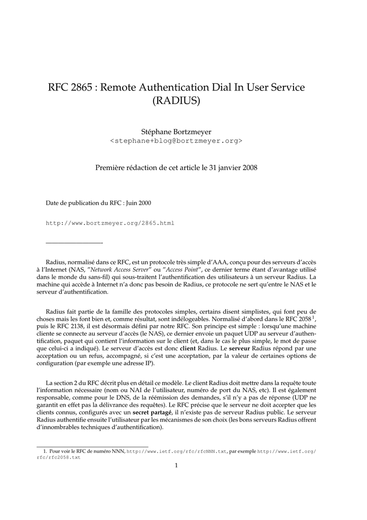 RFC 2865 : Remote Authentication Dial In User Service (RADIUS)