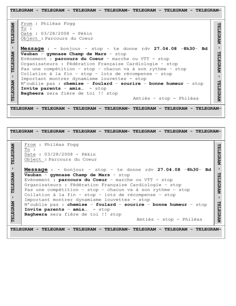From : Philéas Fogg To : Date : 03/28/2008 - Pékin Object : Parcours du Coeur Message : - bonjour – stop – te donne rdv 27.04.08 –8h30– Bd Vauban – gymnase Champ de Mars – stop Evènement : parcours du Coeur – marche ou VTT - stop Organisateurs : Fédération Française Cardiologie – stop Pas une compétition – stop – chacun va à son rythme – stop Collation à la fin – stop – lots de récompense – stop Important montrer dynamisme louvettes - stop N’oublie pas : chemise – foulard – sourire – bonne humeur – stop Invite parents – amis… - stop Bagheera sera fière de toi !! stop Amtiés – stop - Philéas TELEGRAM - TELEGRAM - TELEGRAM TELEGRAM - TELEGRAM - TELEGRAM TELEGRAM - TELEGRAM - TELEGRAM - TELEGRAM- TELEGRAM - TELEGRAM - TELEGRAM- TELEGRAM - TELEGRAM - TELEGRAM - TELEGRAM- TELEGRAM - TELEGRAM - TELEGRAM- From : Philéas Fogg To : Date : 03/28/2008 - Pékin Object : Parcours du Coeur Message : - bonjour – stop – te donne rdv 27.04.08 –8h30– Bd Vauban – gymnase Champ de Mars – stop Evènement : parcours du Coeur – marche ou VTT - stop Organisateurs : Fédération Française Cardiologie – stop Pas une compétition – stop – chacun va à son rythme – stop Collation à la fin – stop – lots de récompense – stop Important montrer dynamisme louvettes - stop N’oublie pas : chemise – foulard – sourire – bonne humeur – stop Invite parents – amis… - stop Bagheera sera fière de toi !! stop Amtiés – stop - Philéas TELEGRAM - TELEGRAM - TELEGRAM TELEGRAM - TELEGRAM - TELEGRAM TELEGRAM - TELEGRAM - TELEGRAM - TELEGRAM- TELEGRAM - TELEGRAM - TELEGRAM- TELEGRAM - TELEGRAM - TELEGRAM - TELEGRAM- TELEGRAM - TELEGRAM - TELEGRAM-