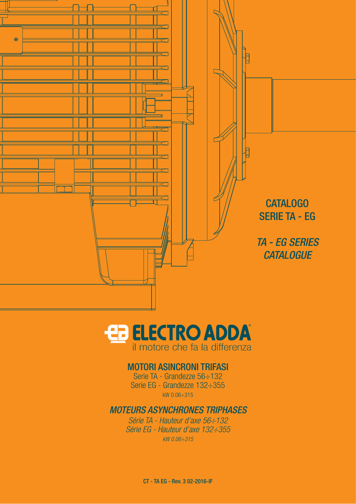CATALOGO SERIE TA - EG TA - EG SERIES CATALOGUE MOTORI ASINCRONI TRIFASI Serie TA - Grandezze 56÷132 Serie EG - Grandezze 132÷355 kW 0.06÷315 MOTEURS ASYNCHRONES TRIPHASES Série TA - Hauteur d’axe 56÷132 Série EG - Hauteur d’axe 132÷355 kW 0.06÷315 CT - TA EG - Rev. 3 02-2016-IF I dati tecnici, le dimensioni ed ogni altro dato di questo catalogo non sono impegnativi. ELECTRO ADDA S.p.A. si riserva il diritto di cambiarli in qualsiasi momento e senza preavviso. Les données techniques, les dimensions et toutes les autres données de ce catalogue ne sont pas contraignantes. ELECTRO ADDA S.p.A. se réserve le droit de les modifier à tout moment et sans préavis 2 Electro Adda S.p.A. CT - TA EG - Rev. 3 02-2016-IF MOTORI ASINCRONI TRIFASI Serie TA - Grandezze 56÷132 Serie EG - Grandezze 132÷355 MOTEURS ASYNCHRONES TRIPHASES Série TA - Hauteur d’axe 56÷132 Série EG - Hauteur d’axe132÷355 Indice Index - Validità del catalogo ................................................................................p. 5 - Descrizione generale ...............................................................................p. 5 - Ambiente di installazione ........................................................................p. 5 - Norme, Unificazioni.................................................................................p. 7 - Dichiarazione di conformità.....................................................................p. 8 - Proprietà riservata ...................................................................................p. 8 - Nota sulle sigle dei motori ......................................................................p. 8 - Forme costruttive ................................................................................... p. 9 - Grado di protezione ...............................................................................p. 10 - Particolari costruttivi .............................................................................p. 10 - Raffreddamento .....................................................................................p. 11 - Cuscinetti per motori standard ..............................................................p. 12 - Carichi ammessi sui cuscinetti .............................................................p. 13 - Cuscinetti per carichi radiali elevati ......................................................p. 17 - Intervalli di lubrificazione ......................................................................p. 19 - Targhe ...................................................................................................p. 20 - Scatola morsetti e morsettiera ...............................................................p. 20 - Gabbia di rotore ....................................................................................p. 20 - Isolamento, avvolgimento .....................................................................p. 20 - Potenza e dati tecnici.............................................................................p. 21 - Tensioni di alimentazione - Collegamento.............................................p. 21 - Oscillazioni di tensione e frequenza ......................................................p. 22 - Funzionamento a 60 Hz .........................................................................p. 22 - Foro scarico condensa ..........................................................................p. 23 - Squilibrio di tensione ............................................................................p. 23 - Servizi ...................................................................................................p. 24 - Declassamenti .......................................................................................p. 24 - Sovraccarichi ........................................................................................p. 24 - Avviamenti ............................................................................................p. 25 - Rumorosità............................................................................................p. 25 - Vibrazioni ..............................................................................................p. 25 - Protezioni termiche ...............................................................................p. 26 - Scaldiglie anticondensa ........................................................................p. 26 - Verniciatura ...........................................................................................p. 27 Dati tecnici - Rendimento e fattore di potenza a differenti carichi Motori T2A - IE2 .......................................................................p. 27 - Rendimento e fattore di potenza a differenti carichi Motori E2G - IE2 .......................................................................p. 28 - Rendimento e fattore di potenza a differenti carichi Motori T3A - IE3 .......................................................................p. 29 - Rendimento e fattore di potenza a differenti carichi Motori E3G - IE3 .......................................................................p. 30 - Classe di efficienza IE1..............................................................p. 31 - Classe di efficienza IE2..............................................................p. 35 - Classe di efficienza IE3..............................................................p. 38 - Doppia polarità..........................................................................p. 41 - Alimentazione da inverter ......................................................................p. 43 - Velocità massima ..................................................................................p. 44 - Funzionamento a potenza aumentata .....................................................p. 45 - Dimensioni d’ingombro.........................................................................p. 46 - Motori autoventilati (IC 411) .............