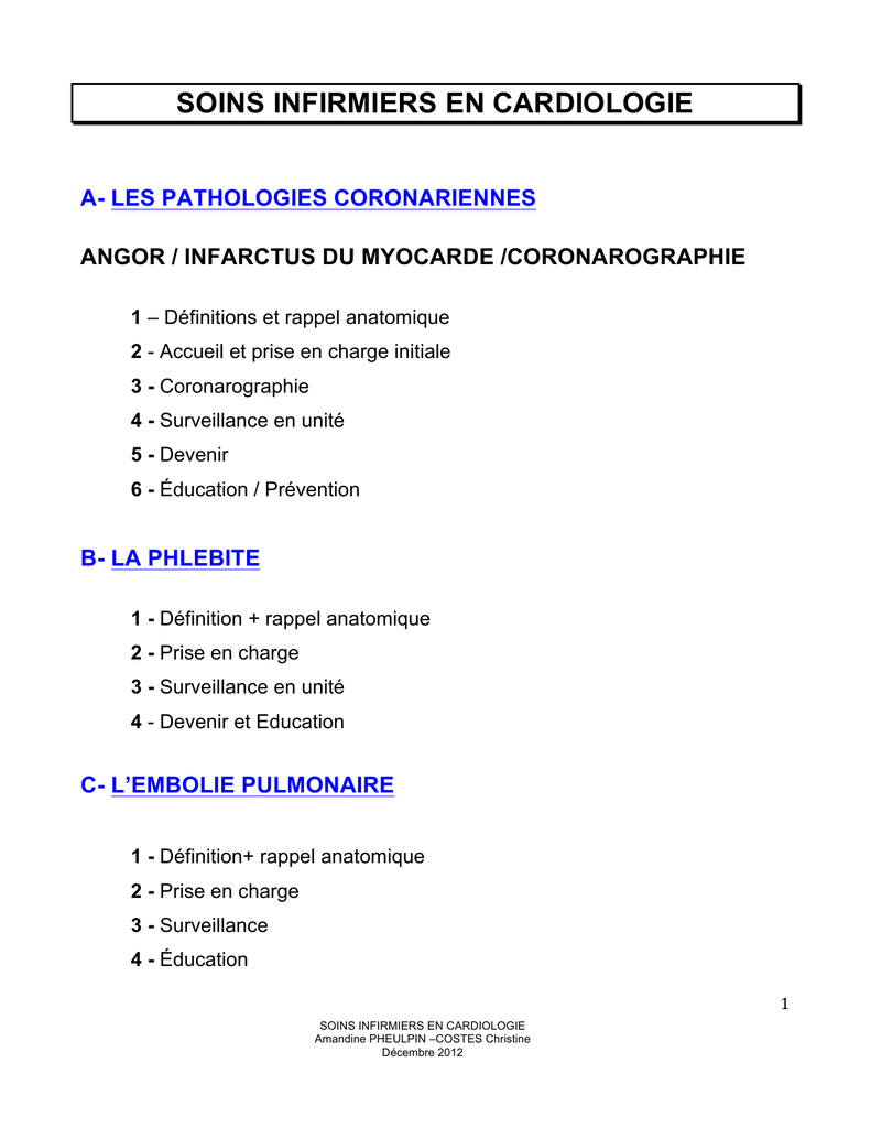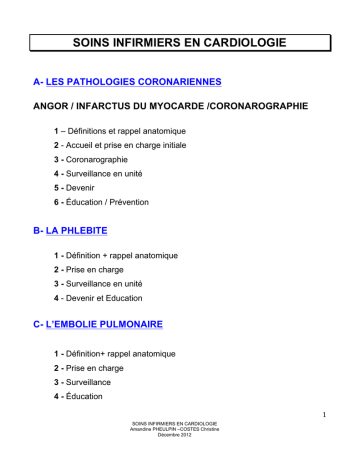 SOINS INFIRMIERS EN CARDIOLOGIE A- LES PATHOLOGIES CORONARIENNES ANGOR / INFARCTUS DU MYOCARDE /CORONAROGRAPHIE 1 – Définitions et rappel anatomique 2 - Accueil et prise en charge initiale 3 - Coronarographie 4 - Surveillance en unité 5 - Devenir 6 - Éducation / Prévention B- LA PHLEBITE 1 - Définition + rappel anatomique 2 - Prise en charge 3 - Surveillance en unité 4 - Devenir et Education C- L’EMBOLIE PULMONAIRE 1 - Définition+ rappel anatomique 2 - Prise en charge 3 - Surveillance 4 - Éducation 1 SOINS INFIRMIERS EN CARDIOLOGIE Amandine PHEULPIN –COSTES Christine Décembre 2012 A - PATHOLOGIES CORONARIENNES ANGOR / INFARCTUS DU MYOCARDE / CORONAROGRAPHIE 1. DEFINITIONS ET RAPPEL ANATOMIQUE a) L’Angor On l’appelle aussi angor d’effort. C’est la survenue de douleurs thoraciques (DT) déclenchées par l’effort et cédant à l’arrêt de l’effort. Elle est due à un déséquilibre entre les apports et les besoins en oxygène du myocarde. Ce déséquilibre est lié à un mécanisme athéromateux (de constitution lente) qui entraine une sténose (rétrécissement) ou une occlusion d’une ou plusieurs artères coronaires (artères nourricières du cœur). b) L’Angor instable Même mécanisme que l’angor instable mais en plus évolué car il y a une fissuration ou une rupture d’une plaque d’athérome suivie de la constitution d’un thrombus qui entraine une diminution du diamètre de la coronaire. Les douleurs thoraciques (DT) sont plus importantes, plus fréquentes et plus longues, elles surviennent lors d’efforts minimes ou au repos, sont de moins en moins sensibles à la TNT. L’angor instable peut alors faire craindre la survenue d’un infarctus du myocarde (IDM), c’est pour cette raison que l’angor instable est aussi appelé syndrome de menace. C’est une urgence thérapeutique : nécessitant une hospitalisation en USIC. c) Infarctus du myocarde « IDM » Nécrose d’une partie du myocarde dont le mécanisme le plus fréquent est l’occlusion prolongée (>20 mn) d’une ou plusieurs artères coronaires par un thrombus plaquettaire. Dans l’IDM, l’ECG est modifié, les enzymes cardiaques augmentés (CK et troponine). Il arrive parfois que le patient ne ressente pas de DT (asymptomatique). C’est une urgence thérapeutique où le pronostic est vital en jeu. 2 SOINS INFIRMIERS EN CARDIOLOGIE Amandine PHEULPIN –COSTES Christine Décembre 2012 L’important est de déboucher cette ou ces artères dans les plus brefs délais. 2. ACCUEIL ET PRISE EN CHARGE INITIALE : Ces pathologies, dans la plupart des cas, nécessitent l’hospitalisation en USIC : une chambre seule avec un scope, prise O2, système d’aspiration, seringue électrique... L’accueil se fera si possible à plusieurs de façon sécurisante car la situation que le patient vit est anxiogène. Dans un même temps: Présentation de l’équipe, de la chambre et du déroulement de la prise en charge. - Le patient vêtu d’une chemise de l’hôpital et installé sur le lit avec indication de rester au repos strict au lit (installer l’environnement en fonction, comme la sonnette et le pistolet etc...). - On scope le patient : le tracé doit être de bonne qualité, pas de parasites, ce qui nécessite parfois de tondre les patients. Mise en fonction du scope et réglages des alarmes (les limites supérieures et inférieures : 130/40). - Faire l’admission du patient : important c’est à partir de ce moment que le patient est considéré comme hospitalisé. Ainsi nous pourrons envoyer les différents examens avec des étiquettes nominatives. Valeur médicolégale. Informer le patient de l’importance du port du bracelet d’identitovigilance, valable durant le séjour du patient, et le mettre après vérification et accord. - Faire le recueil de données, prévenir un proche si le patient le souhaite. Dans tous les cas, avoir un numéro de téléphone d’un proche à prévenir si le patient se dégrade. - Désigner avec le patient s’il le désire une personne de confiance: 3 SOINS INFIRMIERS EN CARDIOLOGIE Amandine PHEULPIN –COSTES Christine Décembre 2012 personne de référence, interlocuteur privilégié avec l’équipe médicale, personne «relais » entre le patient et l’équipe médicale... - Faire le dépôt de valeurs si nécessaire : (carte bancaire, argent, chéquier, bijoux..) au coffre de l’hôpital. Après la visite du médecin mise en route du traitement sous prescription médicale. 1. Prise des constantes : ü Fréquence cardiaque ü TA : à l’entrée, prendre aux 2 bras (pour éliminer le risque de dissection aortique). ü Saturation O2 de base ü Température : qui sera augmentée dans l’IDM. ü Evaluer la douleur thoracique par une EVA : très important. 2. Sur prescription médicale réaliser: ü ECG d’entrée ü Bilan sang: NFS (globules rouges/blancs, hémoglobine, plaquettes), hémostase (évaluer la coagulation), ionogramme sanguin (attention à la kaliémie), urée créatinine (évaluer la fonction rénale), enzymes cardiaques et troponine (élevées dans les IDM), glycémie (si diabétique), CRP (augmentée dans les syndromes infectieux), bilan hépatique. ü Pose d’une voie d’abord périphérique avec un robinet proximal (très important en cas d’urgence). L’ECG et la troponine permettent d’évaluer l’urgence de la coronarographie: Si tropo négative et ECG non modifié : coro dans les 48 heures. Si tropo positive ou si ECG modifié, ou les deux : souffrance myocardique : 4 SOINS INFIRMIERS EN CARDIOLOGIE Amandine PHEULPIN –COSTES Christine Décembre 2012 coro en urgence. Cf. : tableau récapitulatif des examens en cardiologie Mise en route du traitement sur PM : Traitement de la douleur soit : ü symptomatique par Morphine, Paracétamol ü étiologique par la TNT Sub linguale ou en seringue auto pulsée. Traitement de la cause : ü Aspirine (anti agrégant plaquettaire) P.O ou I.V ü HBPM (lovenox ou fraxiparine) en s