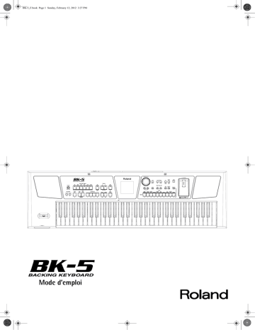 BK-5_F.book Page 1 Sunday, February 12, 2012 3:27 PM Mode d’emploi r BK-5_F.book Page 2 Sunday, February 12, 2012 3:27 PM AVERTISSEMENT – Pour réduire le risque d’incendie ou d’électrocution, n’exposez pas cet appareil à la pluie ou à l’humidité. PourFor les EU pays de l’UE Countries This product complies with the requirements of European Directive EMC 2004/108/EC. Pour les Etats-Unis For the USA FEDERAL COMMUNICATIONS COMMISSION RADIO FREQUENCY INTERFERENCE STATEMENT This equipment has been tested and found to comply with the limits for a Class B digital device, pursuant to Part 15 of the FCC Rules. These limits are designed to provide reasonable protection against harmful interference in a residential installation. This equipment generates, uses, and can radiate radio frequency energy and, if not installed and used in accordance with the instructions, may cause harmful interference to radio communications. However, there is no guarantee that interference will not occur in a particular installation. If this equipment does cause harmful interference to radio or television reception, which can be determined by turning the equipment off and on, the user is encouraged to try to correct the interference by one or more of the following measures: — Reorient or relocate the receiving antenna. — Increase the separation between the equipment and receiver. — Connect the equipment into an outlet on a circuit different from that to which the receiver is connected. — Consult the dealer or an experienced radio/TV technician for help. This device complies with Part 15 of the FCC Rules. Operation is subject to the following two conditions: (1) This device may not cause harmful interference, and (2) This device must accept any interference received, including interference that may cause undesired operation. Unauthorized changes or modification to this system can void the users authority to operate this equipment. This equipment requires shielded interface cables in order to meet FCC class B Limit. Pour Canada ForleCanada NOTICE This Class B digital apparatus meets all requirements of the Canadian Interference-Causing Equipment Regulations. AVIS Pour la Californie (Proposition 65) For C.A. US (Proposition 65) WARNING This product contains chemicals known to cause cancer, birth defects and other reproductive harm, including lead. Pour le Royaume Uni For the U.K. IMPORTANT: THE WIRES IN THIS MAINS LEAD ARE COLOURED IN ACCORDANCE WITH THE FOLLOWING CODE. NEUTRAL BLUE: BROWN: LIVE As the colours of the wires in the mains lead of this apparatus may not correspond with the coloured markings identifying the terminals in your plug, proceed as follows: The wire which is coloured BLUE must be connected to the terminal which is marked with the letter N or coloured BLACK. The wire which is coloured BROWN must be connected to the terminal which is marked with the letter L or coloured RED. Under no circumstances must either of the above wires be connected to the earth terminal of a three pin plug. Pour les ForEtats-Unis the USA DECLARATION OF CONFORMITY Compliance Information Statement BK-5 Backing Keyboard BK-5_F.book Page 3 Sunday, February 12, 2012 3:27 PM r ENGLISH Mode d’emploi ENGLISH Félicitations et merci d’avoir opté pour le BK-5 Backing Keyboard Roland. Pour profiter au mieux des possibilités de votre BK-5, veuillez lire attentivement ce mode d’emploi. Remarques concernant ce manuel Conventions en vigueur dans ce manuel • • • • ENGLISH Commencez par lire le chapitre “Avant d’utiliser le BK-5” à la p. 16. Il explique comment brancher l’adaptateur secteur et mettre l’instrument sous tension. Ce mode d’emploi explique tout, depuis les opérations élémentaires sur le BK-5 jusqu’aux fonctions les plus avancées. Pour expliquer les opérations aussi clairement que possible, ce manuel utilise les conventions suivantes: Le nom des boutons et des commandes est entre crochets droits [ ]. Exemple: le bouton [MENU]. Les paragraphes commençant par “Remarque” sont des remarques qu’il faut lire. Les paragraphes commençant par “MEMO” contiennent des informations utiles pouvant venir à point. Les numéros de page renvoyant à une page de référence sont indiqués ainsi: (p. **). Avant d’utiliser cet instrument, lisez attentivement les sections “Consignes de sécurité” à la p. 4 et “Remarques importantes” à la p. 6. Elles contiennent des informations importantes pour une utilisation correcte du BK-5. Pour maîtriser correctement chaque fonction de votre nouvelle acquisition, veuillez lire entièrement le mode d’emploi. Conservez ensuite le mode d’emploi à portée de main pour toute référence ultérieure. Copyright © 2011 ROLAND EUROPE. Tous droits réservés. Toute reproduction intégrale ou partielle de cette publication est interdite sous quelque forme que ce soit sans l’autorisation écrite de Roland Europe S.p.a. Roland et GS sont des marques déposées ou des marques commerciales de Roland Corporation aux Etats-Unis et/ou dans d’autres pays. ENGLISH Les explications fournies dans ce manuel sont accompagnées d’illustrations indiquant ce qui apparaît à l’écran. Notez toutefois que votre produit peut contenir une version plus récente du système (proposant de nouveaux sons, par exemple); dans ce cas, ce que vous voyez à l’écran peut différer de ce qui apparaît dans ce manuel. BK-5_F.book Page 4 Sunday, February 12, 2012 3:27 PM Backing Keyboard BK-5 Consignes de sécurité CONSIGNES DE SECURITÉ INSTRUCTIONS POUR LA PREVENTION D'INCENDIE, CHOC ÉLECTRIQUE OU BLESSURE A propos des symboles Avertissement et Précaution Sert aux instructions destin es alerter l’utilisateur d’un risque mortel ou de AVERTISSEMENT blessure grave en cas d’utilisation incorrecte de l’unit . Sert aux instructions destin es alerter l’utilisateur d’un risque de blessure ou de dommage mat riel en cas d’emploi incorrect de l’