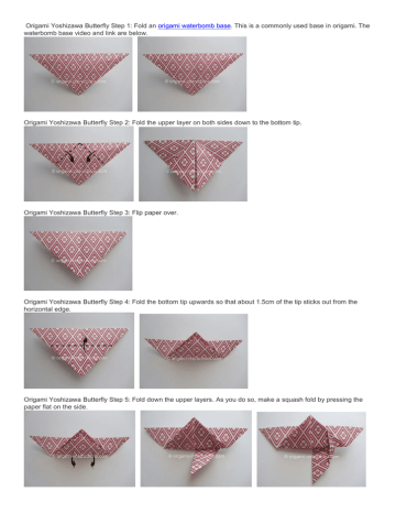 Origami Yoshizawa Butterfly Step 1: Fold an origami waterbomb base. This is a commonly used base in origami. The waterbomb base video and link are below. Origami Yoshizawa Butterfly Step 2: Fold the upper layer on both sides down to the bottom tip. Origami Yoshizawa Butterfly Step 3: Flip paper over. Origami Yoshizawa Butterfly Step 4: Fold the bottom tip upwards so that about 1.5cm of the tip sticks out from the horizontal edge. Origami Yoshizawa Butterfly Step 5: Fold down the upper layers. As you do so, make a squash fold by pressing the paper flat on the side. Origami Yoshizawa Butterfly Step 6: Flip paper over. Origami Yoshizawa Butterfly Step 7: Fold down the tip. Origami Yoshizawa Butterfly Step 8: Now fold up the tip. This forms thebutterfly's "head". Origami Yoshizawa Butterfly Step 9: Fold paper in half by making a mountainfold. Origami Yoshizawa Butterfly Step 10: Make a diagonal fold. Origami Yoshizawa Butterfly Step 11: Flip paper over and repeat Step 10 on the other side to complete forming the "wings". and your Origami Yoshizawa Butterfly is complete!