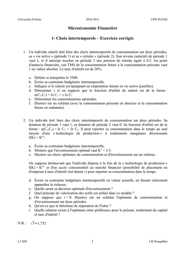Université d'Artois 2010-2011 UFR EGASS Microéconomie Financière 1- Choix intertemporels – Exercices corrigés 1. Un individu salarié doit faire des choix intertemporels de consommation sur deux périodes, sa « vie active » (période 1) et sa « retraite » (période 2). Son revenu (salarial) de période 1 vaut 1, et il anticipe toucher en période 2 une pension de retraite égale à 0,5. Au point d'autarcie financière, son TMS de la consommation future à la consommation présente vaut 1 en valeur absolue. Le taux d'intérêt est de 20%. a. b. c. d. Définir et interpréter le TMS. Écrire sa contrainte budgétaire intertemporelle. Indiquer si le salarié est épargnant ou emprunteur durant sa vie active (justifier). Déterminer x si on suppose que la fonction d'utilité du salarié est de la forme : u(C1,C2) = ln C1 + x ln C2 e. Déterminer les consommations optimales. f. Illustrer sur un schéma (avec la consommation présente en abscisse et la consommation future en ordonnée). 2. Un individu doit faire des choix intertemporels de consommation sur deux périodes. Sa dotation de période 1 vaut 1, sa dotation de période 2 vaut 0. Sa fonction d'utilité est de la forme : u(C1,C2) = ln C1 + ln C2. Il peut reporter sa consommation dans le temps au seul moyen d'une « technologie de production » à rendements marginaux décroissants f(K) = K0,5. a. Écrire sa contrainte budgétaire intertemporelle. b. Montrer que l'investissement optimal vaut K* = 1/3. c. Illustrer ses choix optimaux de consommation et d'investissement sur un schéma. On suppose dorénavant que l'individu dispose à la fois de la « technologie de production » f(K) = K0,5 et d'un accès concurrentiel au marché financier (possibilité de placement ou d'emprunt à taux d'intérêt réel donné r) pour reporter sa consommation dans le temps. d. Écrire sa contrainte budgétaire intertemporelle en valeur actuelle, en faisant clairement apparaître la richesse. e. Quelle serait sa décision optimale d'investissement ? f. Quel principe de valorisation des actifs est utilisé dans ce modèle ? g. On suppose que r = 0. Illustrez sur un schéma l'optimum de consommation et d'investissement sur deux périodes. h. Qu'est-ce que le théorème de séparation de Fisher ? i. Quelle relation existe à l'optimum entre préférence pour le présent, rendement du capital et taux d'intérêt ? N.B. : L3 SEF 3≈1,732 1 J-B Desquilbet Université d'Artois 2010-2011 UFR EGASS Solution : 1a) Le TMS (taux marginal de substitution) de la consommation future à la consommation présente est la pente, en un point donné, d'une courbe d'indifférence dans la plan (consommation présente, consommation future). Il indique le nombre d'unités de « biens futurs » que le décideur est prêt à échanger contre une unité de « bien présent » en ce point. Il s'agit donc du prix subjectif du bien présent en termes de biens futurs. Ici, au point d'autarcie financière, le salarié est prêt à échanger un « bien futur » contre un « bien présent ». b) La contrainte budgétaire intertemporelle indique que la valeur actuelle des ressources présentes et futures doit être égale à la valeur actuelle des emplois futurs et présents. Soit C C 17 0,5 ici : 1 =C 1 2 =C 1 2 soit 12 1,2 1,2 1,2 c) Ici, au point d'autarcie financière, le salarié est prêt à échanger un « bien futur » contre un « bien présent ». Or, le marché financier lui permet d'obtenir 1,2 unités de « bien futur » pour une unité de « bien présent ». Le salarié estime donc que le « bien présent » est « cher », il en offre, et que le bien « futur » est « bon marché », il en demande. Ainsi, le salarié épargne durant sa vie active. d) Avec une fonction d'utilité de la forme u(C1,C2) = ln C1 + x ln C2 le TMS de la −u 1 ' −C 2 = consommation future à la consommation présente vaut . Au point d'autarcie u2 ' x C1 0,5 =1 soit x= 0,5. financière C1 = 1 et C2 = 0,5 et le TMS vaut -1. On en déduit x e) En maximisant l'utilité sous contrainte budgétaire intertemporelle, on montre que les 1 17 x 17 x 17 = consommations optimales valent C 1= et C 2=1,2 .Avec x= 1x 12 1x 12 1x 10 17 17 0,5 : C 1= ≈0,944 et C 2= ≈0,567 . NB : le salarié épargne 1/18. 18 30 f) C2 Optimum de consommation C2* autarcie C1* L3 SEF C1 2 J-B Desquilbet Université d'Artois 2010-2011 UFR EGASS 2a) La contrainte budgétaire intertemporelle résulte de la combinaison des contraintes budgétaires des deux périodes : C1 + K = 1 et C2 = f(K) + 0 soit C2 = K0,5. En substituant K = 1 – C1 dans la deuxième égalité, on obtient : C2 = (1 – C1)0,5. Ici, il n'y a pas de marché financier, donc pas d'actualisation possible de ressources futures... b) Par substitution. On remplace C1 par 1 – K et C2 par K0,5 dans la fonction d'utilité, soit u(1 – K, K0,5) = ln (1 – K) + ln K0,5 . La condition de premier ordre (dérivée par rapport à K 1 0,5 =0 d'où on tire K* = 1/3. nulle) donne : 1−K K c) Avec K* = 1/3, on a : C1* = 2/3 et C2* = 1/ 3≈0,577 . d) La contrainte budgétaire intertemporelle en valeur actuelle s'écrit : 0,5 C2 K C 1 =1 −K , le deuxième membre étant la richesse (somme actualisée des 1r 1r dotations plus valeur actuelle nette de l'investissement). e) L'investissement optimal maximise la richesse : la condition de premier ordre de 0,5 −0,5 1 * K K maximisation de 1 −K donne 0,5 −1=0 soit K = 2 . 41r 1r 1r f) Le principe de valorisation des actifs utilisé dans ce modèle est le théorème du capitalvaleur de Fisher, selon lequel la valeur d'un actif est égale à la somme actualisée des revenus qu'ils génère. g) Avec r = 0, K* = 1/4, la richesse vaut 5/4, C1* = C2* = 5/8. On remarque que l'individu épargne 1 – K* – C1* = 1/8. h) Le théorème de séparation de Fisher est le résultat selon lequel un marché financier parfait permet la séparation des décisions de consommation et d'investissement. En l'absence de marché financier 