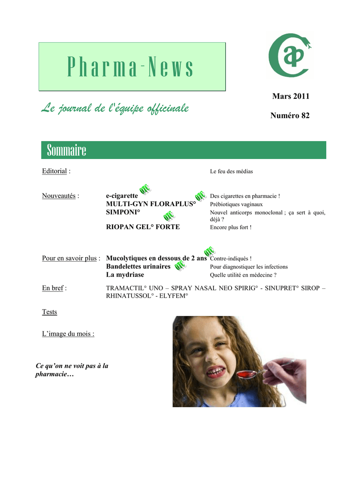 Pharma-News Mars 2011 Le journal de l'équipe officinale Numéro 82 Sommaire Editorial : Nouveautés : Le feu des médias e-cigarette MULTI-GYN FLORAPLUS° SIMPONI° RIOPAN GEL° FORTE Des cigarettes en pharmacie ! Prébiotiques vaginaux Nouvel anticorps monoclonal ; ça sert à quoi, déjà ? Encore plus fort ! Pour en savoir plus : Mucolytiques en dessous de 2 ans Contre-indiqués ! Bandelettes urinaires Pour diagnostiquer les infections La mydriase Quelle utilité en médecine ? En bref : TRAMACTIL° UNO – SPRAY NASAL NEO SPIRIG° - SINUPRET° SIROP – RHINATUSSOL° - ELYFEM° Tests L’image du mois : Ce qu’on ne voit pas à la pharmacie… Editorial Ces médicaments qui font peur Ces derniers temps, les médicaments ont beaucoup été sous le feu des médias : le scandale du Mediator°, les craintes des effets à long terme des anti-inflammatoires et j’en passe. Certains médicaments font peur, mais les médias aussi font peur ! Ce n’est un secret pour personne : la crainte de la population fait vendre ou au moins lire les journaux. En tant que pharmaciens, nous avons également peur : de voir disparaître des remèdes utiles parce que les médias les auront descendus en flammes et réclamé à grands titres leur retrait du commerce. De tout temps, les effets secondaires et contre-indications ont été remis à jour, pesés, évalués. Des revues critiques sont à disposition des professionnels de la santé pour rester vigilants et assurer une bonne prescription ou une bonne remise des médicaments. C’est justement le but du Pharma-News : vous aider à mieux connaître et conseiller les médicaments. Ainsi, nous espérons que des spécialités utiles mais présentant certains risques, comme le ROACCUTAN°, resteront sur le marché, car bien prescrits et remis avec les informations nécessaires. Bonne lecture ! Jérôme Berger Séverine Huguenin Pierre Bossert Julia Farina Caroline Mir Marie-Thérèse Guanter Germanier Martine Ruggli Nouveautés E-CIGARETTE, CIGARETTE ÉLECTRONIQUE OU ÉLECTRIQUE Pour autant qu’elles ne contiennent pas de nicotine, les e-cigarettes (cigarettes électroniques ou électriques) sont maintenant autorisées à la commercialisation en Suisse, en vente notamment dans certaines pharmacies 1. Toutefois, mentionnons que l’importation de cartouches contenant de la nicotine pour usage privé est autorisée en Suisse ; celles-ci pouvant être p.ex. commandées via Internet 1. Il s’agit d’un dispositif ressemblant à une cigarette traditionnelle et constitué de trois parties : - un accu rechargeable avec à son extrémité une diode luminescente qui s’allume à chaque fois 1 Bulletin OFSP 42/2010; Lettre d'information n° 146 (p. 935-38) © Pharma-News page 2 Numéro 82, mars 2011 - que l’on aspire et mime l'embout d’une cigarette un vaporisateur dans lequel est chauffé un liquide aromatisé qui se transforme en vapeur avant d'être inspiré. Lors de l’expiration, la vapeur entre en contact avec l’air plus froid et se condense en formant un brouillard, ce qui simule la fumée d’une cigarette un filtre dans lequel est logé le « dépôt d’arôme », un liquide aromatisé imbibé sur un morceau de ouate ; ce liquide ne contient pas de nicotine dans la version autorisée en Suisse, mais des composants qui rappellent les goûts des cigarettes. Il est possible d’arrêter et de ranger l’e-cigarette à tout moment, puisqu’il n’y pas de chaleur produite. La quantité de liquide dans le filtre permet de "fumer" pendant une durée correspondant environ à dix cigarettes2. D’une manière générale, la cigarette électronique est présentée par les fabricants comme une solution censée aider les fumeurs à arrêter de fumer. L’OMS et les associations antitabac ne sont pas du tout d’accord et estiment même que cet outil sabote leurs stratégies de lutte contre le tabac 3. A noter que l’OFSP a lancé de son côté au début de l’année une nouvelle campagne médiatique baptisée « SmokeFree », dont les messages positifs mettent en évidence les avantages d’une vie sans tabac et incitent à ne pas fumer 4. Il n’y a actuellement aucune preuve scientifique de l’intérêt de ce dispositif dans le sevrage tabagique. D’autant plus avec la version sans nicotine ! D’un point de vue thérapeutique, il semble difficile d’imaginer un sevrage sans substitut (patch ou gomme à mâcher p.ex.), pour une substance aussi addictive que la nicotine. Cela pourrait être envisagé comme solution chez les fumeurs qui ne sont pas (ou plus) dépendants à la nicotine mais qui restent "accros" au geste de fumer. En Suisse, la cigarette électronique n’est pas considérée comme un produit thérapeutique, ni comme un dispositif médical. On la trouve donc en vente sur Internet par exemple. Etant donné qu’il n’y a pas de combustion, elle n’est pas non plus assimilée à un succédané de tabac. Elle est présentée plutôt comme un moyen de "fumer" sans s’intoxiquer et importuner son entourage. A noter que le gouvernement a tout de même décidé de la taxer comme les cigarettes… Il n’y a pas de petits profits ! Il est correct de soulever qu’avec l’e-cigarette, il n’y a pas de combustion, donc pas de résidus de combustion toxiques inhalés (pour rappel, dans les cigarettes, ces produits sont entre autres 2 www.ifeel-free.ch/fr/ http://www.tsr.ch/info/sciences-tech/2710114-la-cigarette-electronique-une-idee-fumeuse.html 4 http://www.bag.admin.ch/themen/drogen/00041/00617/index.html?lang=fr 3 © Pharma-News page 3 Numéro 82, mars 2011 responsables de l'augmentation des risques de cancer). Par contre, le liquide aromatisé contenu dans les filtres contient diverses substances additives potentiellement toxiques lorsqu’elles sont inhalées, p.ex. propylène glycol, gycérol, menthol. Pour obtenir l’autorisation de commercialisation en Suisse, les distributeurs (y.c. les pharmacies) doivent garantir que les substa