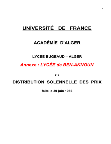 1 UNİVERSİTÉ DE FRANCE ACADÉMİE D’ALGER LYCÉE BUGEAUD – ALGER Annexe : LYCÉE de BEN-AKNOUN DİSTRİBUTİON SOLENNELLE DES PRİX faite le 30 juin 1956 1 2 CONSEİL D’ADMİNİSTRATİON M. le Recteur de l’Académie d’Alger M. le Préfet du Département d’Alger M. l’Inspecteur d’Académie d’Alger M. le Maire de la Commune d’El Biar M. le Proviseur du Lycée Bugeaud M. le Directeur de l’Annexe Ben-Aknoun M. l’Intendant Universitaire du Lycée Bugeaud M. BARTOLI, Surveillant Général à l’Annexe Ben-Aknoun M. BECK, Econome à l’Annexe Ben-Aknoun M. REGARD, Président de l’Association des Parents d’élèves Mlle DESPOIS – MM. CAMPS – LEBLAYS – SOLDERMANN, Professeurs à l’Annexe Ben-Aknoun M. ROGNON, Adjoint d’Enseignement à l’Annexe Ben-Aknoun 2 3 PERSONNEL DU LYCÉE BUGEAUD ANNEXE DE BEN AKNOUN ADMİNİSTRATİON Proviseur : M. FRESNEAU, Chevalier de la Légion d’Honneur, O.İ. – Chevalier du Mérite Agricole, Officier Ouissam Alaouite Chérifien Médaille d’Or en Education Physique et Sportive Directeur : M. THİBAULT-CHAMBAULT, Chevalier de la Légion d’Honneur, Croix de Guerre, O.A. Intendant Universitaire : M. DOUMENC, Croix de Guerre 1914-1918, Médaille de la Résistance HONORARİAT Surveillant Général : M. AİLLİÈS, O.İ. Professeurs : M. DENAT, O.İ. M. SAUTİN, Chevalier de la Légion d’Honneur, Croix de Guerre 1914-1918, O.İ. ENSEİGNEMENT Mathématiques : MM. EYCHENNE – MOLİNA – Mlle PÉRALDİ, O.A. Sciences Physiques : Mme MASSE, O.A. – M. GRECK Science Naturelles : Mme TROUVE - Mlle PÉRALDİ – M. LEMAÎTRE Lettres et Grammaire : MM. CHAUVEAU – DEPASSE – GANDİÉ, Croix de Guerre, O.A. – LEBLAYS, Croix de Guerre – Mme MAGNET – MM. MALTİ – MAMMERİ – OU SAÂDA, O.A. – SANNEQUİN – SEVİN Histoire et Géographie : MM. ADOLPHE – CHAMPETİER – LAÏK – NOËL Allemand : MM. MOËS – MALGOİRE – MAS Anglais : Mmes ALBOU – BEAUFRÈRE – MAGNET – MM. İSNARD – ROGNON, Croix de Guerre Arabe : MM. DJEDOU, O.A. – LAMON, O.İ. – RİCHERT – STAMBOULİ, O.İ. İtalien : Mlle DESPOİS, O.İ. Dessin : M. FREDOUİLLE, O.İ. Éducation Musicale : M. GÉRARD 3 4 Éducation Physique : MM. SOLDERMANN, Professeur, Médaille d’Argent, O. A. – WALTER, Professeur, Médaille de Bronze – FARRUGİA, Maître d’E.P., Médaille de Bronze – HARTMANN, Maître d’E. P., Médaille de Bronze Surveillants Généraux : MM. BARTOLİ, Croix de Guerre, O.A. – PUCCİNELLİ, O.A. Économe Chargé des fonds de S/Intendant : M. BECK Adjoints d’Enseignement : MM. ADOLPHE –. GRECK – İSNARD – LAMON – Mme MAGNET – MM. MALGOİRE – ROGNON – Mlle RİCHERT – MM. SANNEQUİN – STAMBOULİ Maîtres Auxiliaires : Mme ALBOU – MM. GÉRARD – MAS – MOLİNA Dame-Secrétaire : Mlle AGOSTİNİ Dactylographe – Ronéotypiste : Mlle OLİVARÈS Maîtres d’Internat : MM. ABDALLAH – ACHOUCHE – ATTALİ – BELKACEM – BENDJABALLAH – BENMAHMOUD – BENZİADA – BOUMAZA – BOUSTİLA – ELGUEZ – GALLEGO – MAÏBORODA – MEDEGHERİ – NOUGUÈSANS – PERLÈS – SEMPÈRÉ – SİLHADİ – TAYEBİ – VİLLEGAS – ZERROUKİ Maître d’Externat : M. SANCHEZ CULTES ET ENSEİGNEMENTS RELİGİEUX Aumôniers Catholiques : M. l’Abbé ARÈNE Aumônier Protestant : M. le Pasteur LENHARDT Iman : M. DJİLLALİ Abderrahmane Rabbin : M. ABİB SERVİCES AUXİLİAİRES Médecin d’Internat : M. le Dr. LÉONARDON Médecin Examinateur : Mme le Dr. CAUSSİGNAC Assistante Sociale : Mlle FERRİER Assistant Médical : M. BOZİO 4 5 PRİX DE FONDATİONS ET PRİX OFFERTS PRİX D’HONNEUR DE LA VİLLE D’EL BİAR décerné à l’élève qui, à tous égards, a satisfait à tous ses Devoirs : GOUYGOU Charles – 4ème B2 PRİX DE LA VİLLE D’ALGER décerné à l’élève du second cycle ayant accompli les Progrès les plus remarquables au cours de l’année : LEROY Alain – 1ère B PRİX OFFERT PAR MONSİEUR LE RECTEUR DE L’ACADÉMİE D’ALGER Attribués aux élèves qui se sont le plus distingués dans l’étude de la Langue Arabe : OUNOUGHÈNE Nour – 1ère B HAFFAR Ahmed – 4ème M1 FARDJALLAH Ahmed – 6ème M1 PRİX CHARLES DE GALLAND Offert par l’association des anciens élèves, afin de perpétuer la mémoire de M. Charles de GALLAND leur ancien Président et ancien Directeur de l’annexe Ben-Aknoun à l’élève qui, par sa conduite, sa tenue, ses manières, a le mieux mérité l’Estime Générale : SMAÏL Messaoud – 1ère M2 PRİX DU DOCTEUR SALİÈGE Offert par le Docteur et Madame GAUTHİER-SALİÈGE, en souvenir du Docteur ancien médecin de l’annexe, à l’élève qui s’est le plus distingué dans l’étude des Lettres : GUİMET Germain – 4ème A PRİX FERRANDO Offert par M. FERRANDO, Maire d’El-Biar, à l’élève de Première qui s’est le plus distingué dans l’étude des Sciences : JAYEZ Pierre – 1ère C PRİX DE L’ASSOCİATİON GUİLLAUME BUDE Offert à deux élèves de Première qui ont manifesté le plus d’attachement désintéressé à la Culture : Mlle RİCHERT Ghislaine – 1ère B HOCİNE Rezki – 1ère C 5 6 PRİX DE LA CHAMBRE DE COMMERCE Offert à l’élève des classes du Second Cycle qui s’est le plus distingué dans l’étude de la Géographie : NADİR Mohammed – 2ème M2 PRIX DE L’ASSOCIATION DES PARENTS D’ÉLÈVES Offert à un élève méritant de chaque classe : MAHİOU Ahmed – 1ère M1 Mlle BARTOLİ Fanny – 2ème B Mlle CZESKLEBA Waltraud – 3ème A JAYEZ Jacques Henri – 4ème A Mlle CAPECCHİ Marcelle – 5ème M2 TAUFER Serge – 6ème M1 Prix spécial également offert par l’association des parents d’élèves, à l’élève le plus méritant du Premier Cycle : Mlle LEMPREUX Marie-France – 6ème A2 PRIX DE L’İNSTİTUT PASTEUR Offert à l’élève qui a mérité les meilleures notes en Histoire Naturelle : MOUCHAN Jean – 4ème A PRIX ALBERT TUSTES Offert par Madame TUSTES, en souvenir de son fil