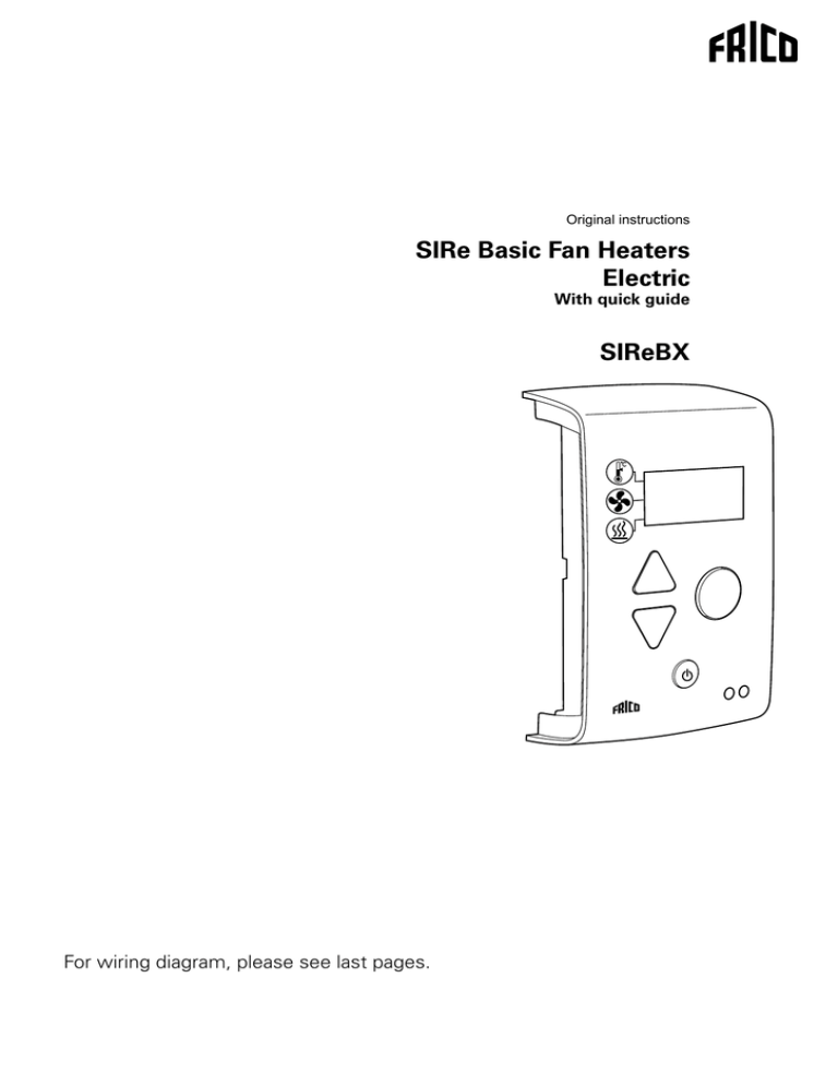 Original instructions SIRe Basic Fan Heaters Electric With quick guide SIReBX C For wiring diagram, please see last pages. FR SIRe Basic Aérothermes électriques Guide pratique / Démarrage Vérifiez la présence de l’ensemble des pièces constitutives du produit (voir la section Pièces constitutives). Emplacement recommandé L’unité de contrôle SIReUB1 est dotée d’une sonde de température ambiante intégrée et est installée de manière à permettre un accès aisé par l'utilisateur. Le câblage entre la carte électronique de Base SIReB1X et l’aérotherme doit permettre une alimentation de 230 V. Des câbles modulaires RJ12 (6p/6c), disponibles en différentes longueurs, sont utilisés pour connecter la carte électronique et l'unité de contrôle. Des câbles plus longs sont disponibles en option. Pour connaître les longueurs maximales de câble, voir la section Options. Afin d’empêcher l’accès de personnes non autorisées à l’unité de contrôle, celle-ci peut être installée à un autre endroit. Une sonde de température déportée, SIReRTX (en option), peut alors être placée dans le local afin de mesurer la température. Remarque : La sonde intérieure SIReIT02 doit être montée dans l’évacuation de ventilation située dans l’aérotherme. Il convient de l’installer dans le support prévu à cet effet. Raccordement du système Avec le carte électronique de BaseSIReB1X, l’unité est également raccordée à l’aide d’un câble modulaire RJ12 (6p/6c) dans le cas où la connexion de plusieurs unités en parallèle est requise. En cas d’utilisation d'une sonde de température ambiante déportée SIReRTX, celle-ci est raccordée à l'aide d'un câble modulaire RJ11 (4p/4c) sur la carte de Base SIReB1X. La carte électronique de Base SIReB1X, située dans ou à proximité de l’unité, et l’unité de contrôle SIReUB1 sont connectées à l’aide d’un câble modulaire RJ12 (6p/6c). L’alimentation du chauffage électrique doit être raccordée séparément (consultez le manuel relatif à l'aérotherme). 30 Schémas de raccordement Le schéma de câblage est présenté à la fin de ce manuel. Saisie de l’identifiant/Fonctionnement sans unité de contrôle Le système de contrôle peut contrôler une ou plusieurs unités en parallèle (9 au maximum). Chaque unité doit posséder un identifiant unique (1-9), défini dans le sélecteur d’identifiant de la carte électronique. Ex. : Unité 1 : ID=1, unité 2 : ID=3 Si, pour une raison quelconque, le boîtier de commande n’a pas été installé, l’unité peut tout de même fonctionner de manière temporaire. Le sélecteur d’identifiant est alors défini sur le mode 0 (voir le schéma ci-après). L'unité fonctionne à demi-vitesse et à pleine puissance de chauffage. Lorsqu’il est nécessaire de modifier l’identifiant, l’unité doit être débranchée du secteur. 3 4 5 6 3 4 5 6 2 7 2 7 1 8 1 8 0 9 0 9 Chaque unité doit posséder un identifiant unique, spécifié sur sa carte SIReB1X. Pour exécuter l’unité temporairement sans boîtier de commande, sélectionnez le mode 0. SIRe Basic Aérothermes électriques FR Démarrage Le système est fourni avec une alimentation. L'écran de contrôle indique brièvement les trois chiffres de la version logicielle, 1.4.0, suivis de trois lignes horizontales. Après environ 30 secondes, la température ambiante dominante est indiquée dans l'écran de contrôle. Après le premier démarrage, les réglages de base suivants sont effectués. Utilisez les flèches vers le haut et vers le bas pour définir la température ambiante, l’étage de ventilation et l’étage de chauffage. Pour modifier un réglage, appuyez sur la touche ronde (confirmation). Le réglage commence à clignoter et peut être ajusté à l’aide de la flèche vers le haut ou vers le bas. Selon les réglages d’usine, le contrôle de la ventilation est manuel et le chauffage est contrôlé par thermostat. Pour connaître les autres réglages possibles, voir la section Modes de fonctionnement. A la première mise en route, des alarmes et des codes d’erreurs peuvent se produire, mais ils peuvent être réinitialisés sans manipulation particulière. SE06-15 SE20 SE30 Étages de ventilation 4 2 2 Étages de chauffage 2 2 3 C Sélection de la température ambiante souhaitée 5 – +30 °C Sélection de l’étage de ventilation 1-5 20 - 3 _ 2 Activation du chauffage 0 = pas de chauffage 1 = étage de chauffage 1 possible 2 = étage de chauffage 2 possible (3 = étage de chauffage 3 possible) suivant modèle Étages de chauffage régulés par thermostat 31 FR SIRe Basic Aérothermes électriques Sommaire Guide pratique / Démarrage Emplacement recommandé 30 Raccordement du système 30 Schémas de raccordement 30 Saisie de l’identifiant/Fonctionnement sans unité de contrôle 30 Démarrage31 Pièces constitutives SIReBX33 Option34 Longueurs max. de câble 34 Modes de fonctionnement Modes de fonctionnement 35 Temporisation de la ventilation 35 Régulation du chauffage 35 Définition des valeurs 35 Marche/Arrêt35 Unité de contrôle SIReUB1 Sélection rapide 36 Explications36 Menu installation Menu des paramètres Description des paramètres 37 37 Codes d’alarme et d’erreur Protection anti-surchauffe Affichage des codes d’alarme et d’erreur Reset alarme 38 38 38 Schémas de raccordement 32 Voir les dernières pages FR SIRe Basic Aérothermes électriques Pièces constitutives SIReBX C SIReUA1, boîtier de commande Basic Cache de finition SIReB1X Carte électronique Basic externe SIReIT02, température intérieure SIReCC, câbles modulaires Dimensions des pièces constitutives Type Désignation SIReUB1 SIRB1X SIReIT02, SIReCC605 SIReB1 Unité de contrôle Carte électronique Base Température intérieure Câble modulaire RJ12(6/6) Carte électronique Base intégrée HxLxP [mm] 120x70x35 L [m] 2 5 33 FR SIRe Basic Aérothermes électriques Option SIReCJ4, pièce d