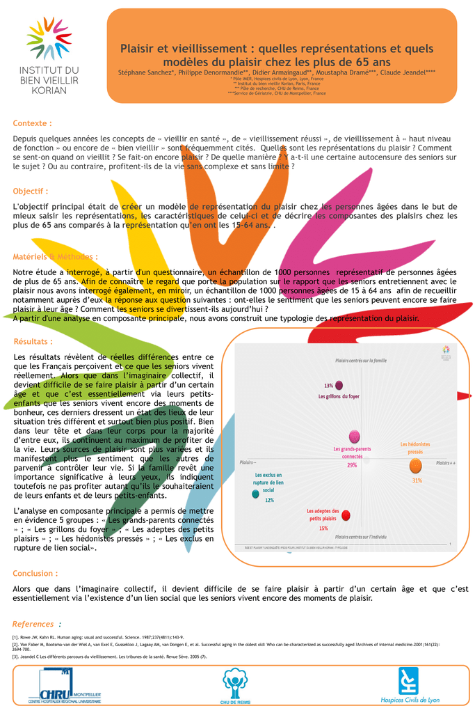 Plaisir et vieillissement : quelles représentations et quels modèles du plaisir chez les plus de 65 ans Stéphane Sanchez*, Philippe Denormandie**, Didier Armaingaud**, Moustapha Dramé***, Claude Jeandel**** * Pôle IMER, Hospices civils de Lyon, Lyon, France ** Institut du bien vieillir Korian, Paris, France *** Pôle de recherche, CHU de Reims, France ****Service de Gériatrie, CHU de Montpellier, France Contexte : Depuis quelques années les concepts de « vieillir en santé », de « vieillissement réussi », de vieillissement à « haut niveau de fonction » ou encore de « bien vieillir » sont fréquemment cités. Quelles sont les représentations du plaisir ? Comment se sent-on quand on vieillit ? Se fait-on encore plaisir ? De quelle manière ? Y a-t-il une certaine autocensure des seniors sur le sujet ? Ou au contraire, profitent-ils de la vie sans complexe et sans limite ? Objectif : L'objectif principal était de créer un modèle de représentation du plaisir chez les personnes âgées dans le but de mieux saisir les représentations, les caractéristiques de celui-ci et de décrire les composantes des plaisirs chez les plus de 65 ans comparés à la représentation qu’en ont les 15-64 ans. . Matériels & Méthodes : Notre étude a interrogé, à partir d'un questionnaire, un échantillon de 1000 personnes représentatif de personnes âgées de plus de 65 ans. Afin de connaître le regard que porte la population sur le rapport que les seniors entretiennent avec le plaisir nous avons interrogé également, en miroir, un échantillon de 1000 personnes âgées de 15 à 64 ans afin de recueillir notamment auprès d’eux la réponse aux question suivantes : ont-elles le sentiment que les seniors peuvent encore se faire plaisir à leur âge ? Comment les seniors se divertissent-ils aujourd’hui ? A partir d'une analyse en composante principale, nous avons construit une typologie des représentation du plaisir. Résultats : Les résultats révèlent de réelles différences entre ce que les Français perçoivent et ce que les seniors vivent réellement. Alors que dans l’imaginaire collectif, il devient difficile de se faire plaisir à partir d’un certain âge et que c’est essentiellement via leurs petitsenfants que les seniors vivent encore des moments de bonheur, ces derniers dressent un état des lieux de leur situation très différent et surtout bien plus positif. Bien dans leur tête et dans leur corps pour la majorité d’entre eux, ils continuent au maximum de profiter de la vie. Leurs sources de plaisir sont plus variées et ils manifestent plus le sentiment que les autres de parvenir à contrôler leur vie. Si la famille revêt une importance significative à leurs yeux, ils indiquent toutefois ne pas profiter autant qu’ils le souhaiteraient de leurs enfants et de leurs petits-enfants. L’analyse en composante principale a permis de mettre en évidence 5 groupes : « Les grands-parents connectés » ; « Les grillons du foyer » ; « Les adeptes des petits plaisirs » ; « Les hédonistes pressés » ; « Les exclus en rupture de lien social». Conclusion : Alors que dans l’imaginaire collectif, il devient difficile de se faire plaisir à partir d’un certain âge et que c’est essentiellement via l’existence d’un lien social que les seniors vivent encore des moments de plaisir. References : [1]. Rowe JW, Kahn RL. Human aging: usual and successful. Science. 1987;237(4811):143-9. [2]. Von Faber M, Bootsma-van der Wiel A, van Exel E, Gussekloo J, Lagaay AM, van Dongen E, et al. Successful aging in the oldest old: Who can be characterized as successfully aged ?Archives of internal medicine.2001;161(22): 2694-700. [3]. Jeandel C Les différents parcours du vieillissement. Les tribunes de la santé. Revue Sève. 2005 (7).